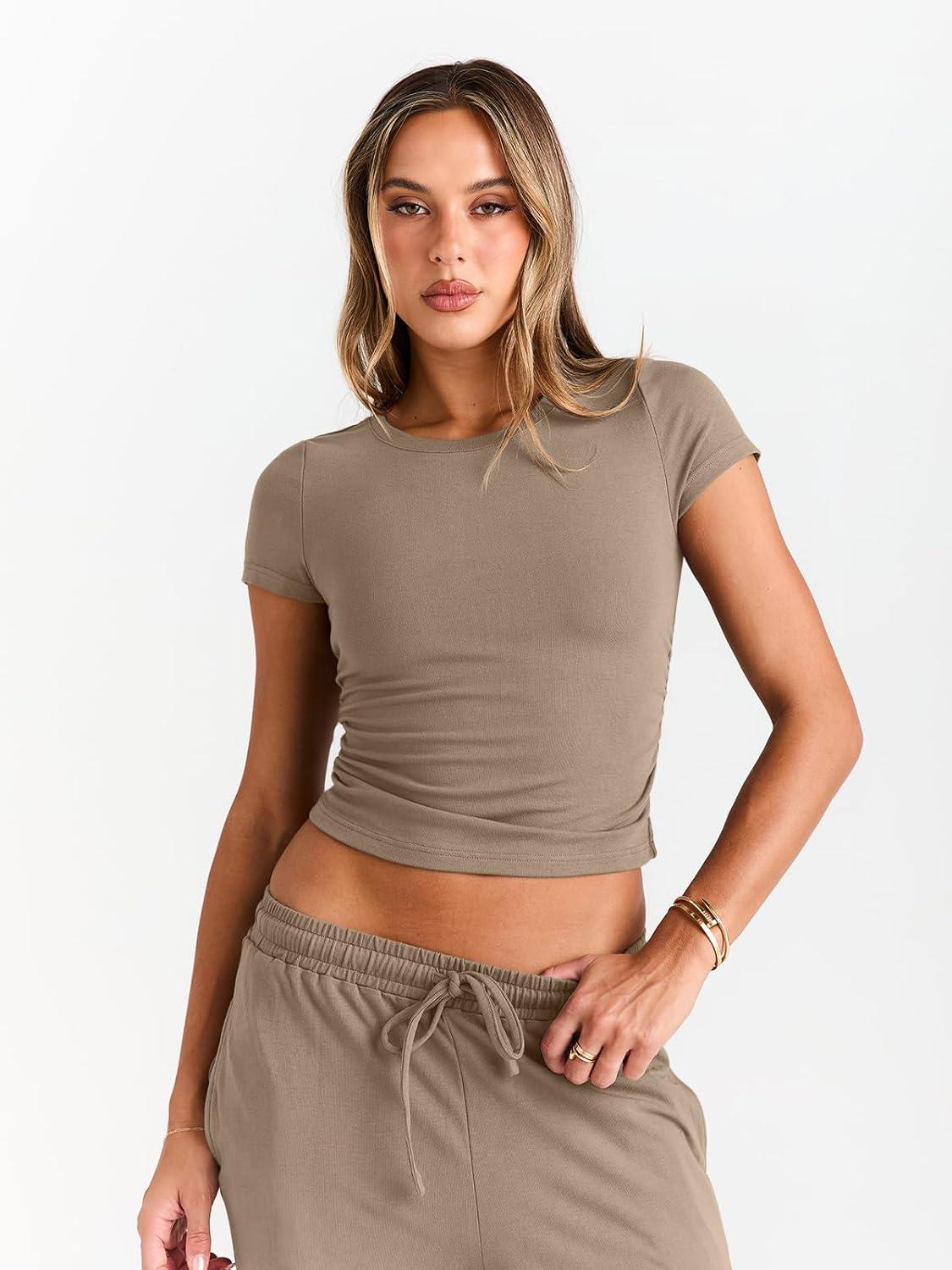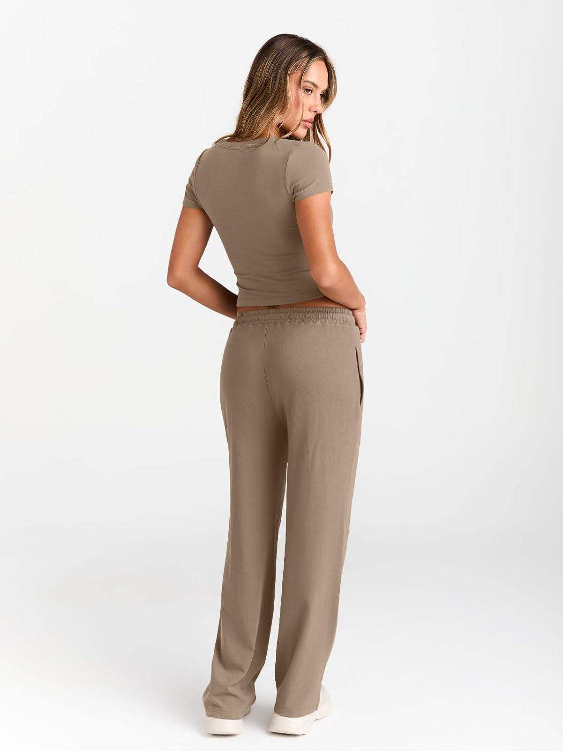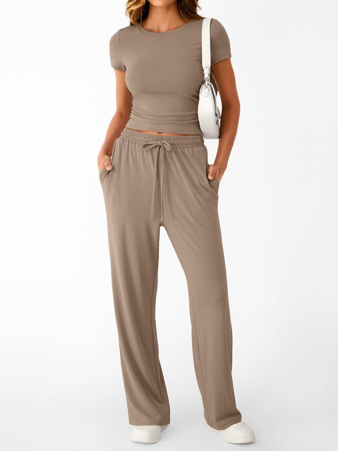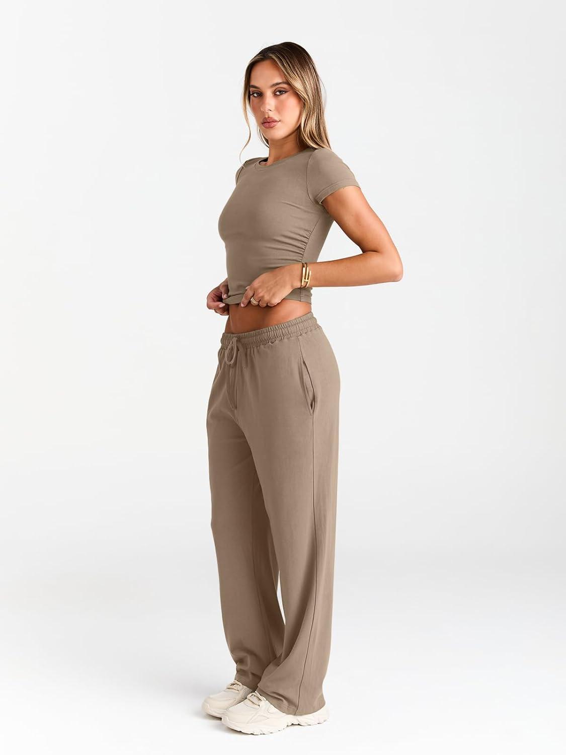 Trendy Queen 2 Piece Matching Summer Sweatsuit Lounge Set Womens Wide Leg Pants Side Ruching Crop Top Sets(Khaki)
