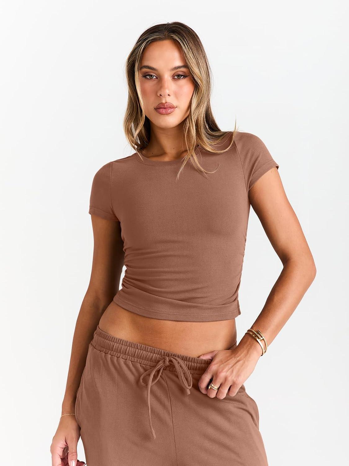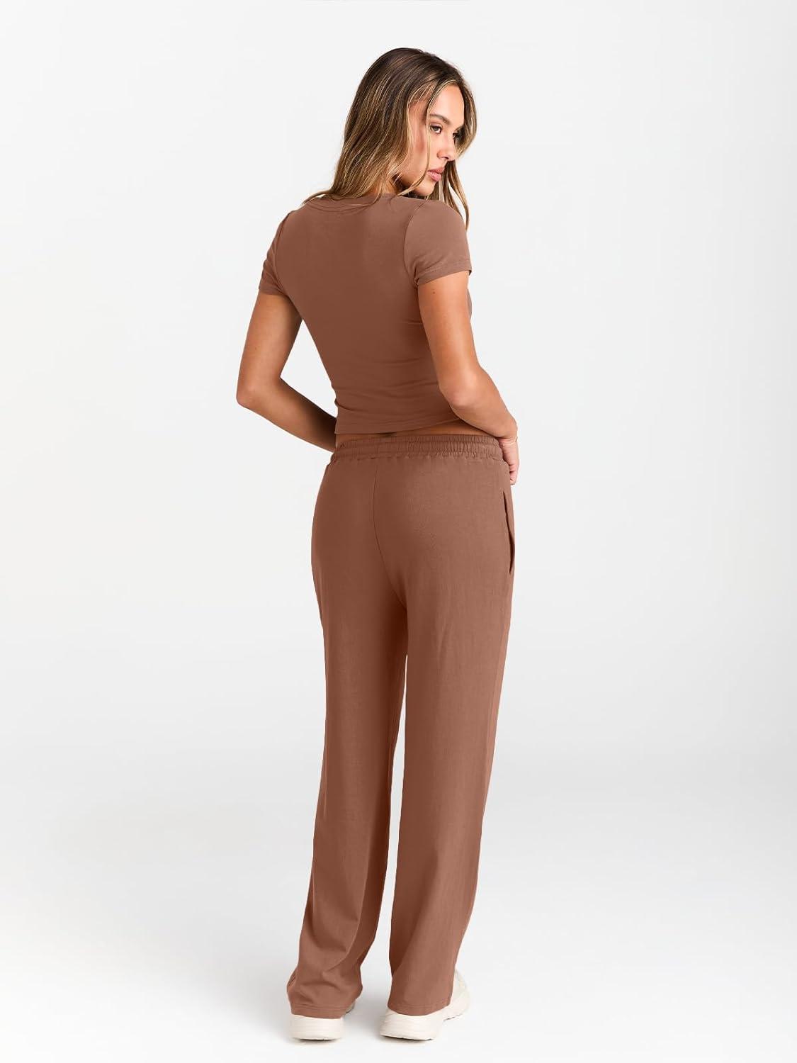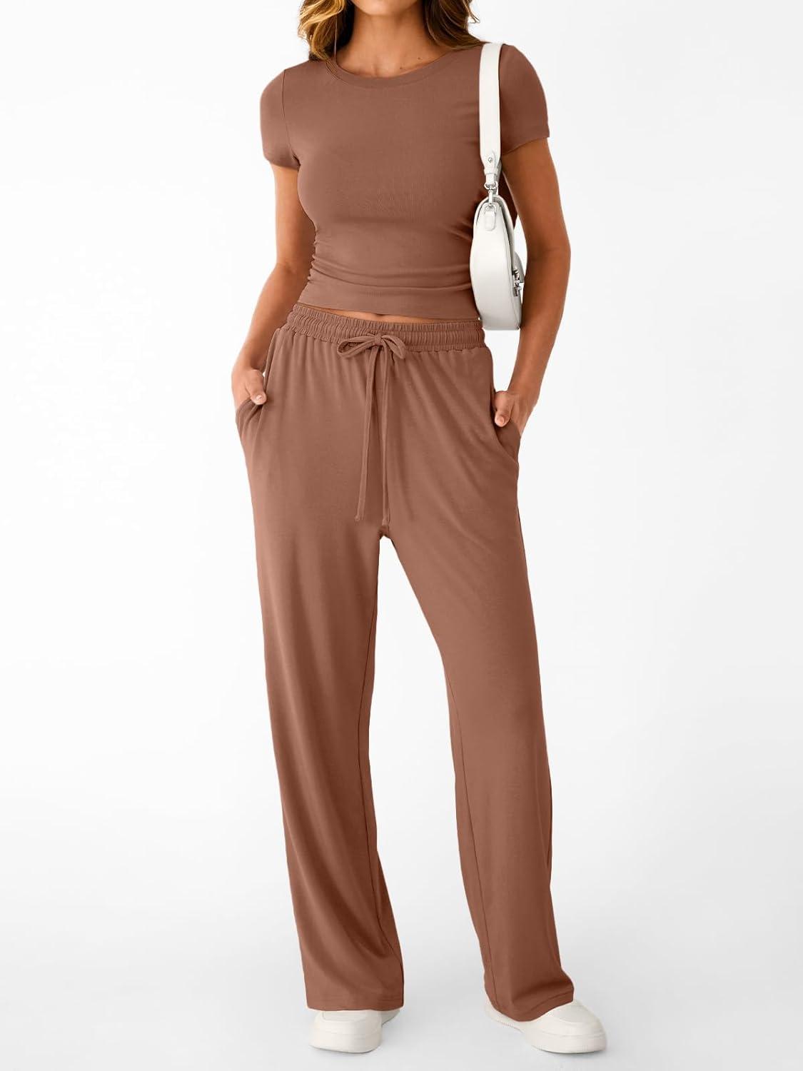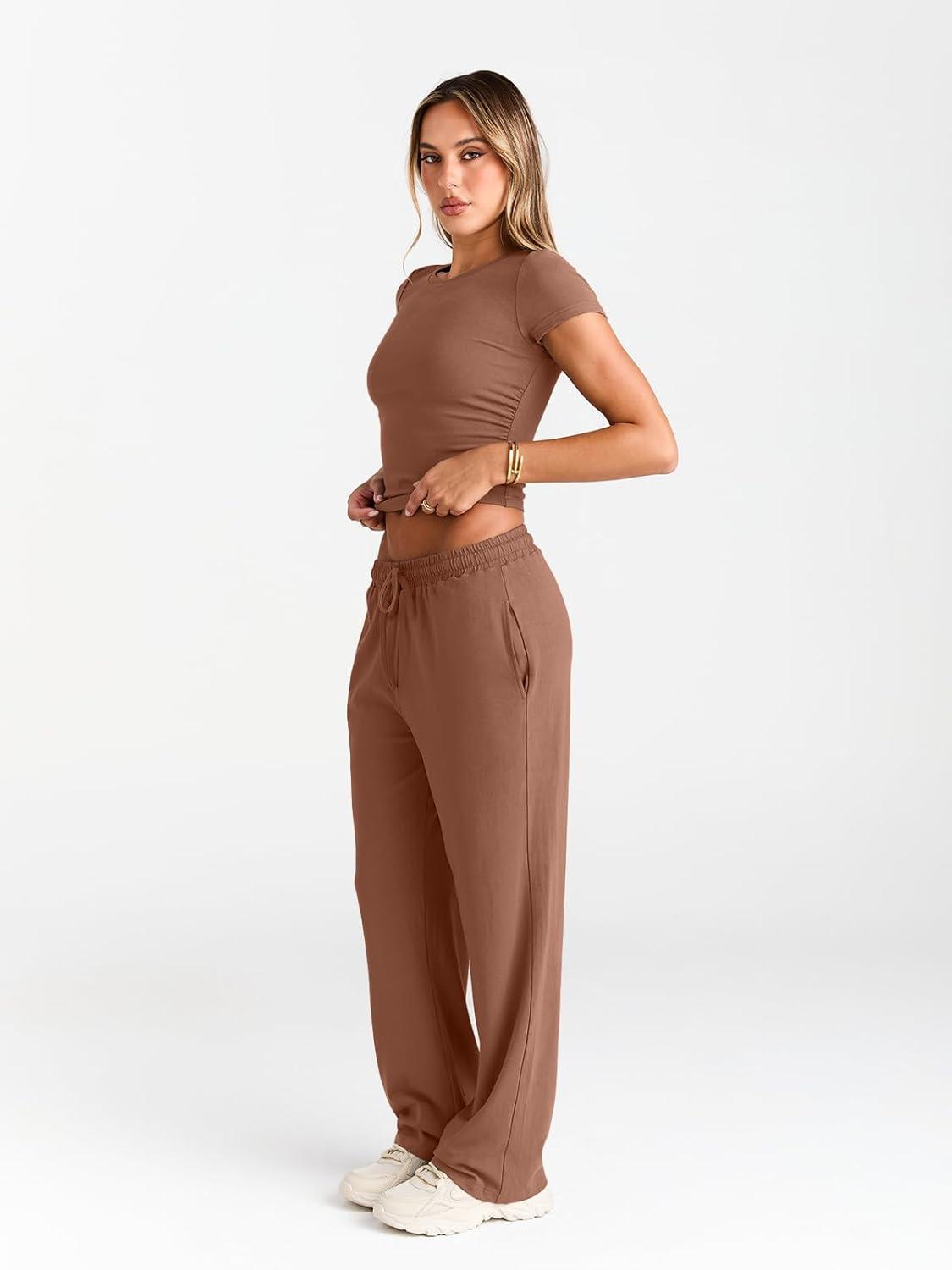 Trendy Queen 2 Piece Matching Summer Sweatsuit Lounge Set Womens Wide Leg Pants Side Ruching Crop Top Sets(Toffee)