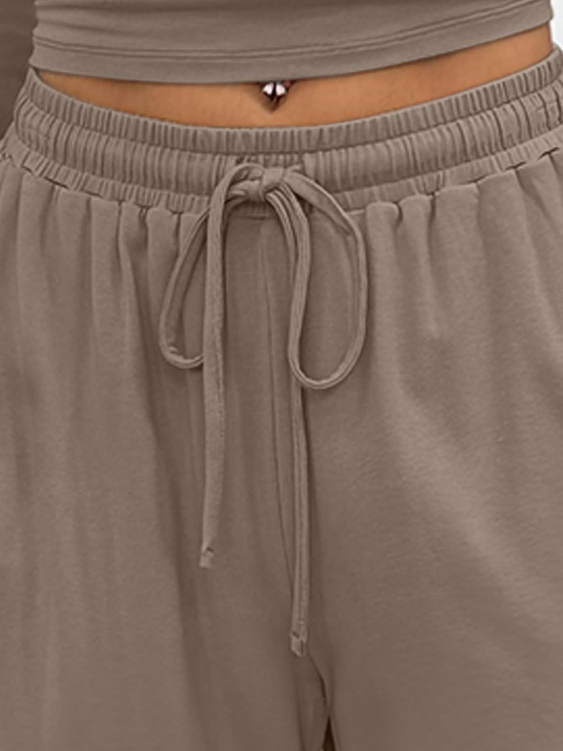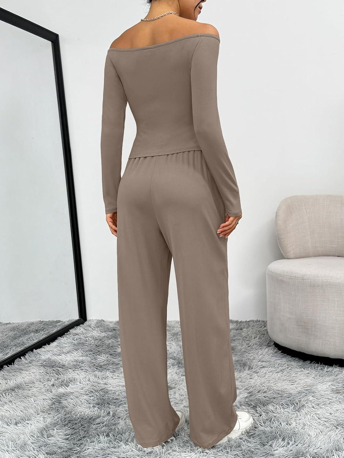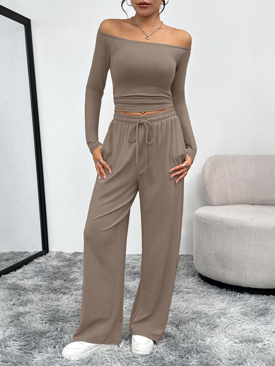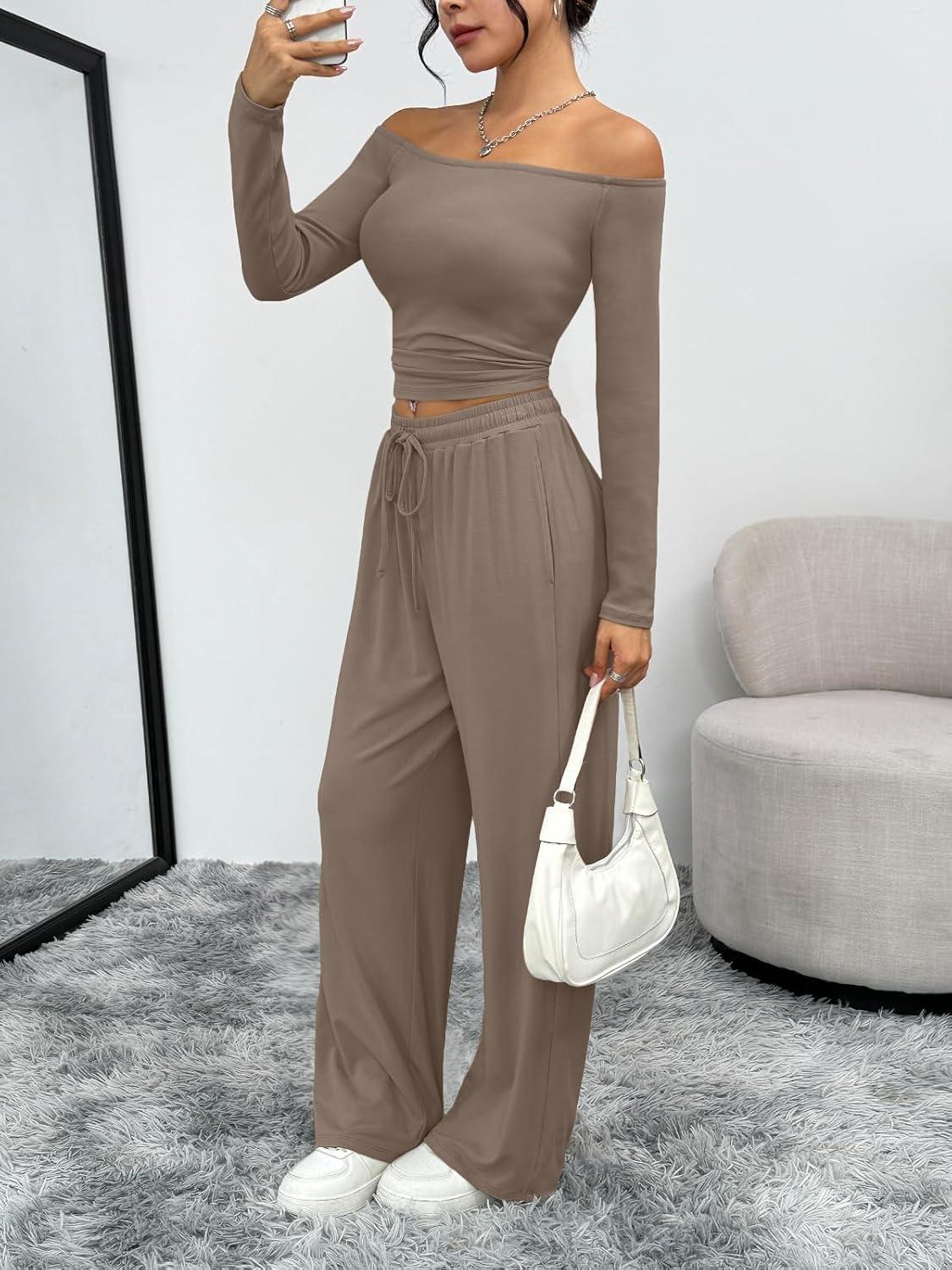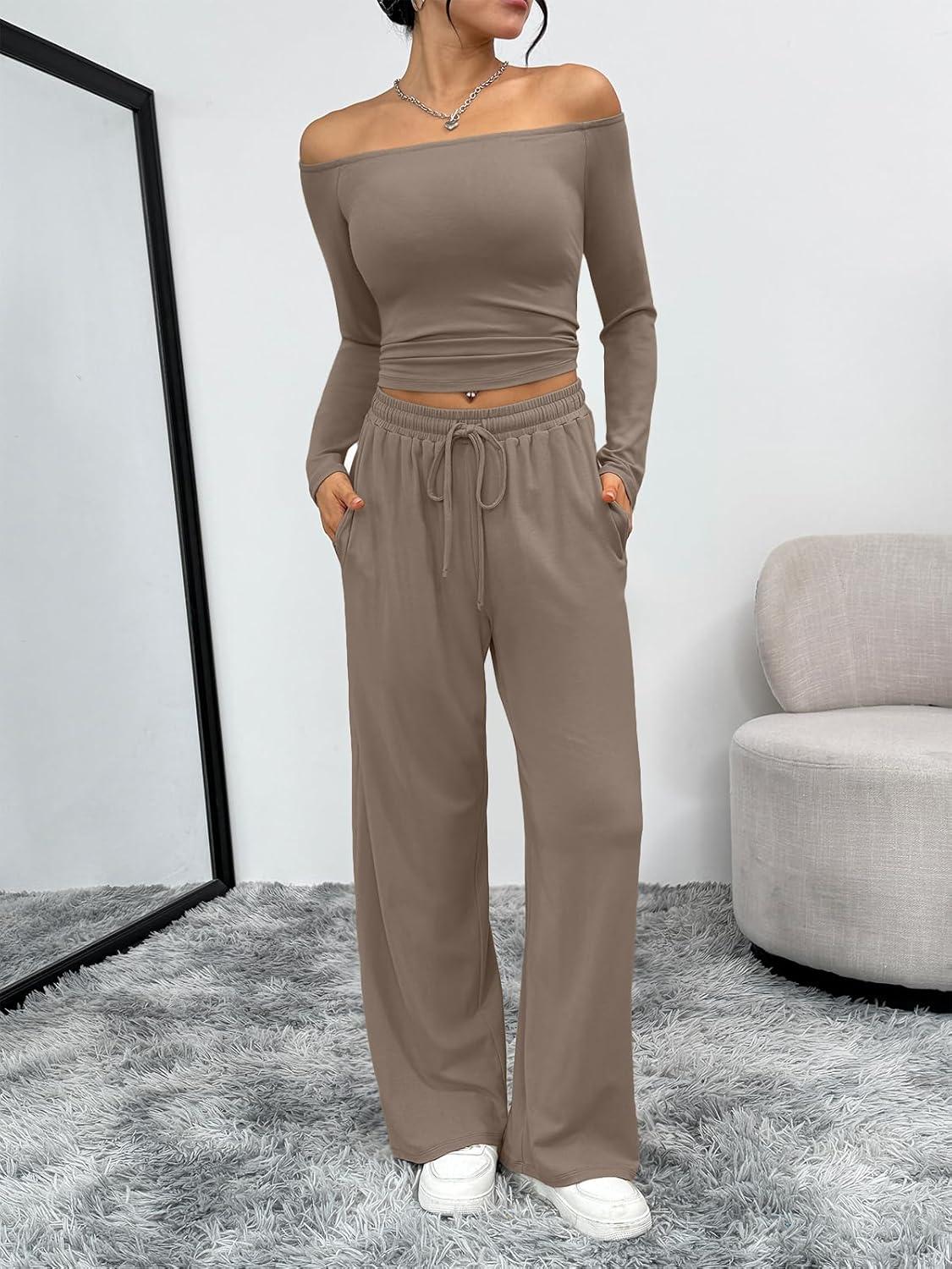 Trendy Queen 2 Piece Off Shoulder Set Womens Wide Leg Pants Side Ruching Slightly Crop Top Sets(Mocha)