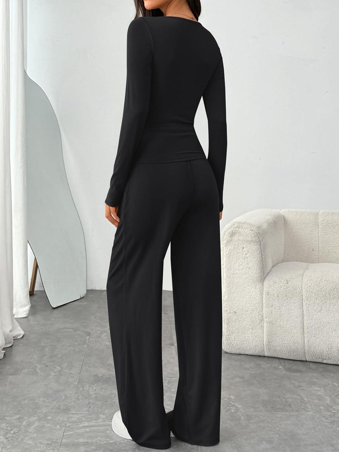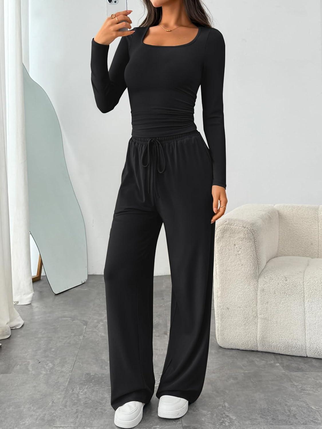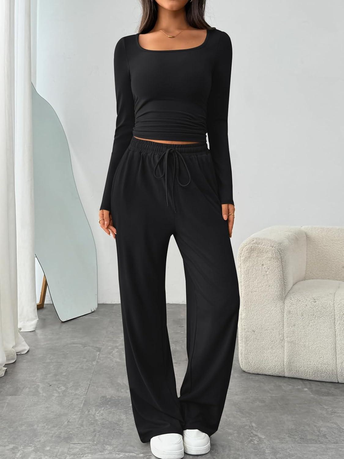 Trendy Queen 2 Piece Scoop Neck Lounge Set Womens Wide Leg Pants Side Ruching Slightly Crop Top Sweatsuit Sets With Pockets(Black)