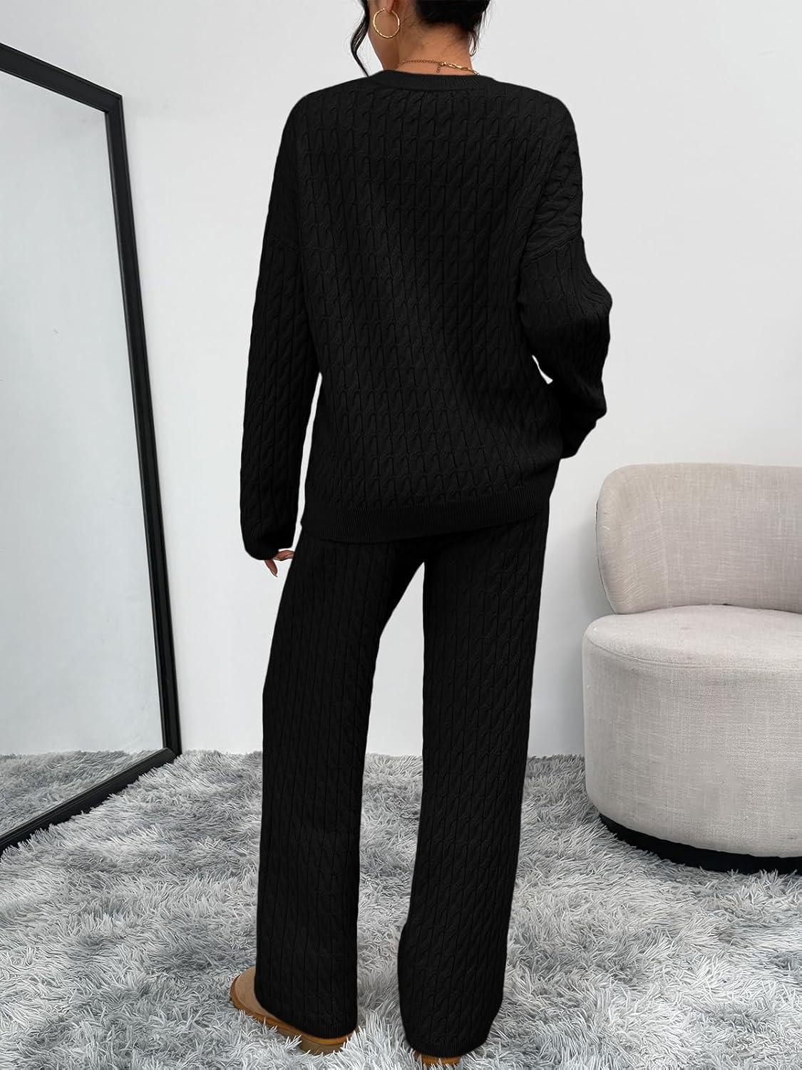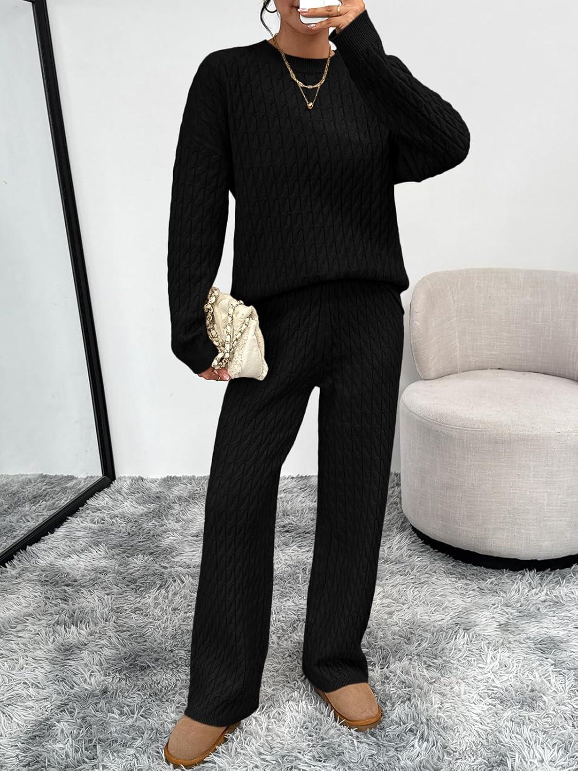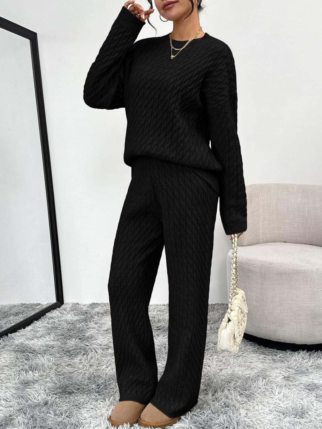 Trendy Queen Chunky Cable Knit Sweater Sets For Women 2 Piece Lounge Matching Winter Fall Outfits Casual Comfrt Clothing(Black)