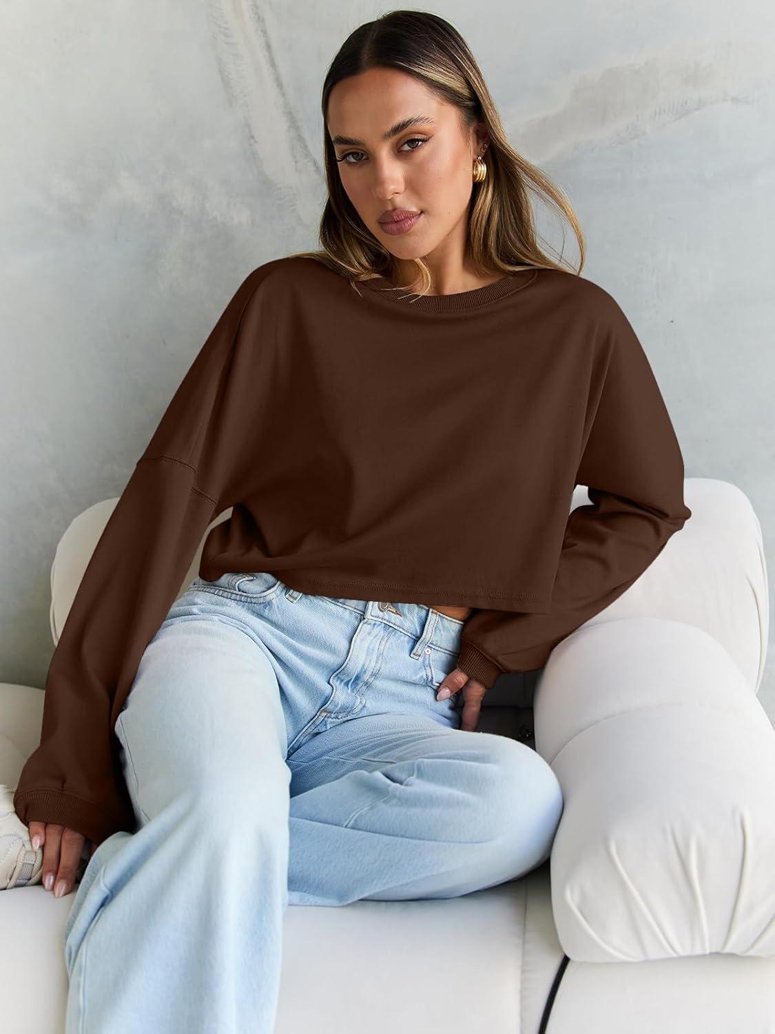 Trendy Queen Cropped Sweatshirts for Women Oversized Crewneck Sweaters Long Sleeve Tops Fall Winter Clothes 2025(Brown)