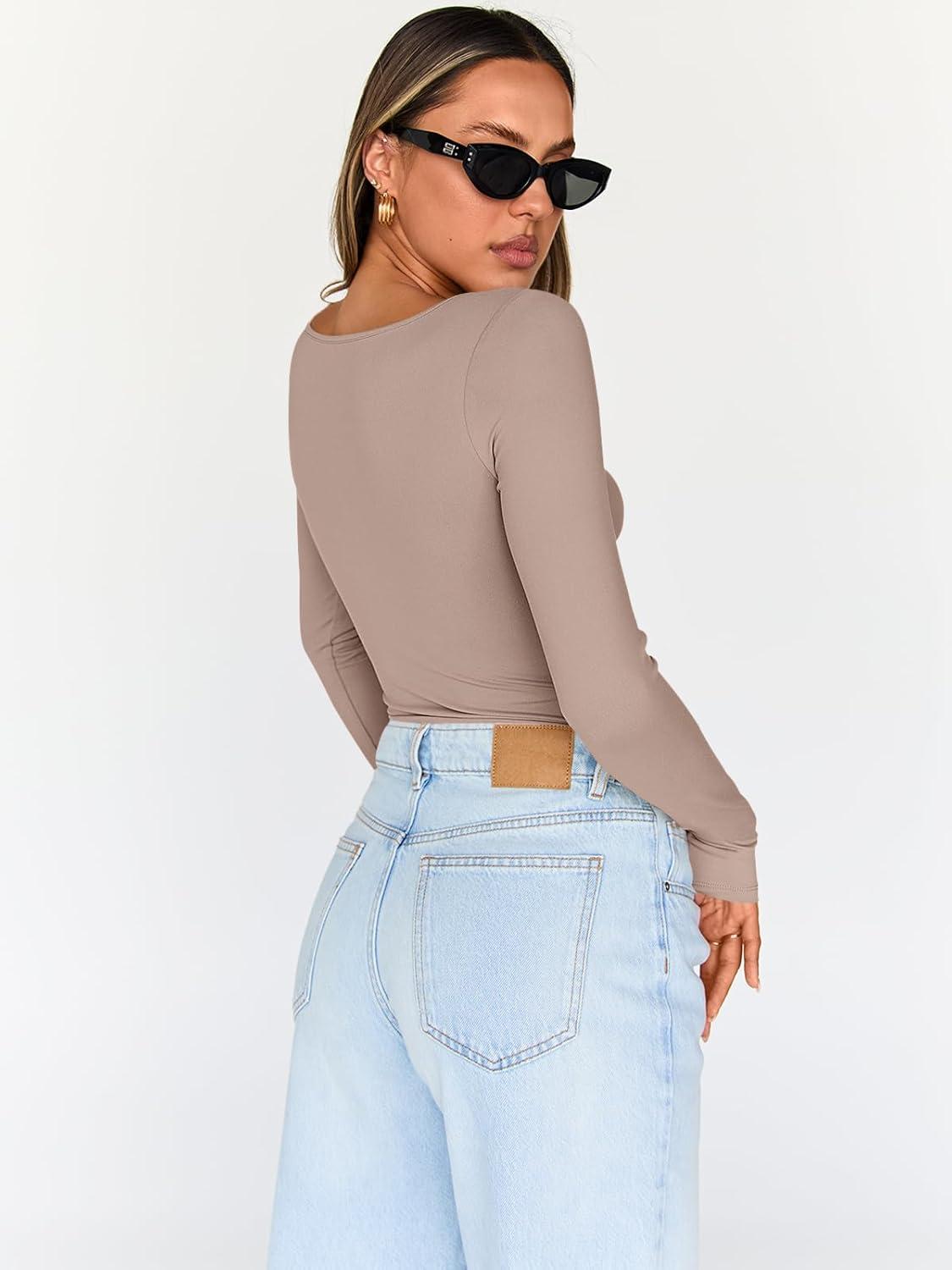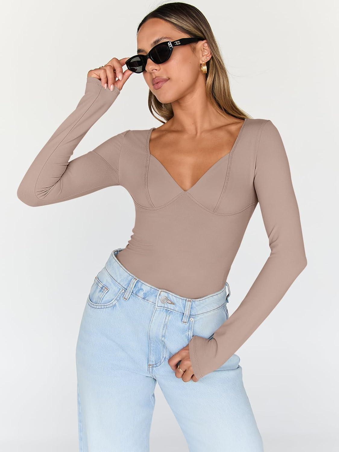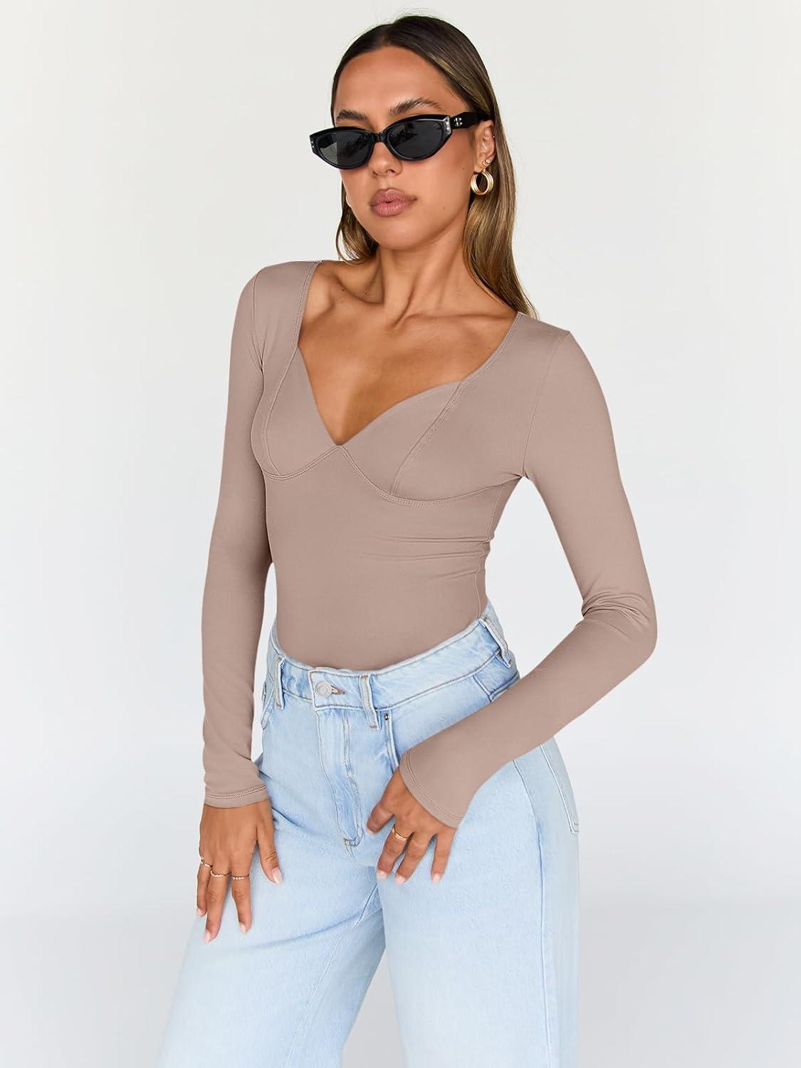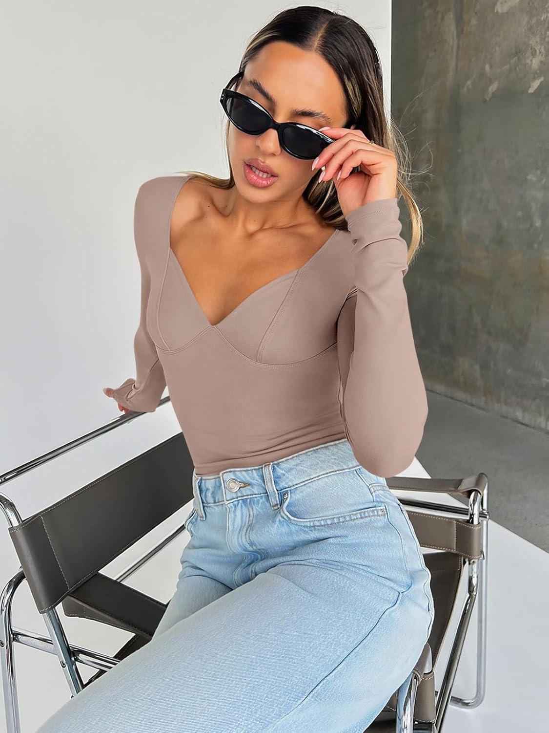 Trendy Queen Going Out Tops for Women Trendy Long Sleeve Shirts Fashion Clothing V Neck Basic Y2K Clothes Cute Shirt Corset(Beige)