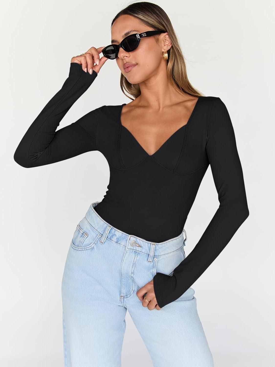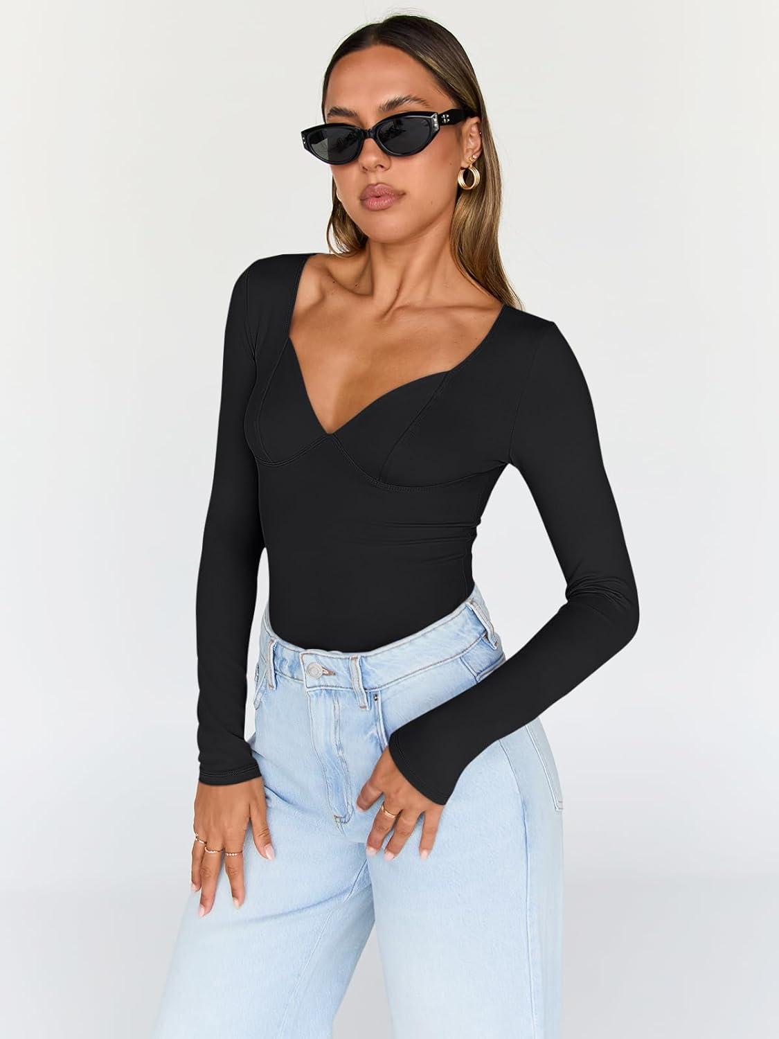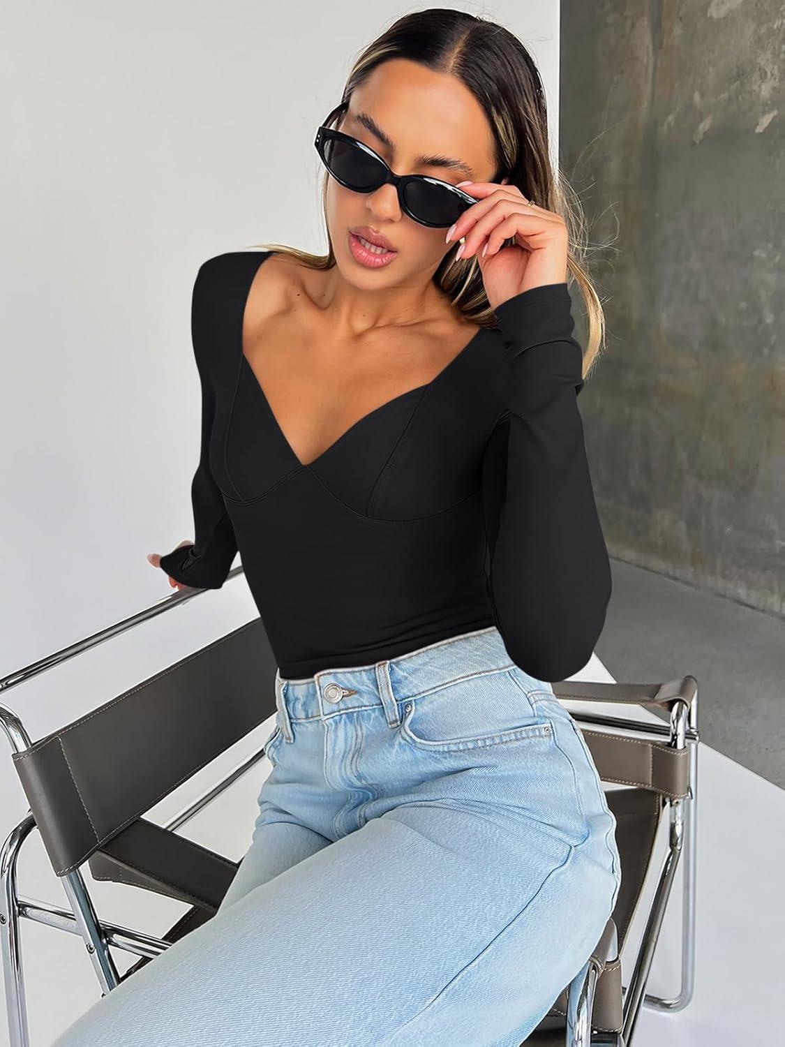 Trendy Queen Going Out Tops for Women Trendy Long Sleeve Shirts Fashion Clothing V Neck Basic Y2K Clothes Cute Shirt Corset(Black)