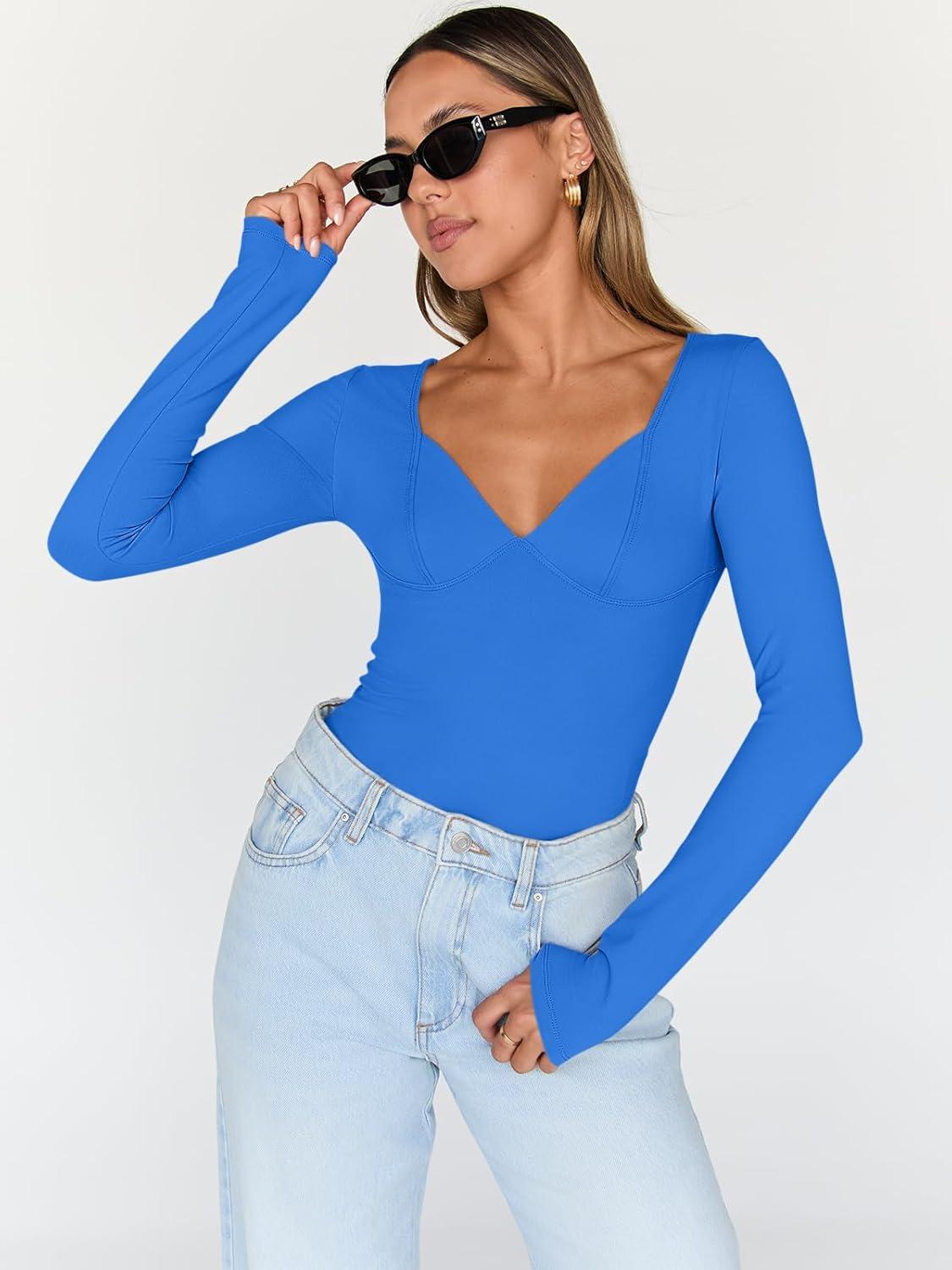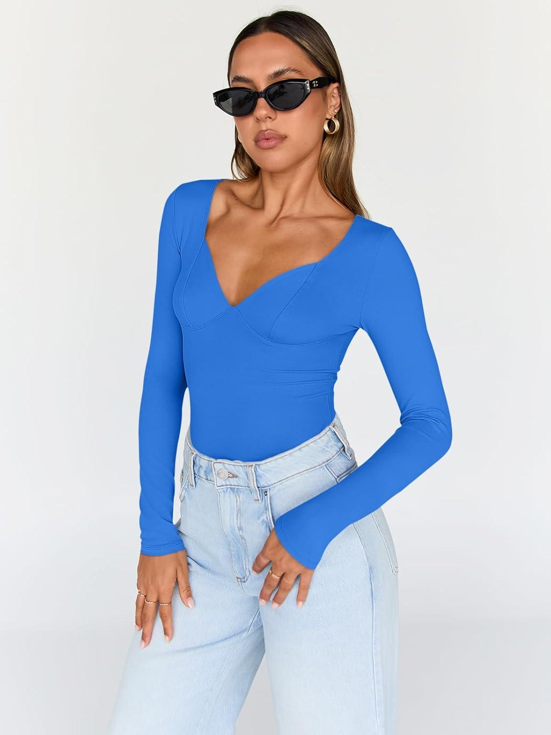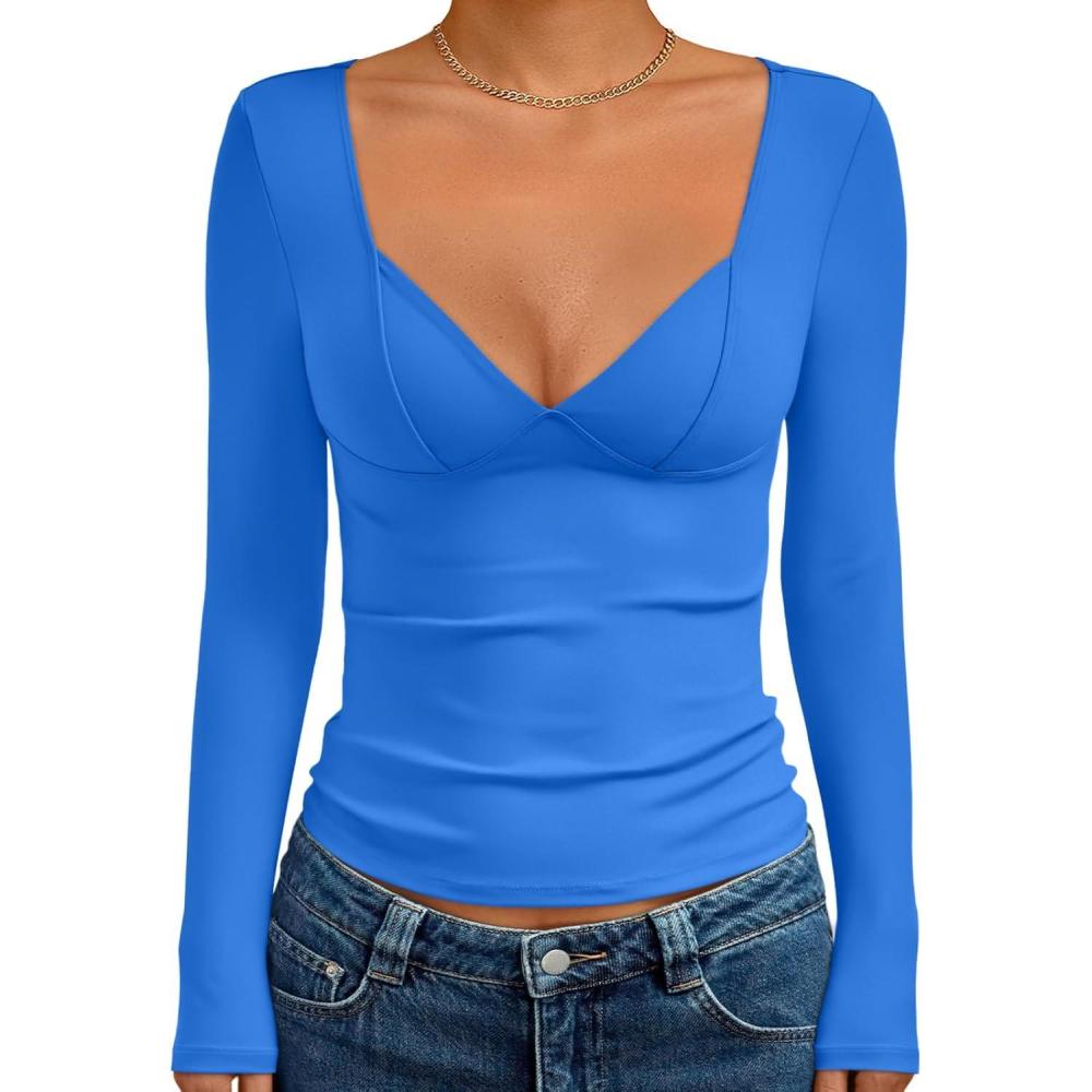 Trendy Queen Going Out Tops for Women Trendy Long Sleeve Shirts Fashion Clothing V Neck Basic Y2K Clothes Cute Shirt Corset(Blue)