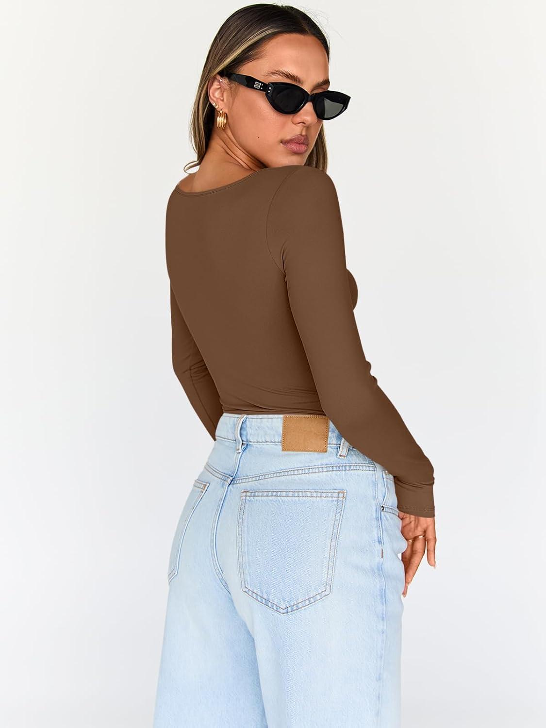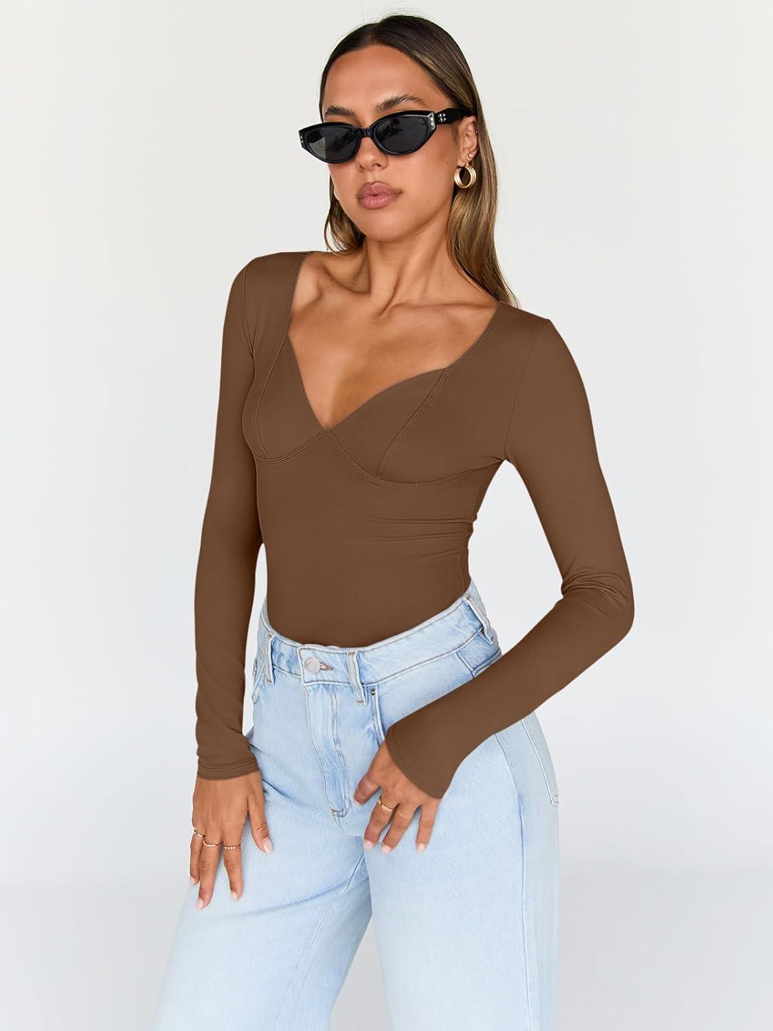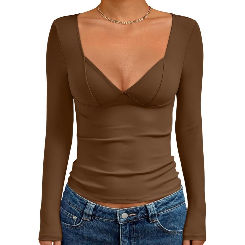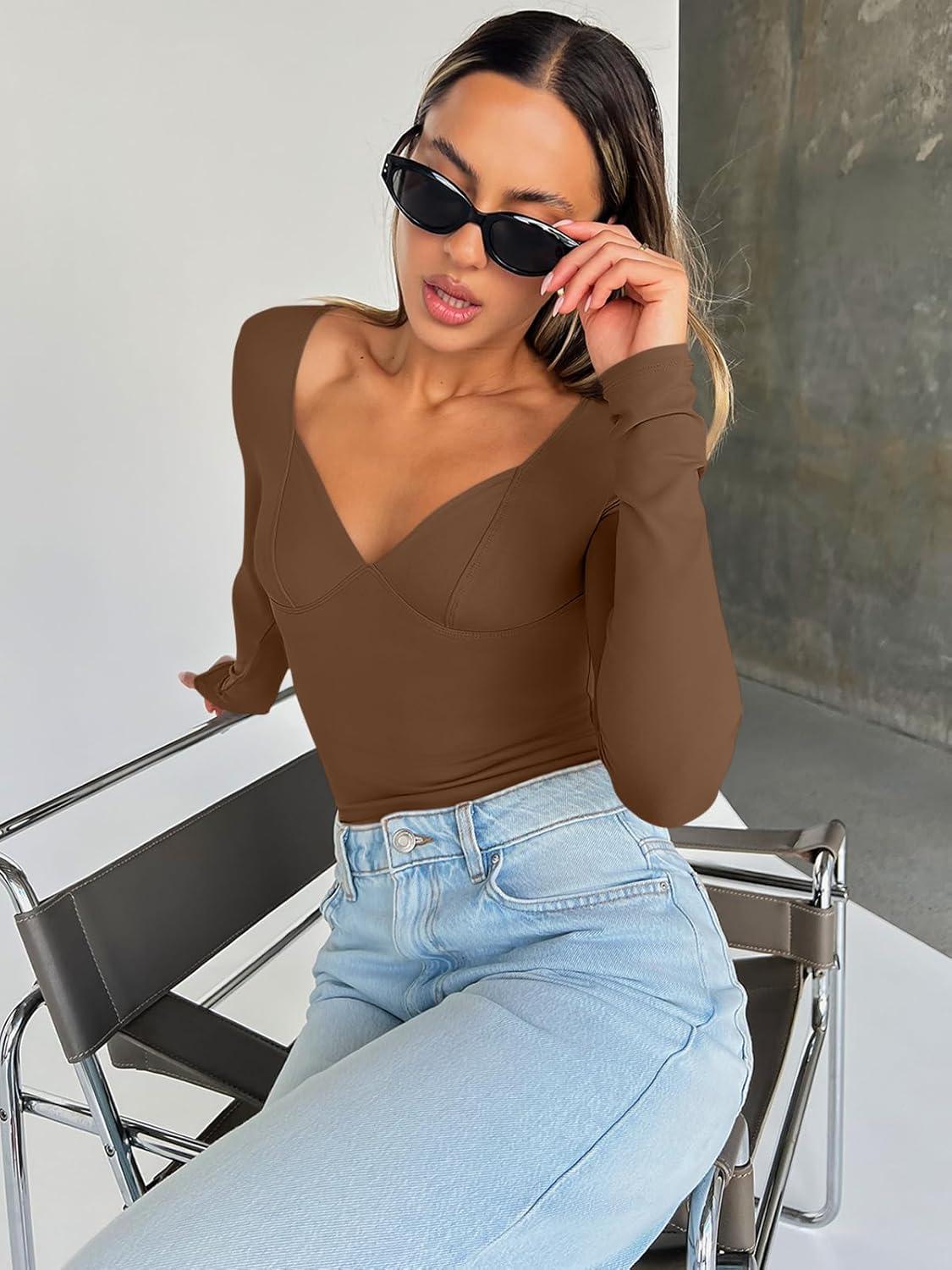 Trendy Queen Going Out Tops for Women Trendy Long Sleeve Shirts Fashion Clothing V Neck Basic Y2K Clothes Cute Shirt Corset(Coffee)