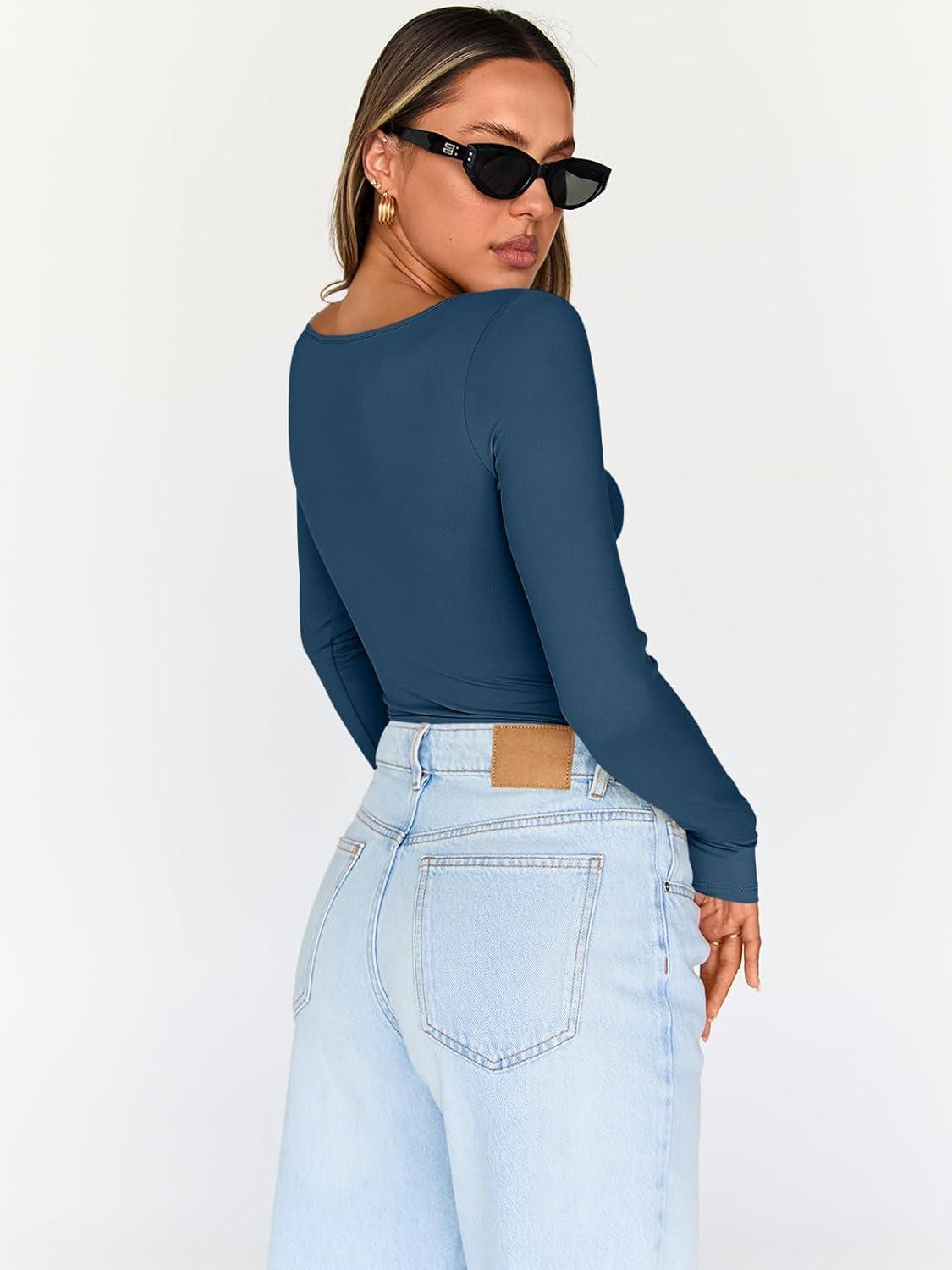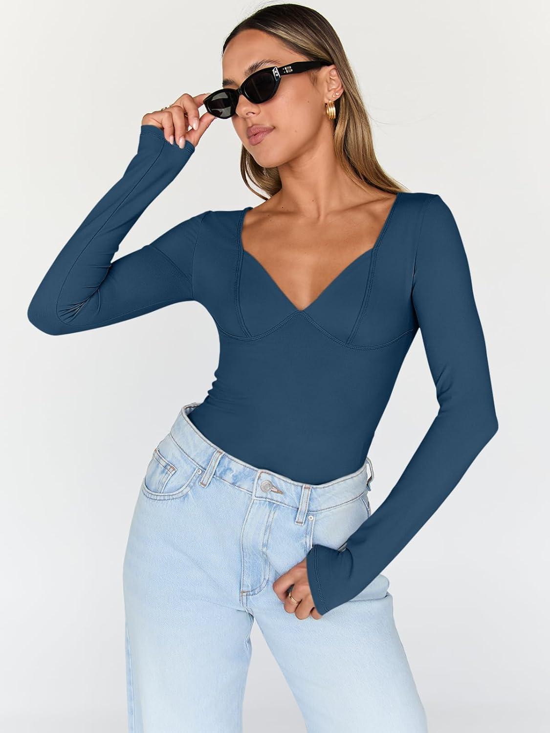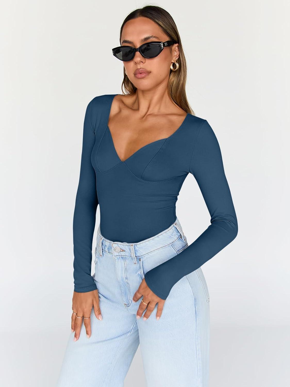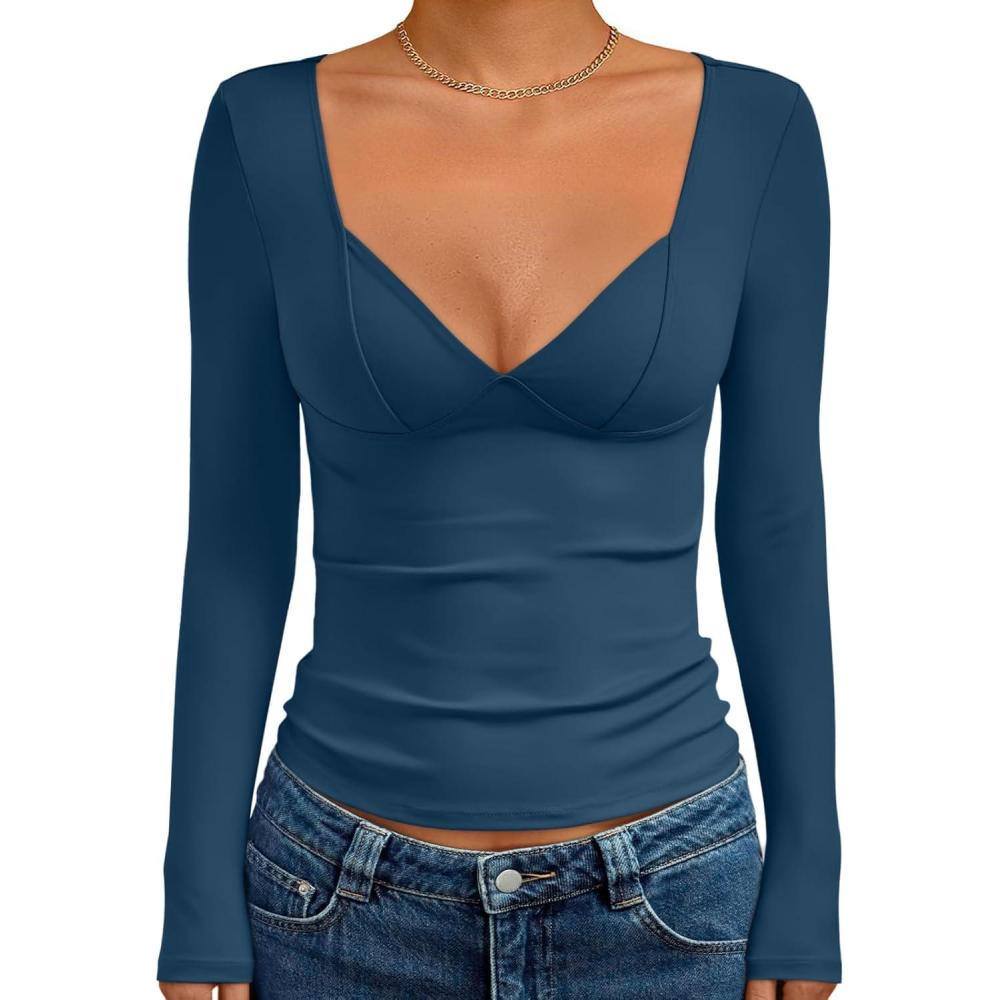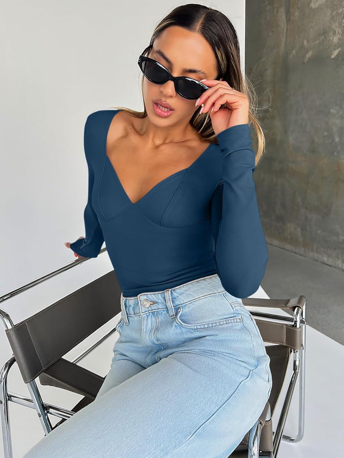Trendy Queen Going Out Tops for Women Trendy Long Sleeve Shirts Fashion Clothing V Neck Basic Y2K Clothes Cute Shirt Corset(Dark Blue)