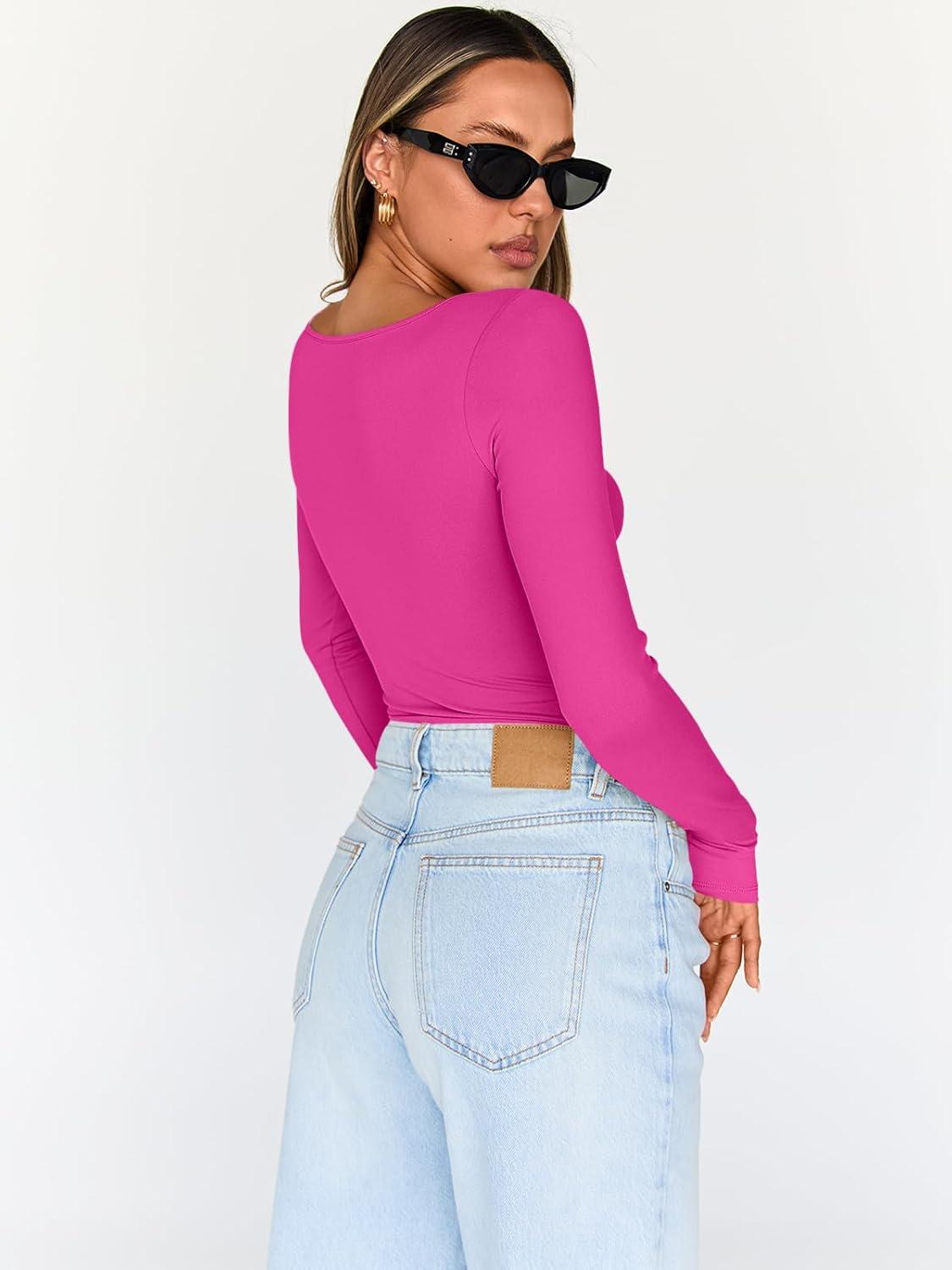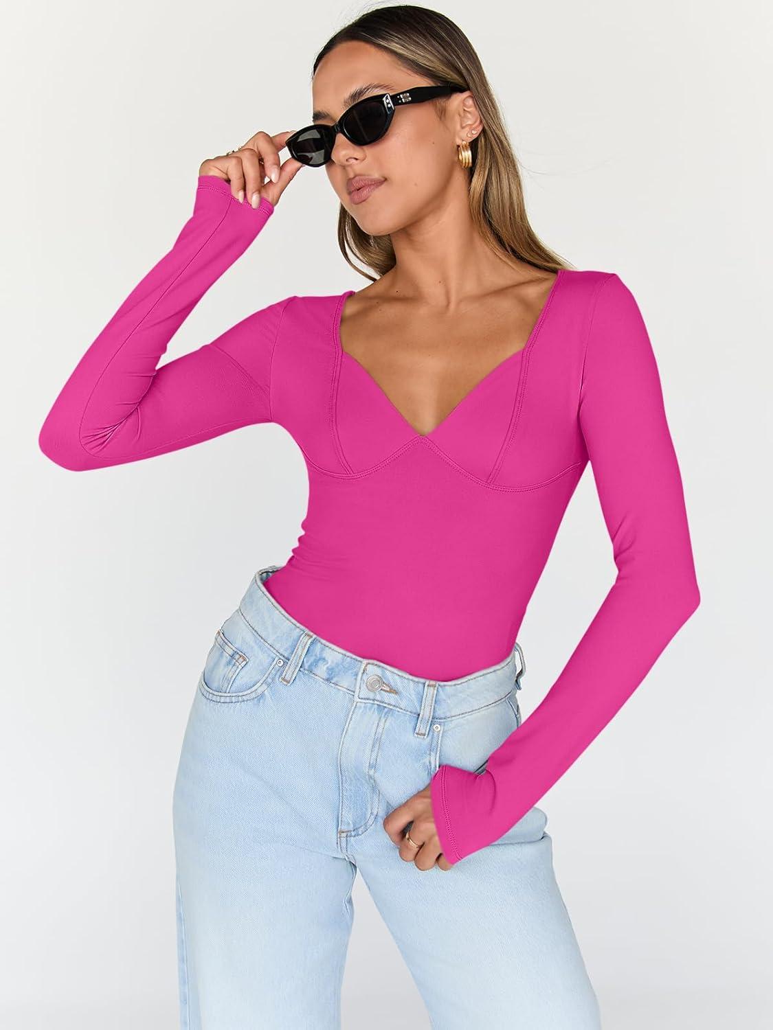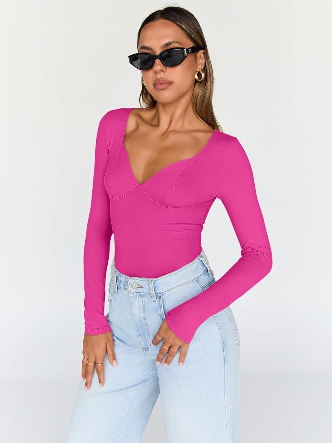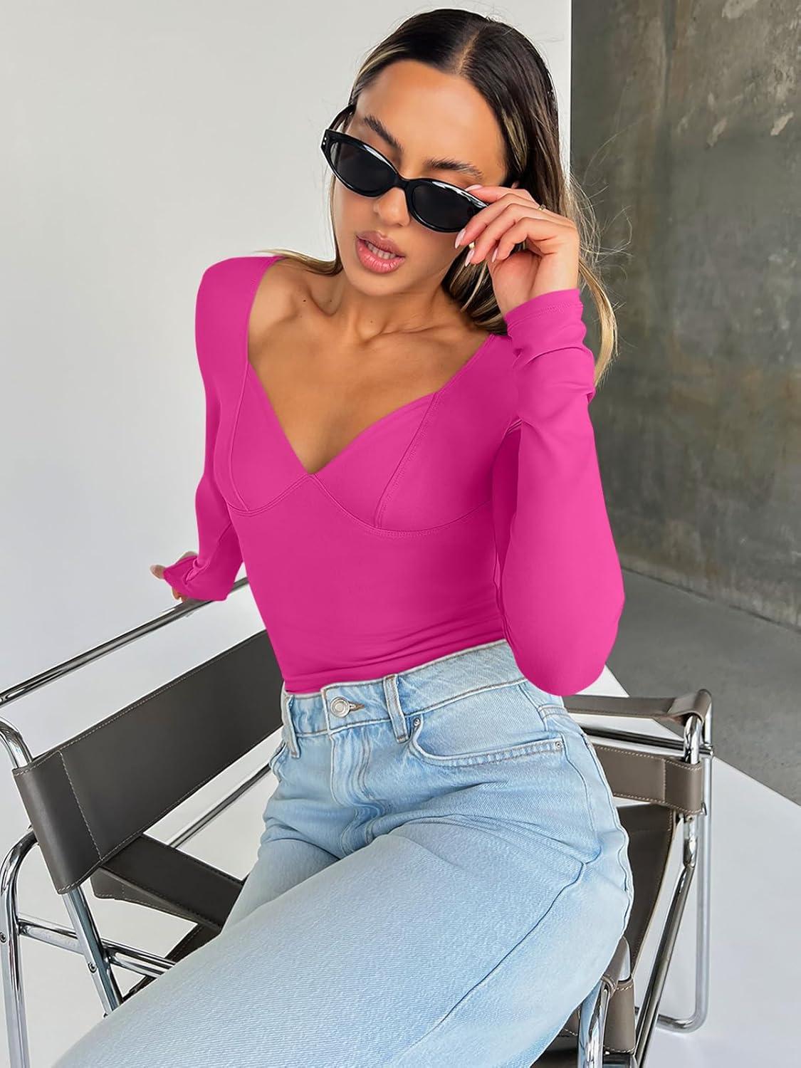 Trendy Queen Going Out Tops for Women Trendy Long Sleeve Shirts Fashion Clothing V Neck Basic Y2K Clothes Cute Shirt Corset(Hot Pink)