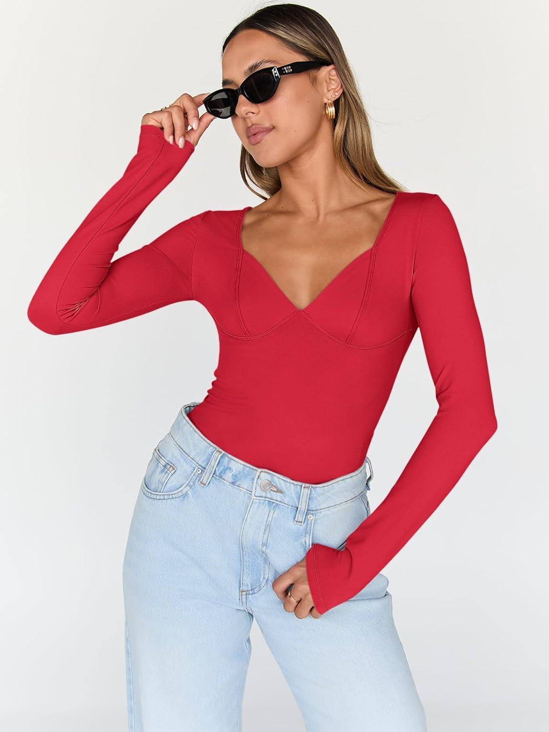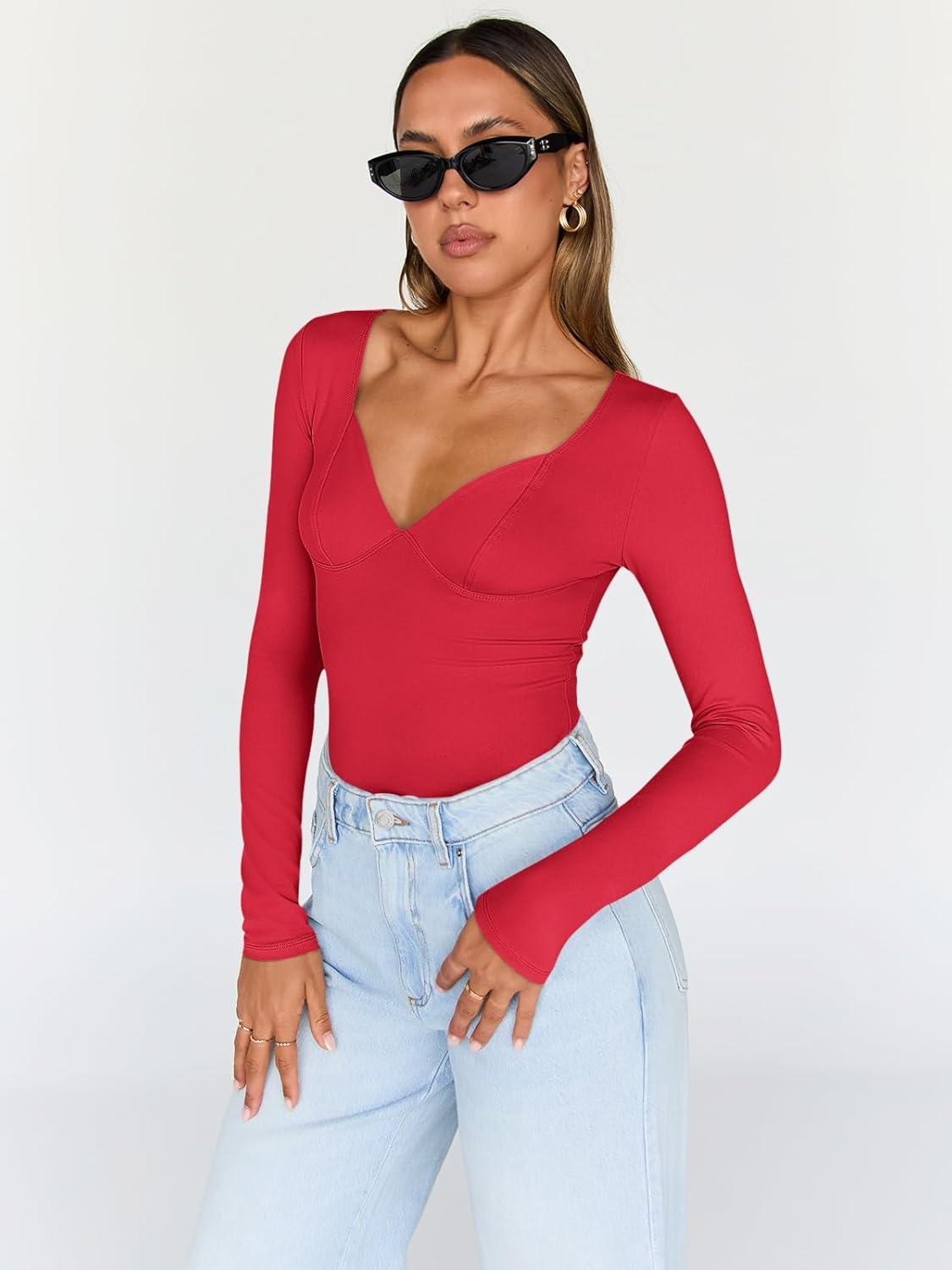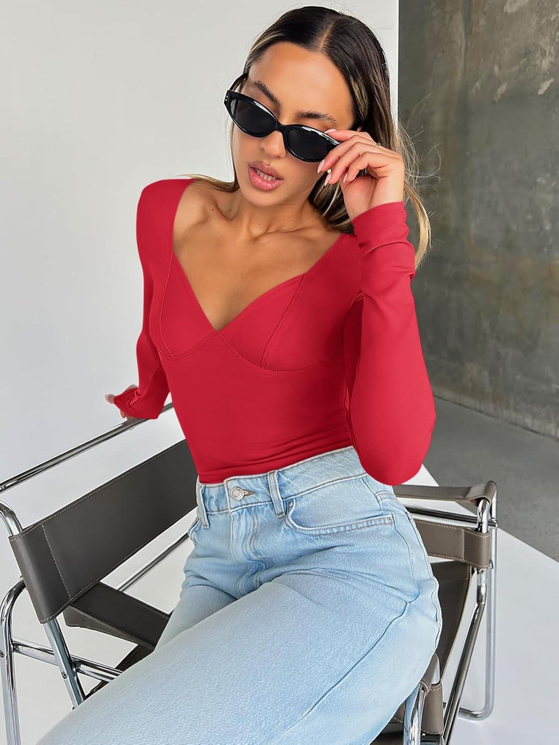 Trendy Queen Going Out Tops for Women Trendy Long Sleeve Shirts Fashion Clothing V Neck Basic Y2K Clothes Cute Shirt Corset(Red)
