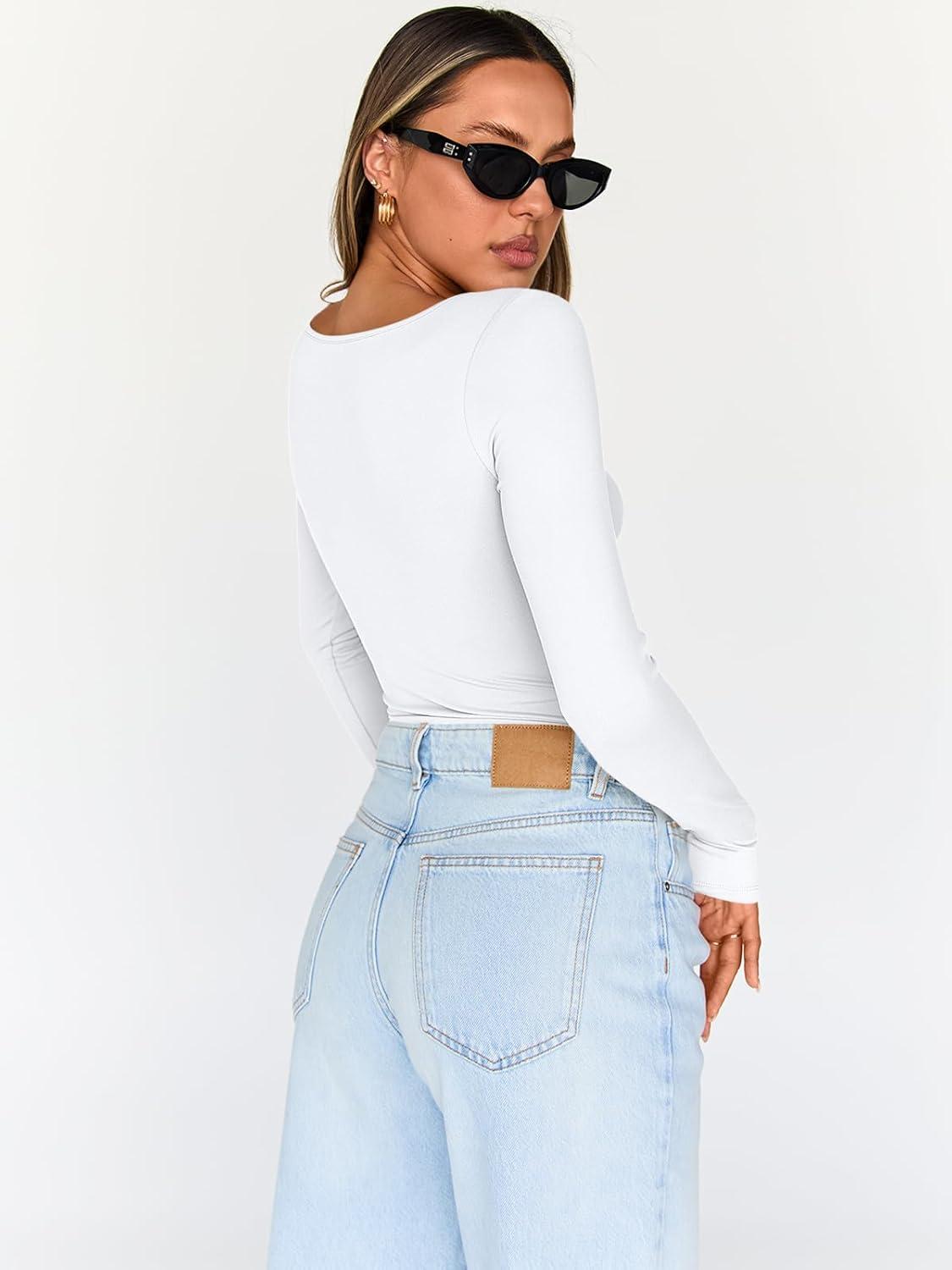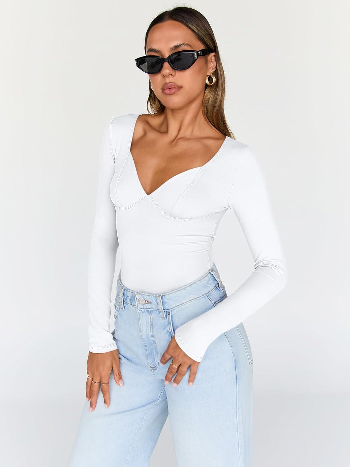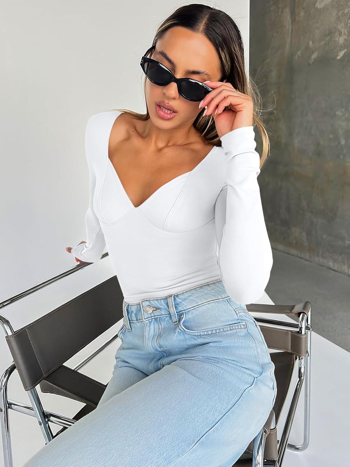 Trendy Queen Going Out Tops for Women Trendy Long Sleeve Shirts Fashion Clothing V Neck Basic Y2K Clothes Cute Shirt Corset(White)