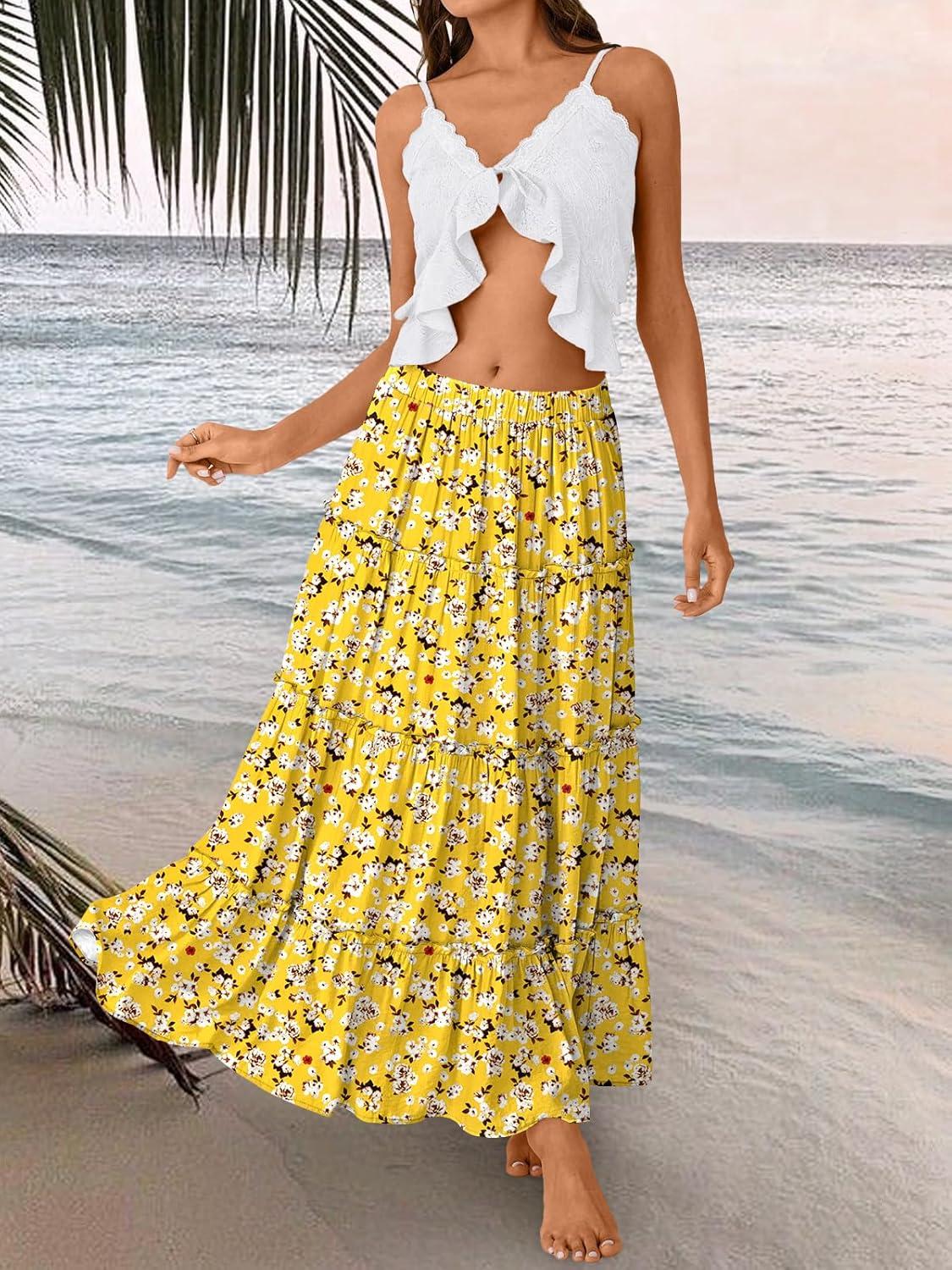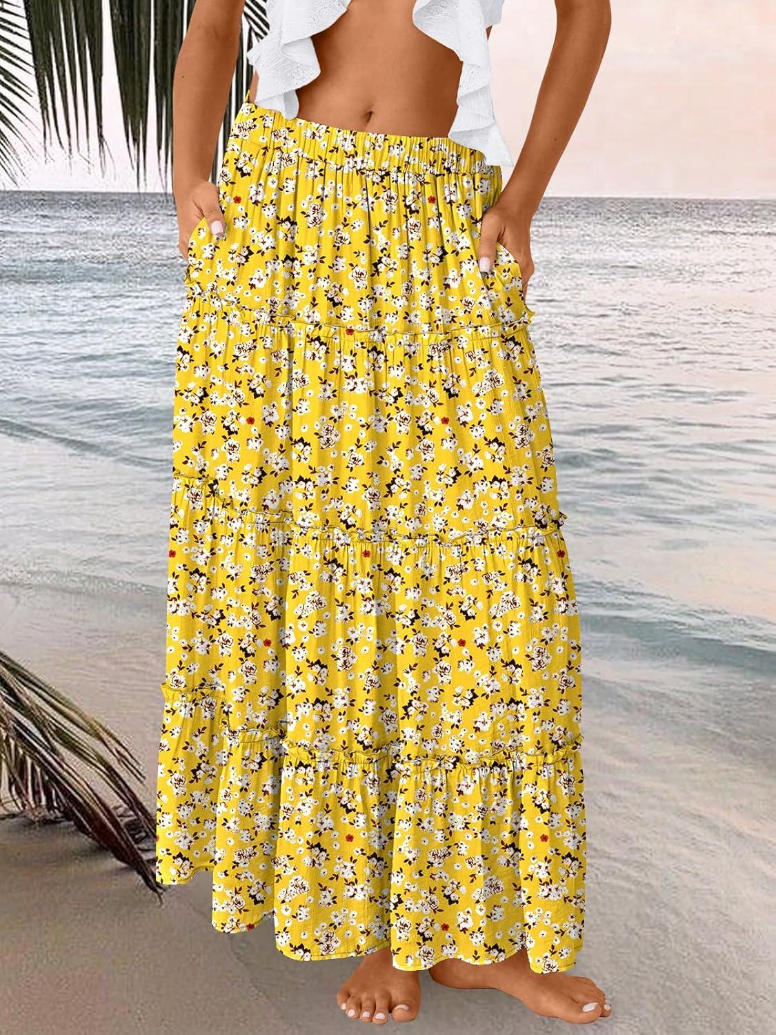 Trendy Queen Long Skirts for Women Boho Maxi Skirt Summer Swing Tiered A-Line Elastic High Waist Dress with Pockets Fashion(Yellow Flower)