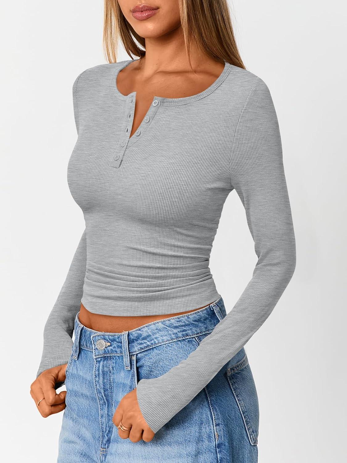 Trendy Queen Long Sleeve Henley Shirts for Women Fall Winter Ribbed Thermal Tops Casual Blouses Basics Tees Cute Sweaters(Grey)