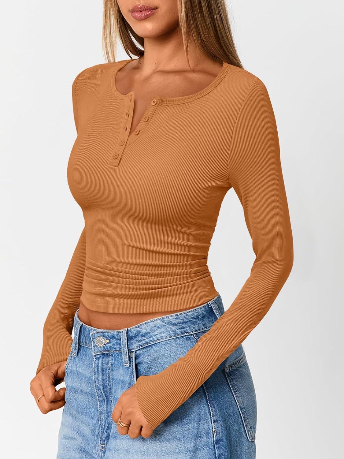 Trendy Queen Long Sleeve Henley Shirts for Women Fall Winter Ribbed Thermal Tops Casual Blouses Basics Tees Cute Sweaters(Orange)