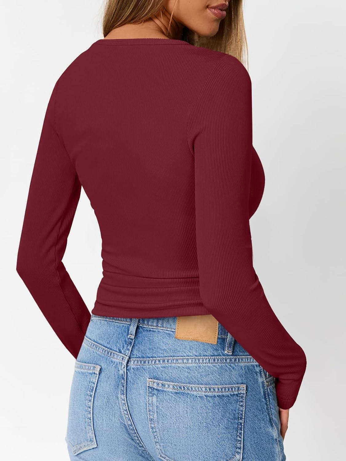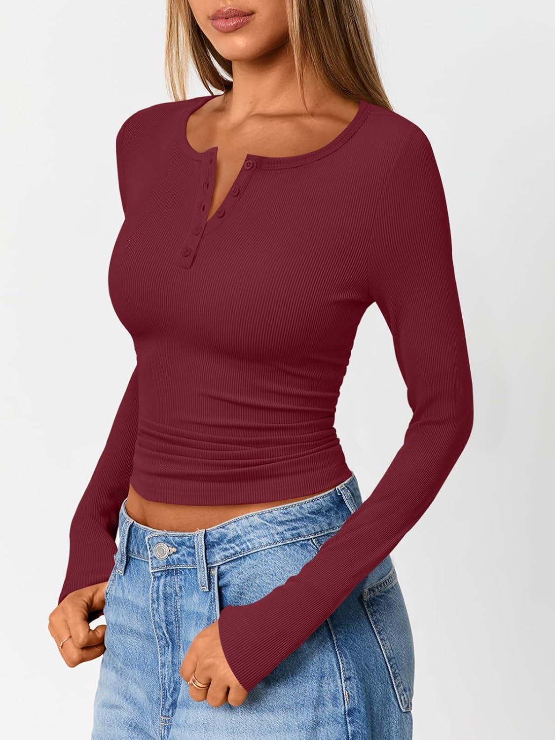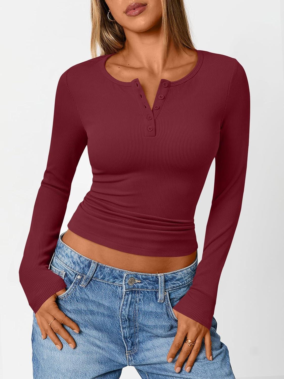 Trendy Queen Long Sleeve Henley Shirts for Women Fall Winter Ribbed Thermal Tops Casual Blouses Basics Tees Cute Sweaters(Winered)