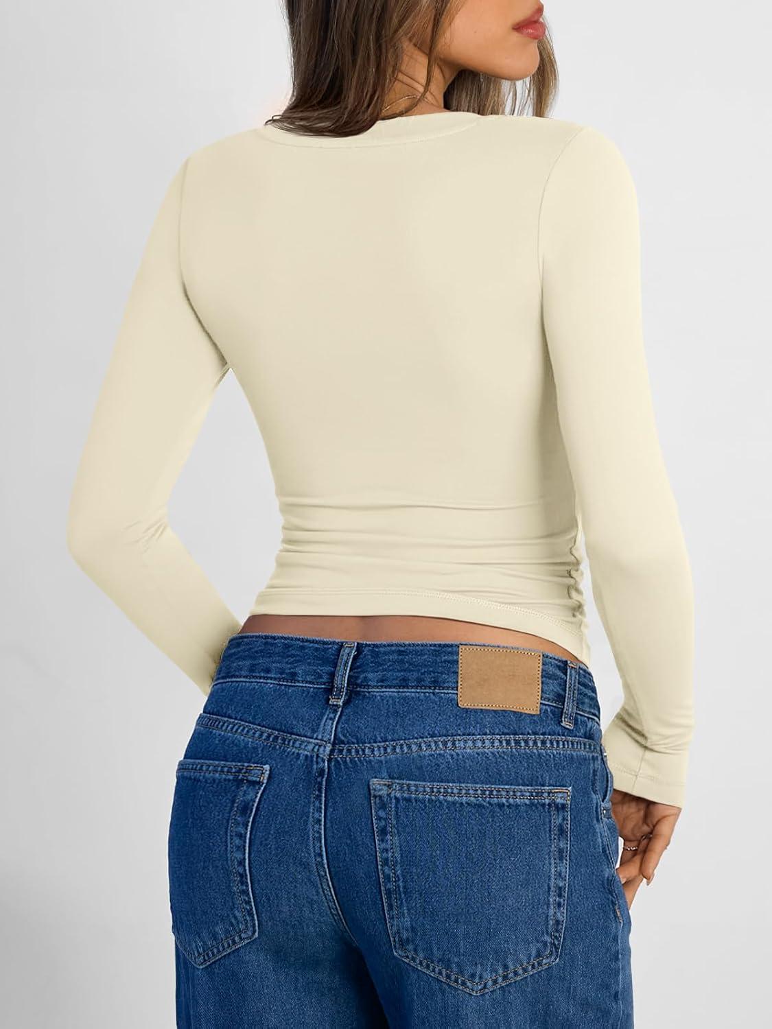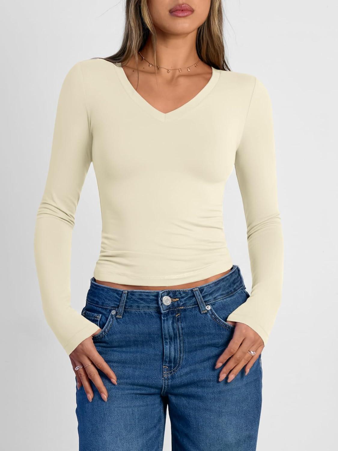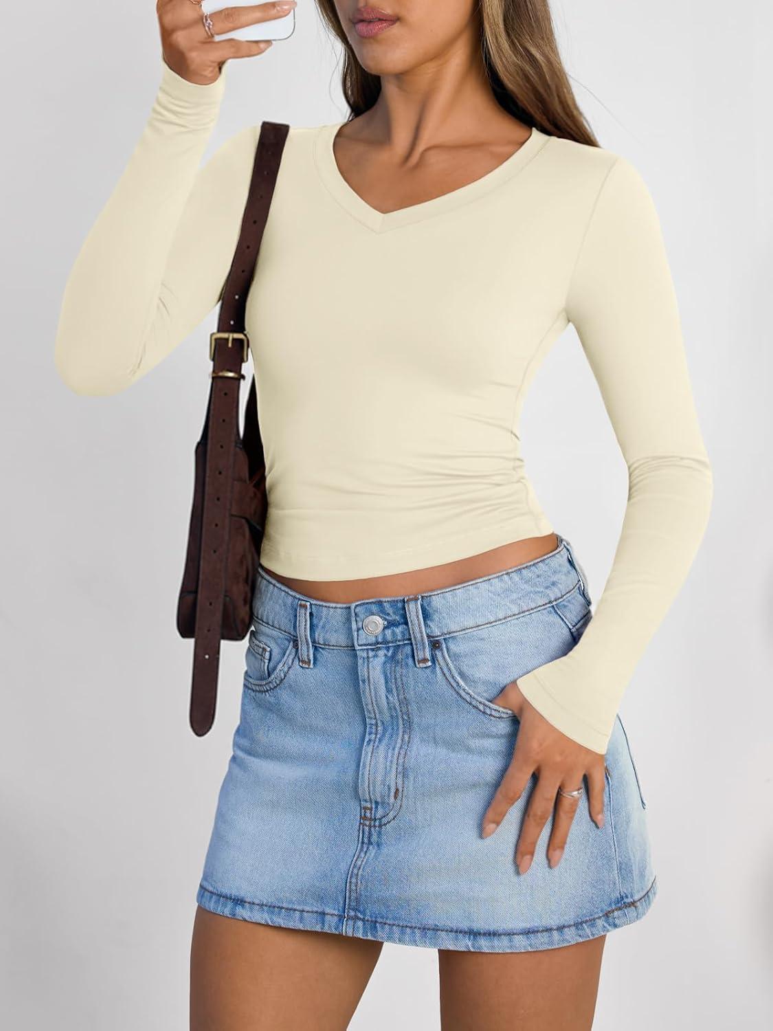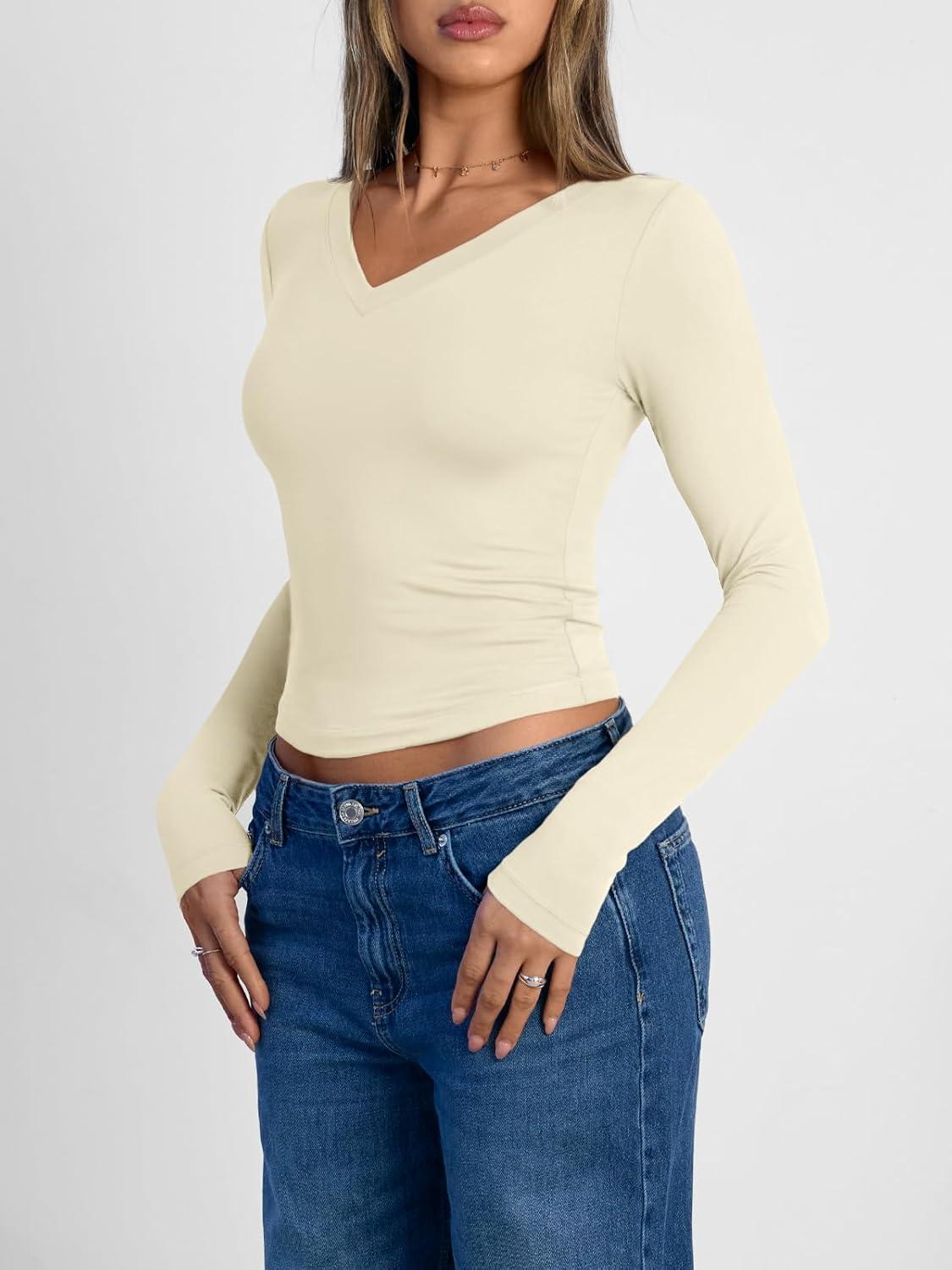 Trendy Queen Long Sleeve Shirts for Women 2025 Fall Fashion V Neck Basics Crop Tops Slim Fitted Y2K Tops Outfits Clothes(Apricot)