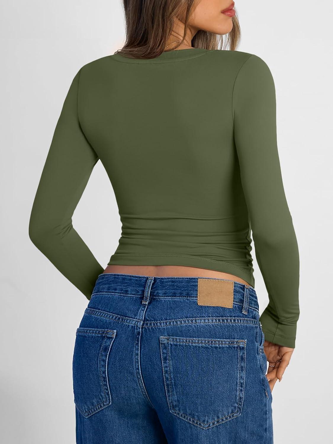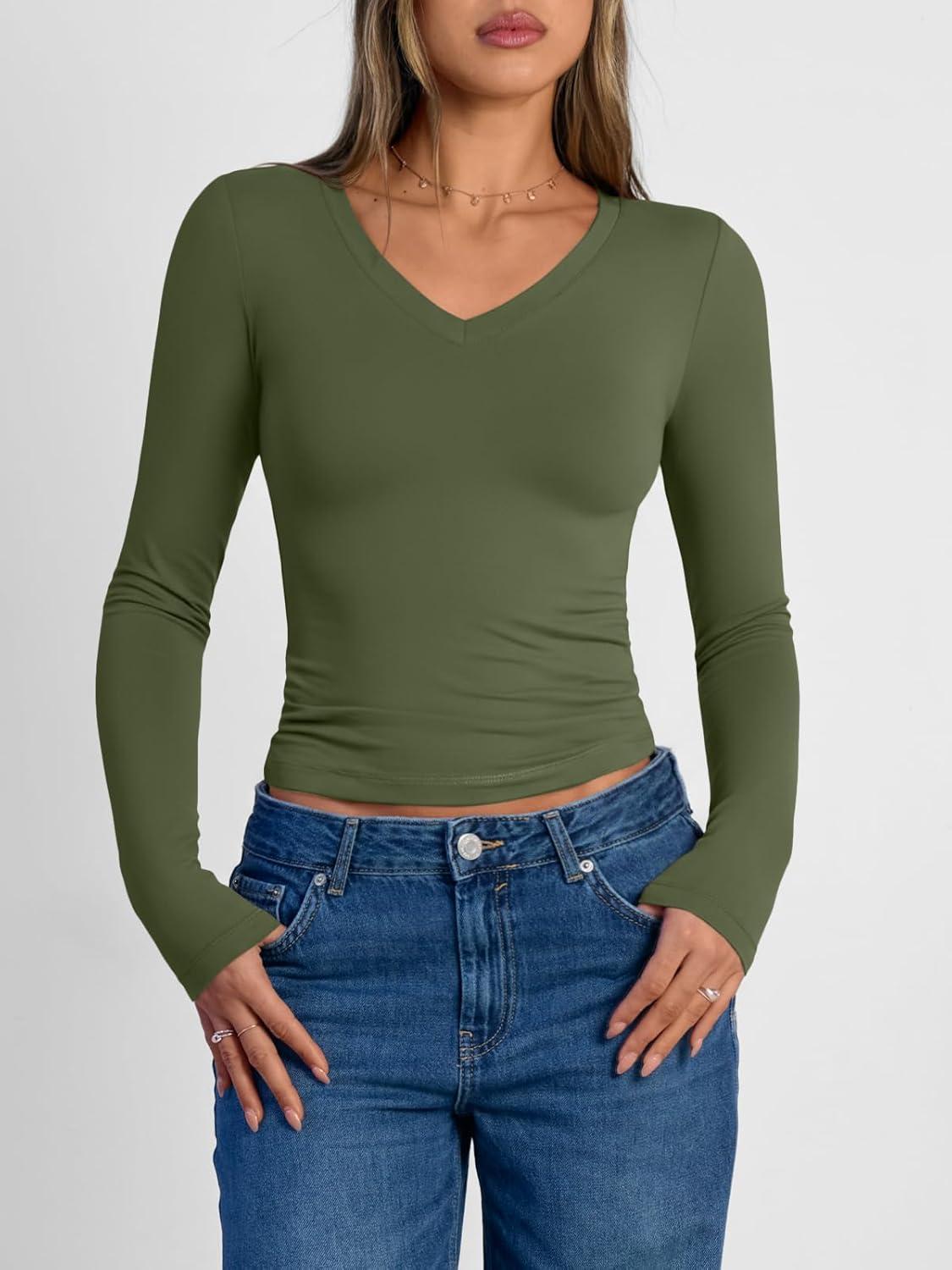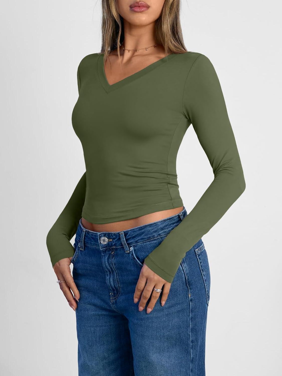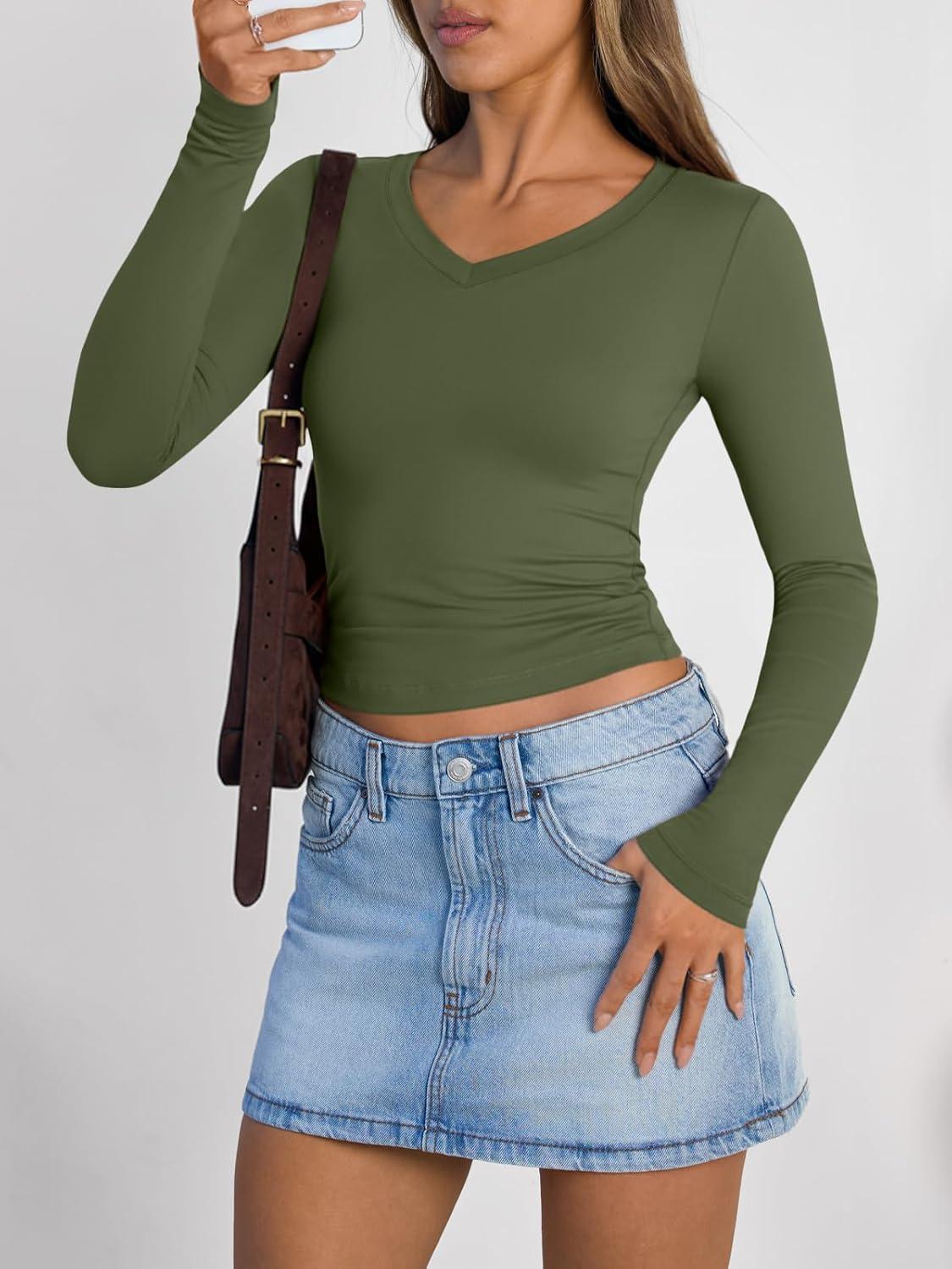 Trendy Queen Long Sleeve Shirts for Women 2025 Fall Fashion V Neck Basics Crop Tops Slim Fitted Y2K Tops Outfits Clothes(Army Green)