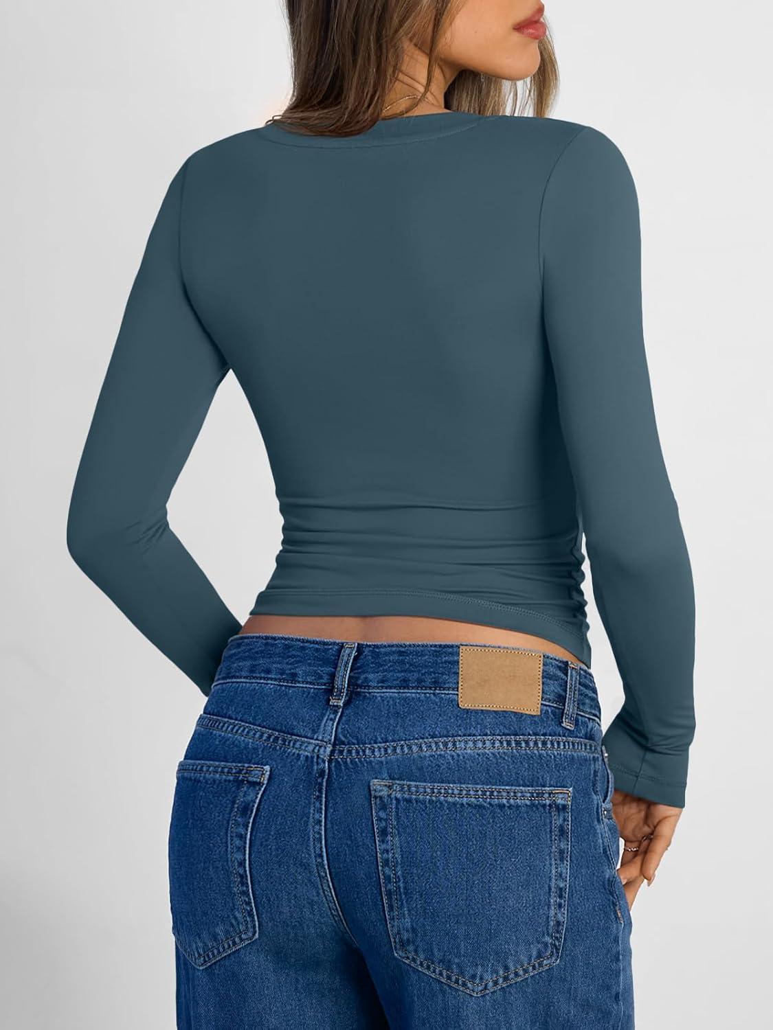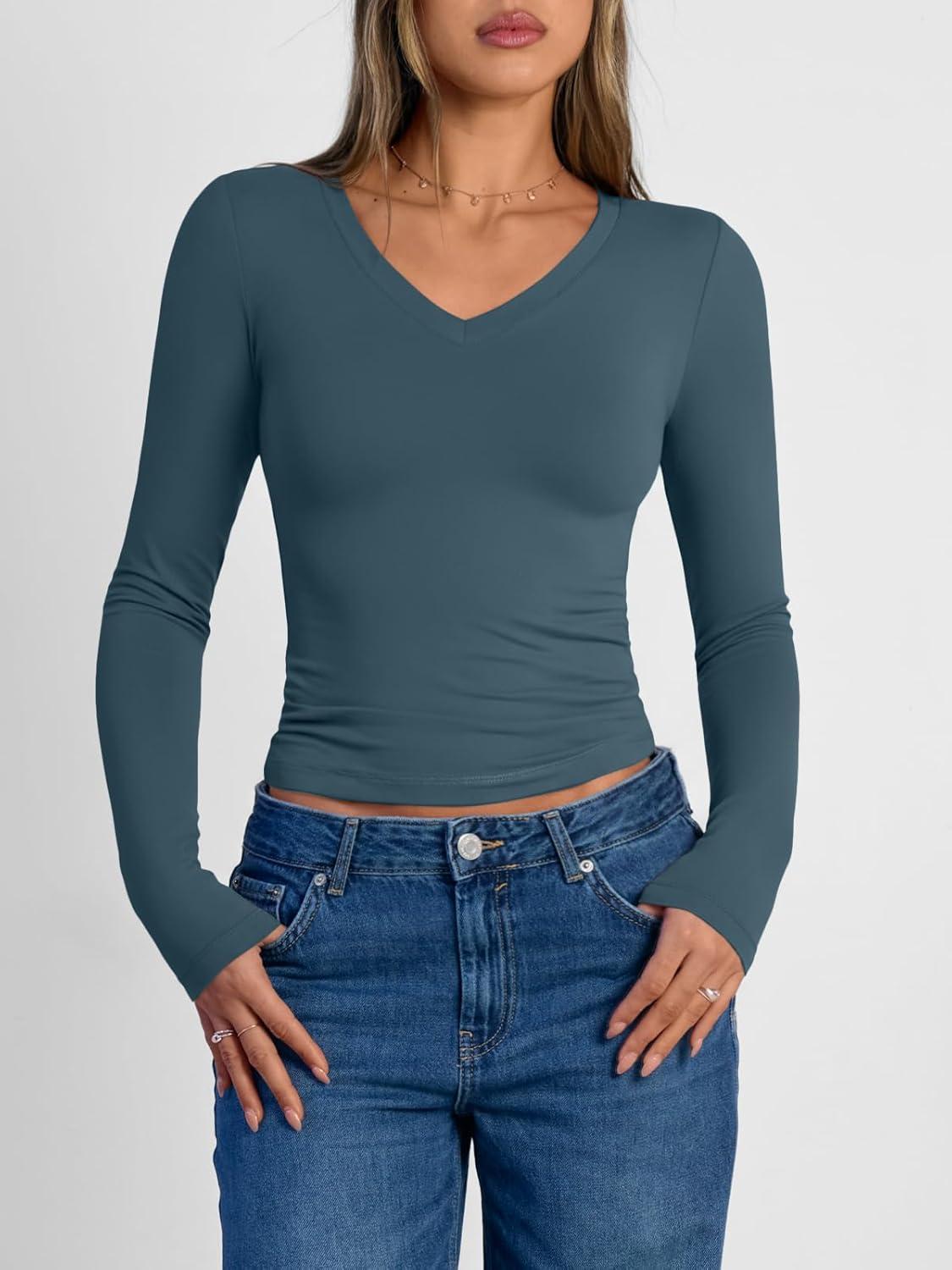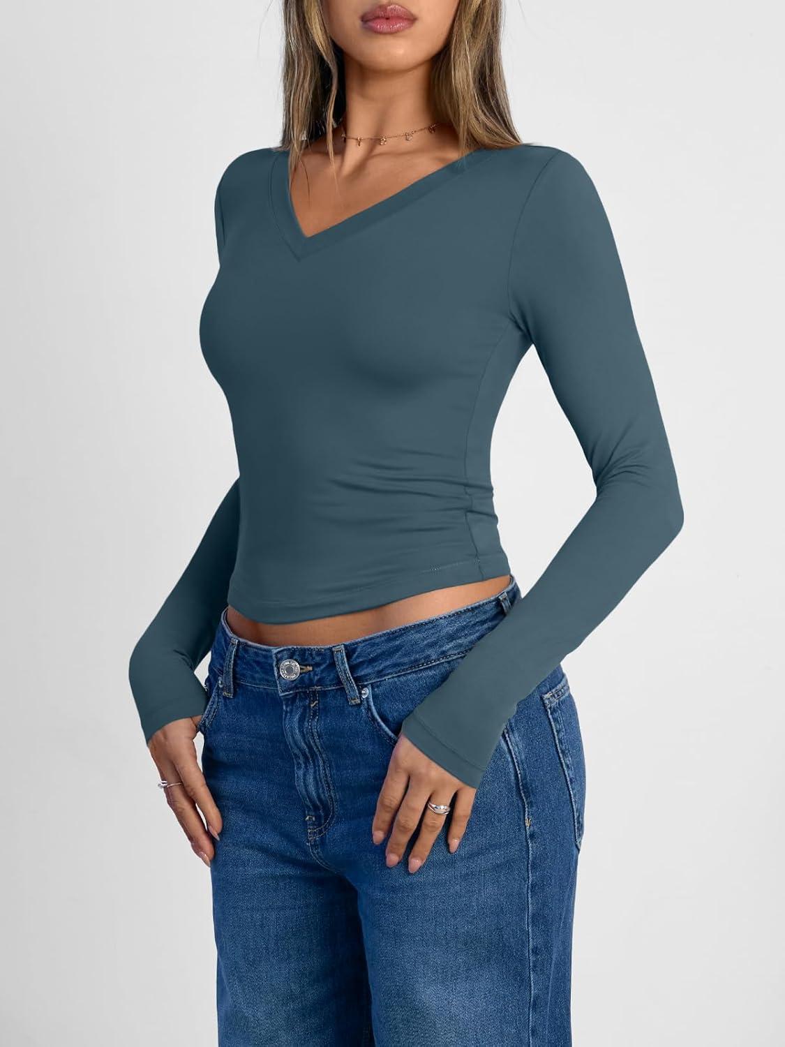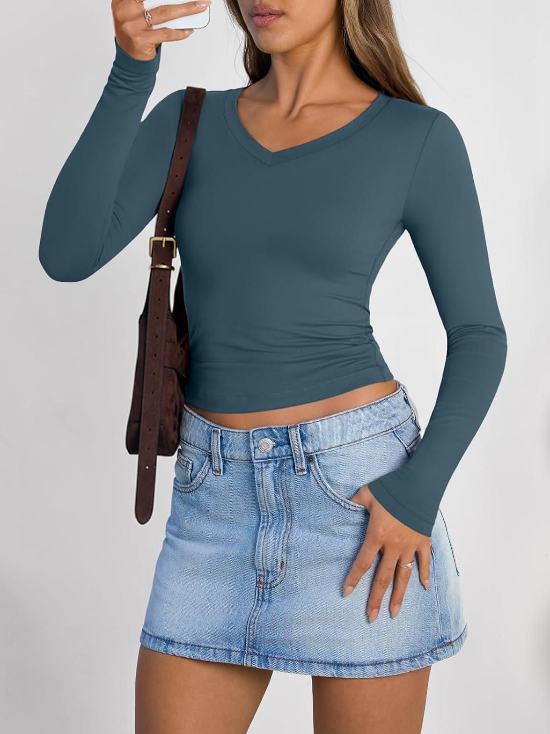 Trendy Queen Long Sleeve Shirts for Women 2025 Fall Fashion V Neck Basics Crop Tops Slim Fitted Y2K Tops Outfits Clothes(Haze Blue)