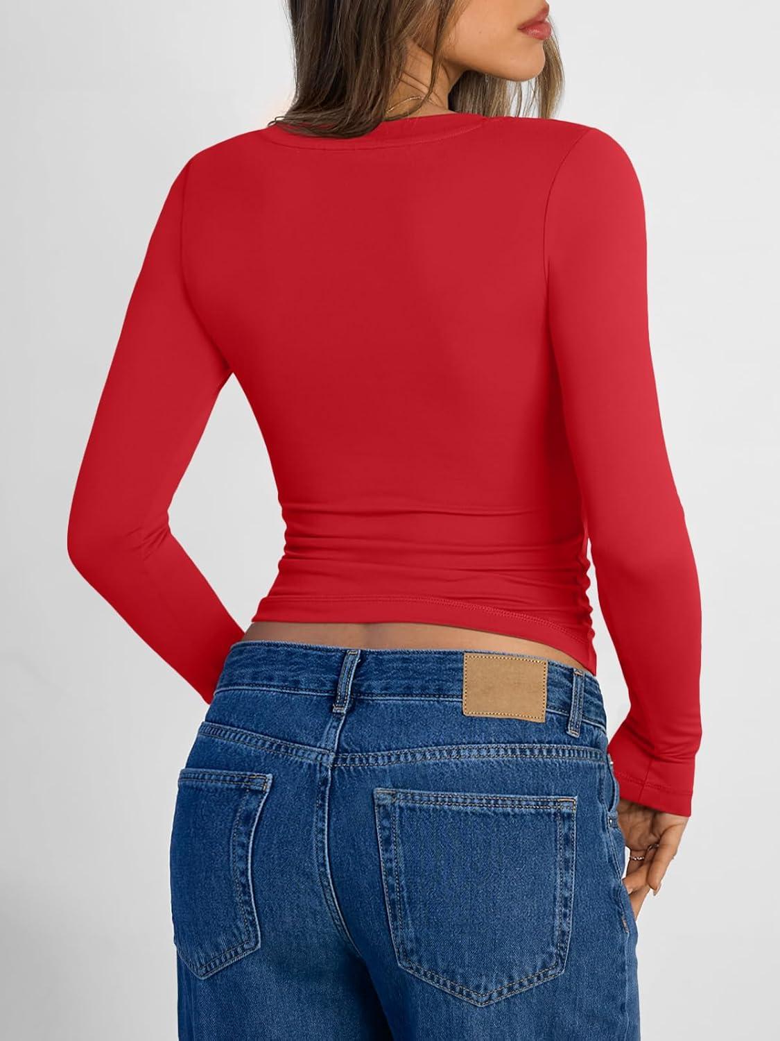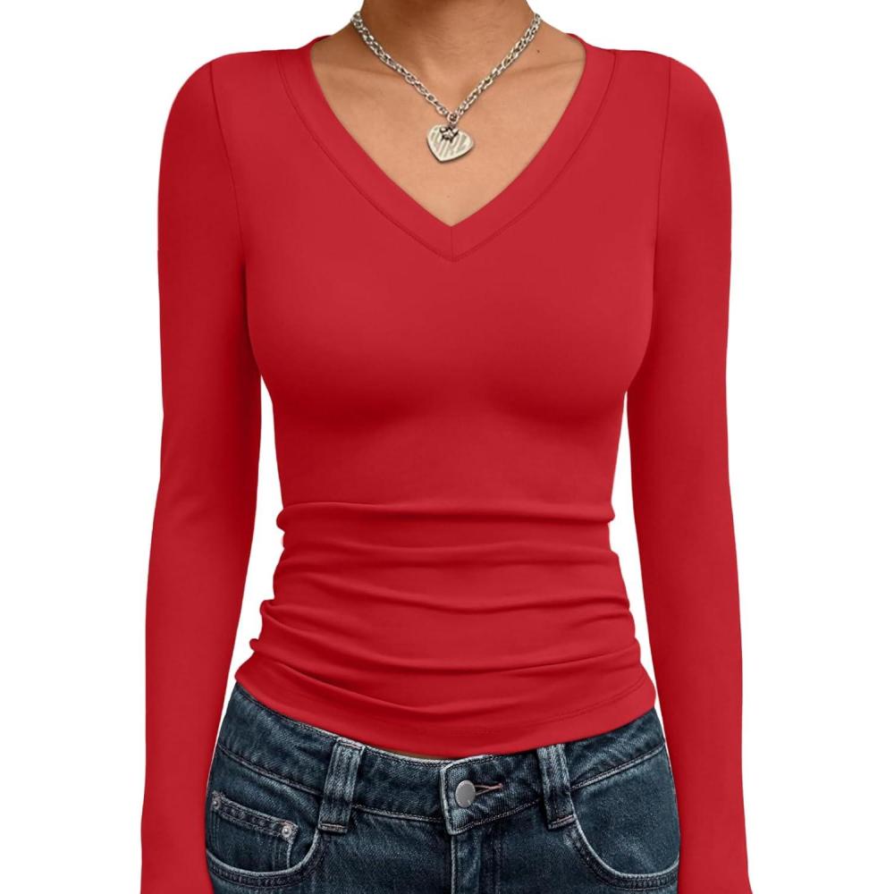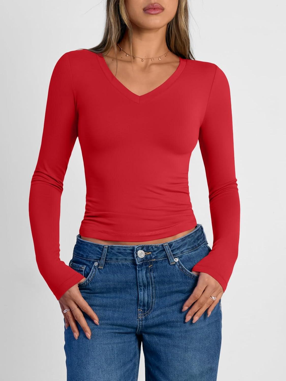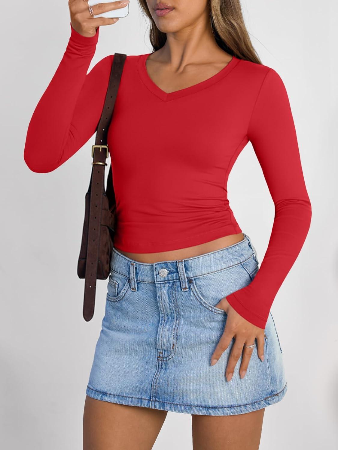 Trendy Queen Long Sleeve Shirts for Women 2025 Fall Fashion V Neck Basics Crop Tops Slim Fitted Y2K Tops Outfits Clothes(Red)