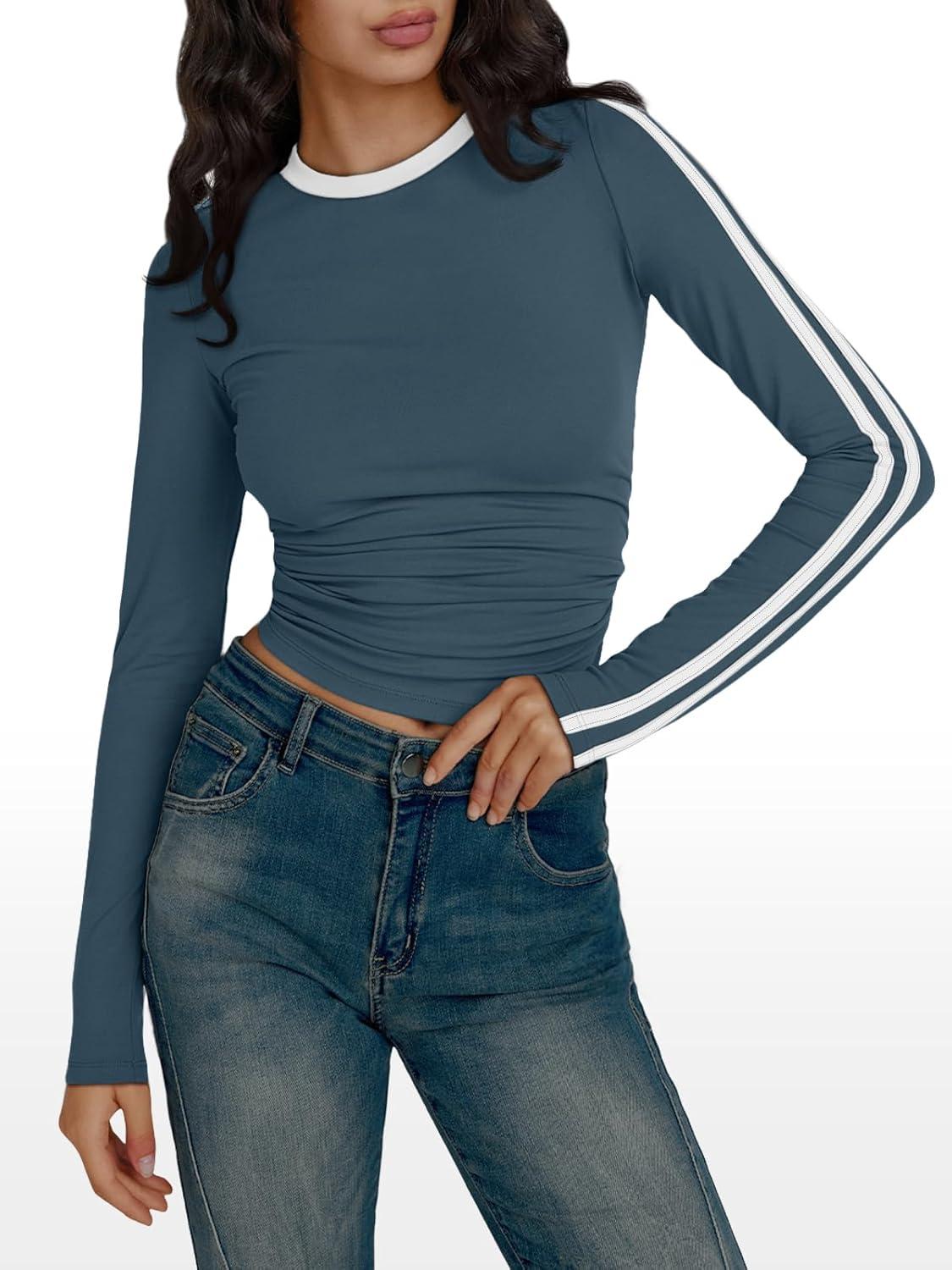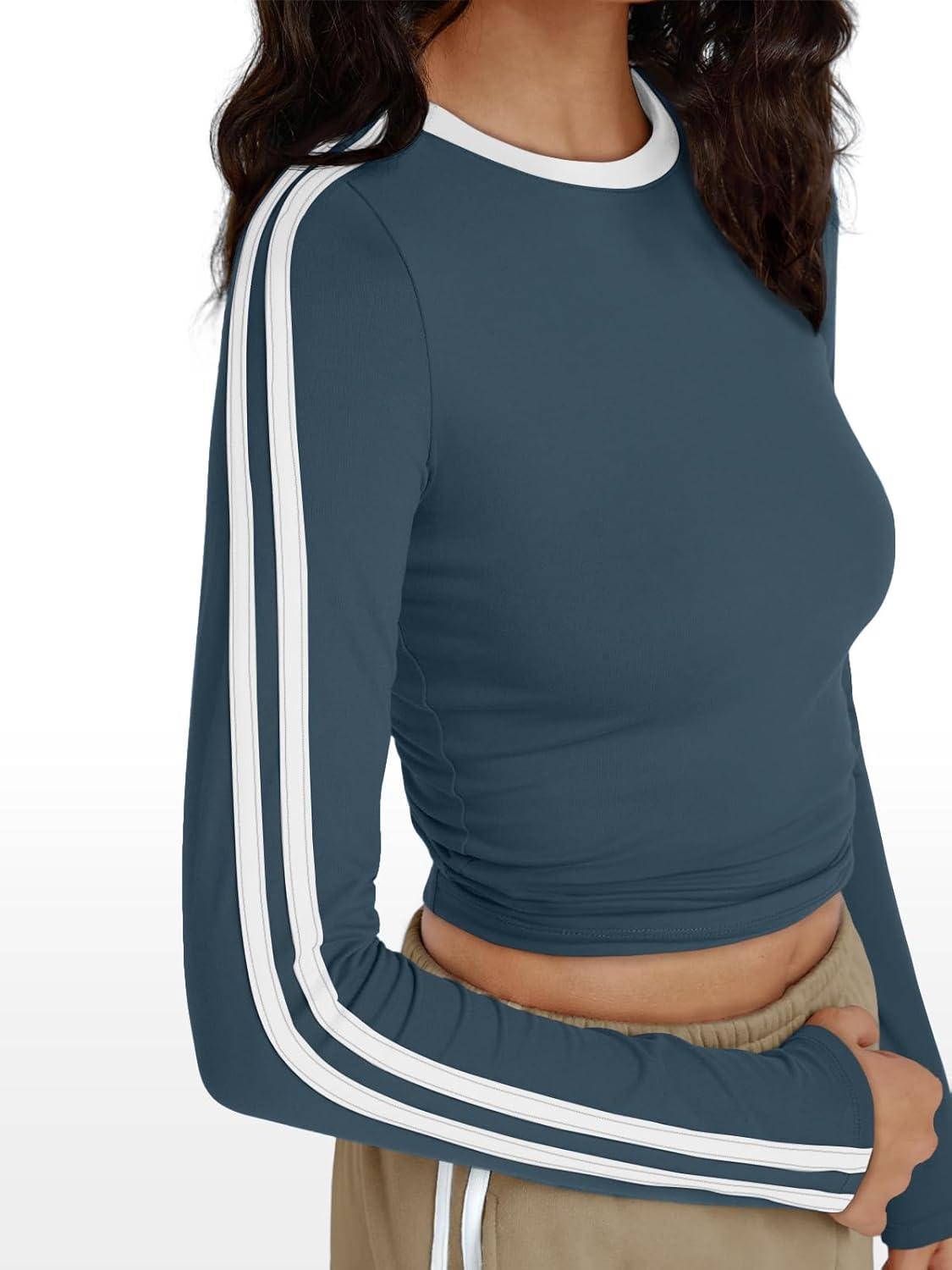 Trendy Queen Long Sleeve Workout Tops for Women Y2K Fitted Athletic Gym Shirt Trendy Color Block 2025 Fall Outfits(Haze Blue)