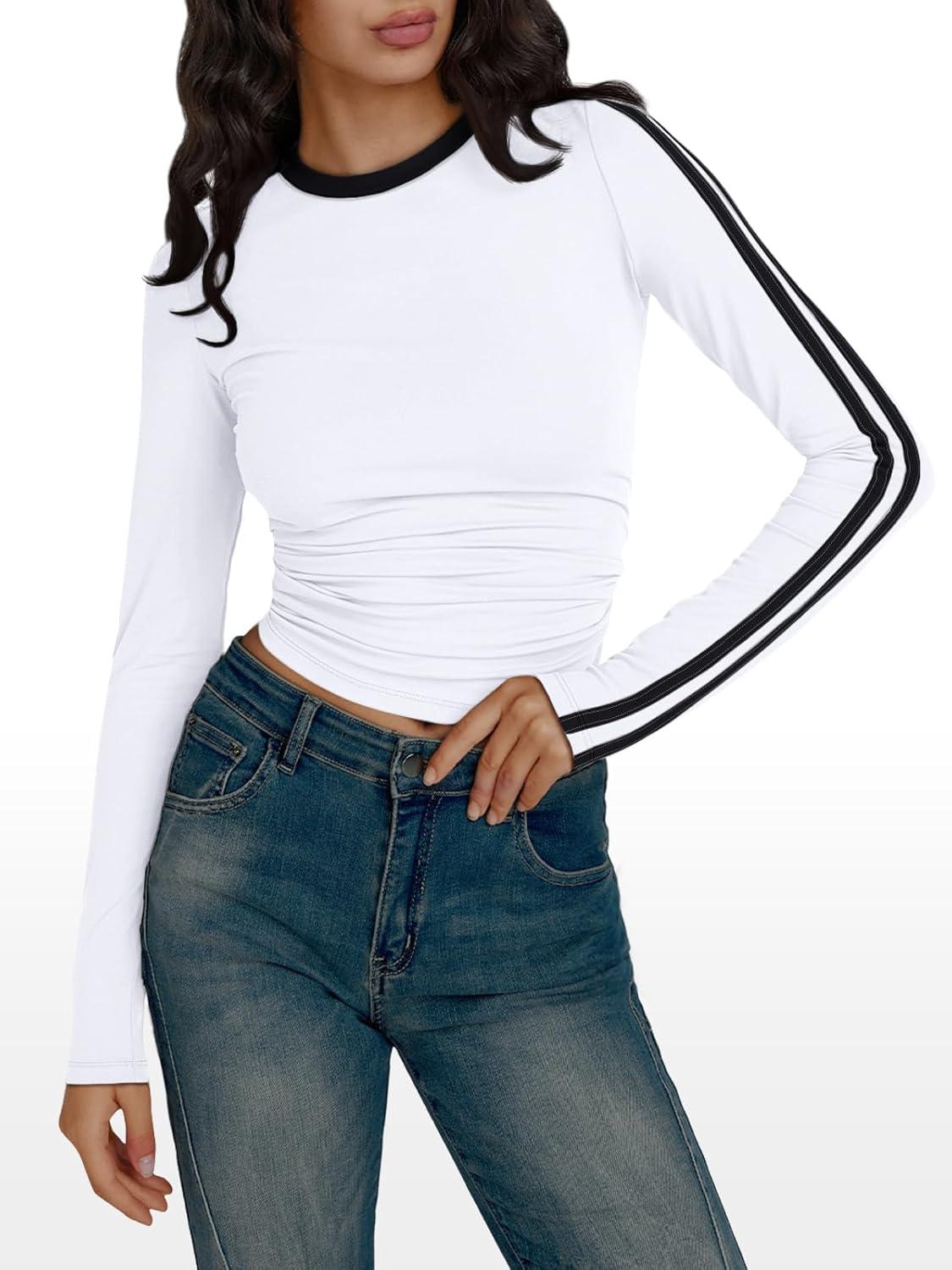 Trendy Queen Long Sleeve Workout Tops for Women Y2K Fitted Athletic Gym Shirt Trendy Color Block 2025 Fall Outfits(White)