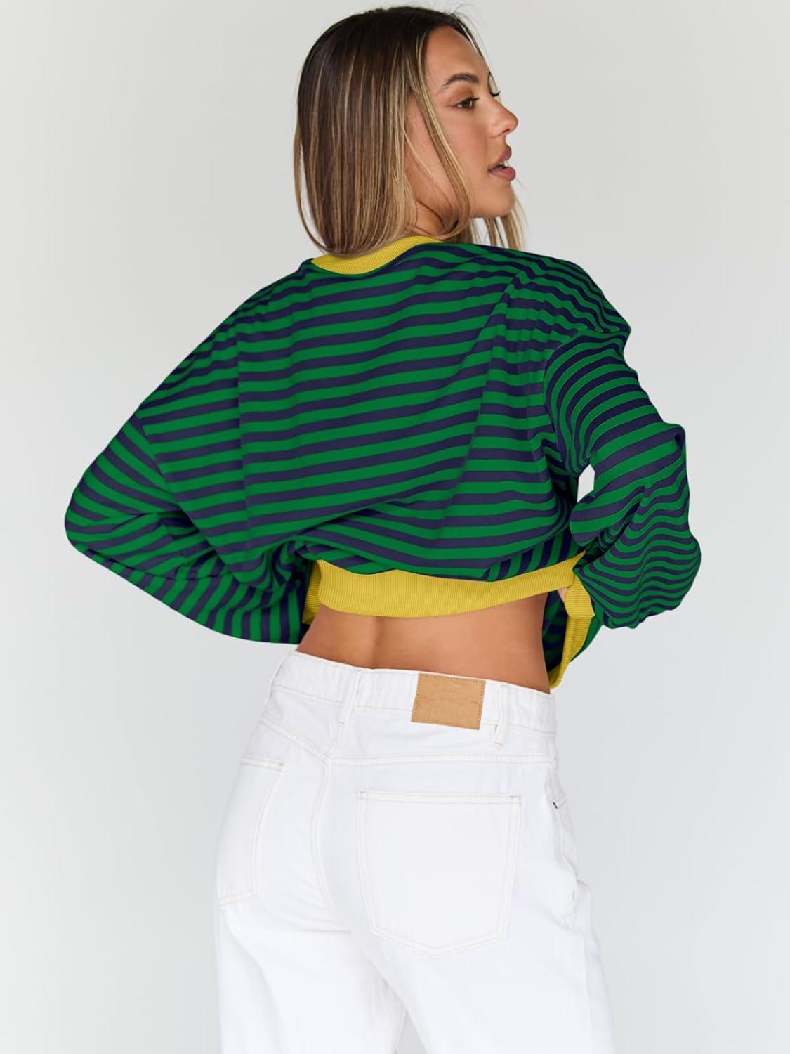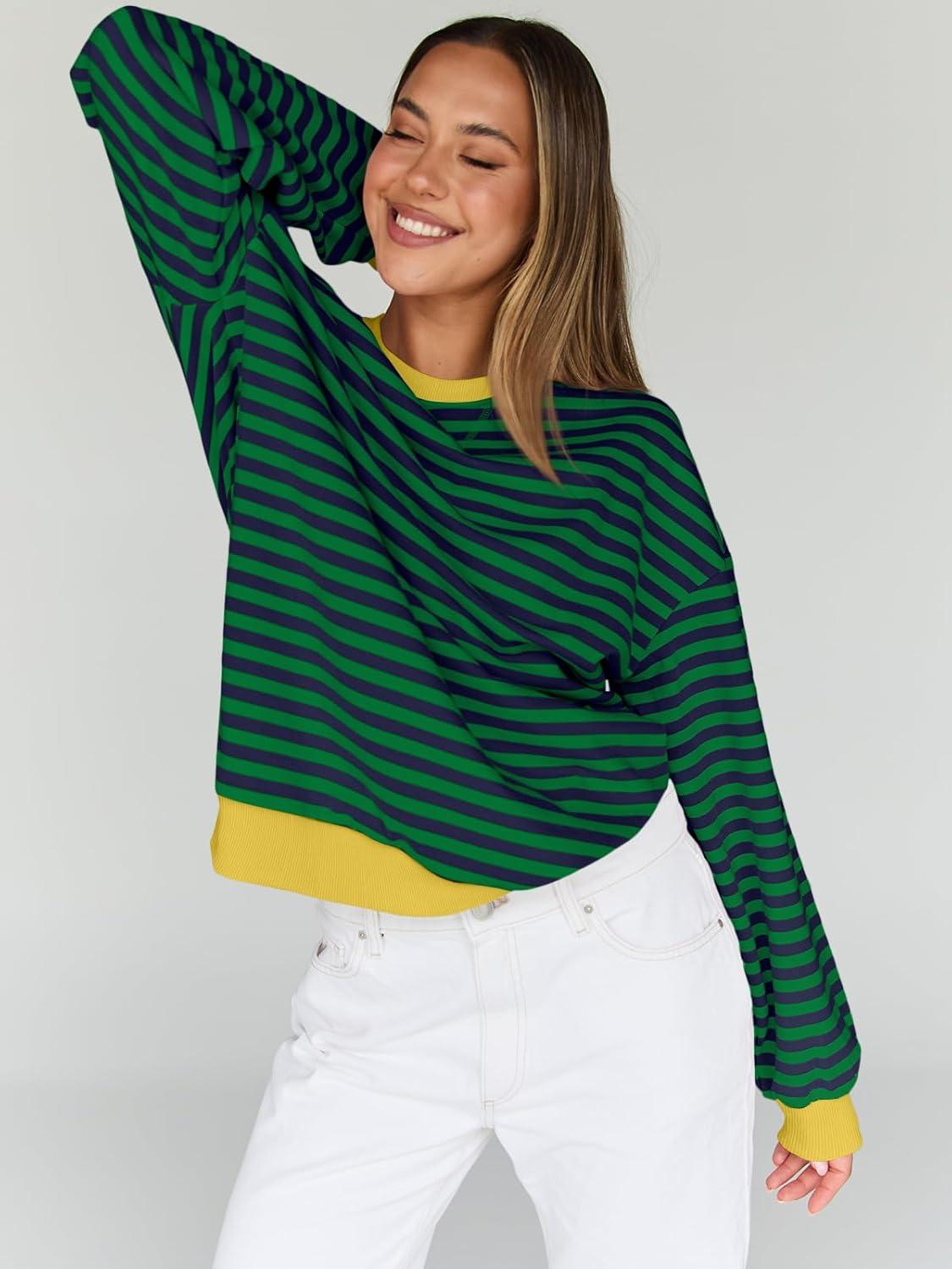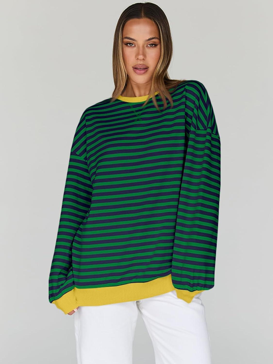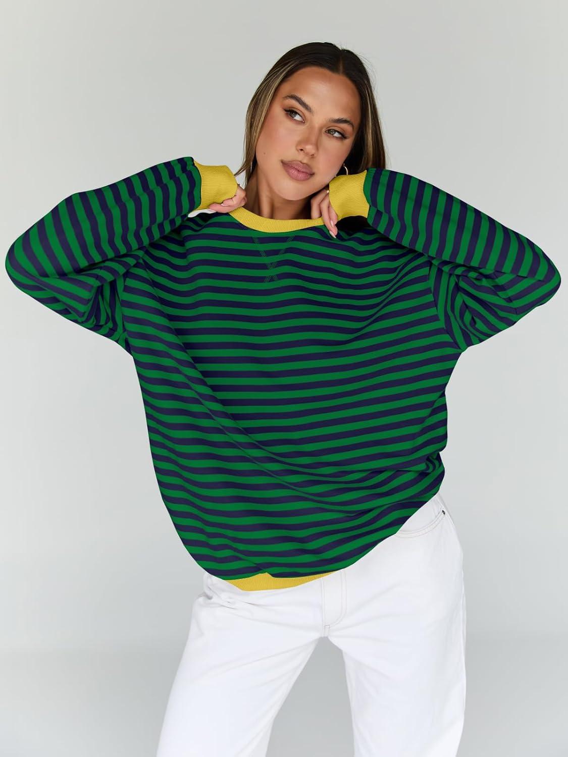 Trendy Queen Oversized Sweatshirt for Women 2025 Fall Crewneck Striped Long Sleeve Shirts Hoodies Cute Top Y2K Outfits(Bluegreen)