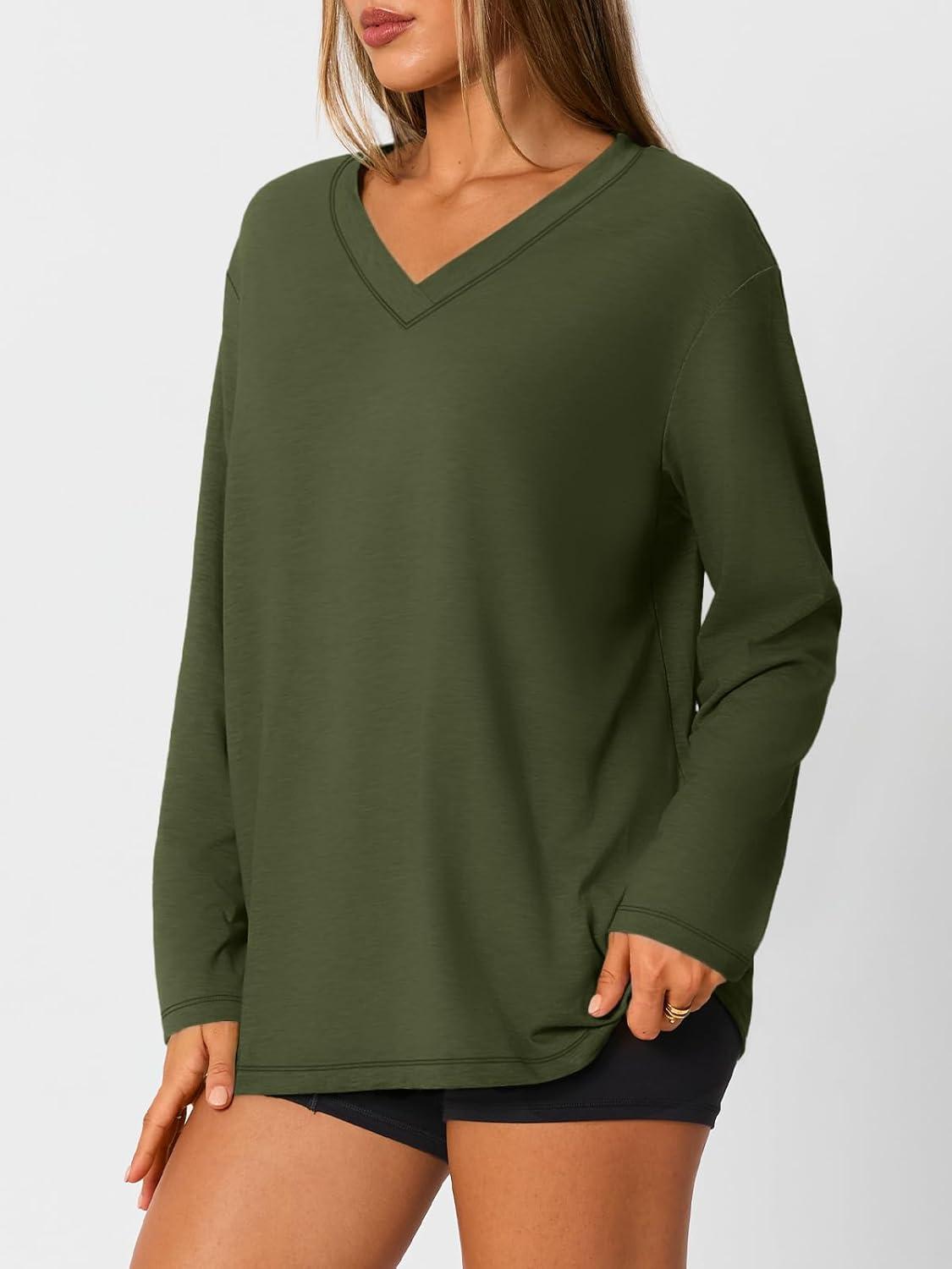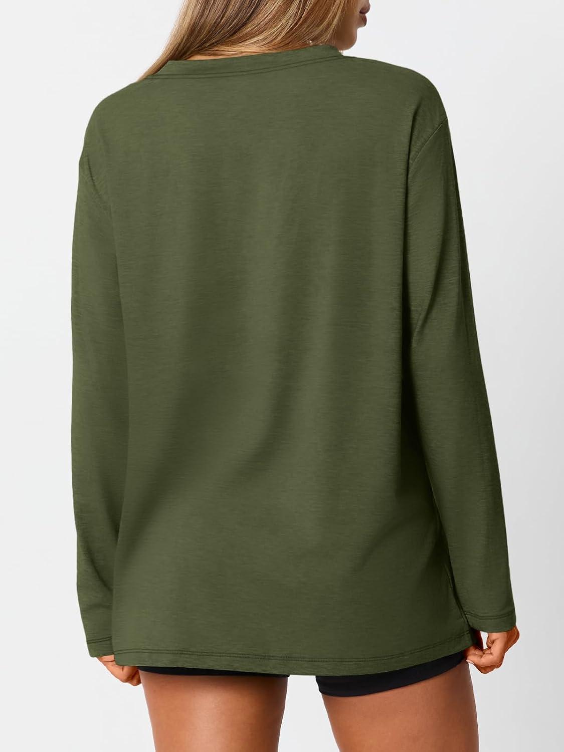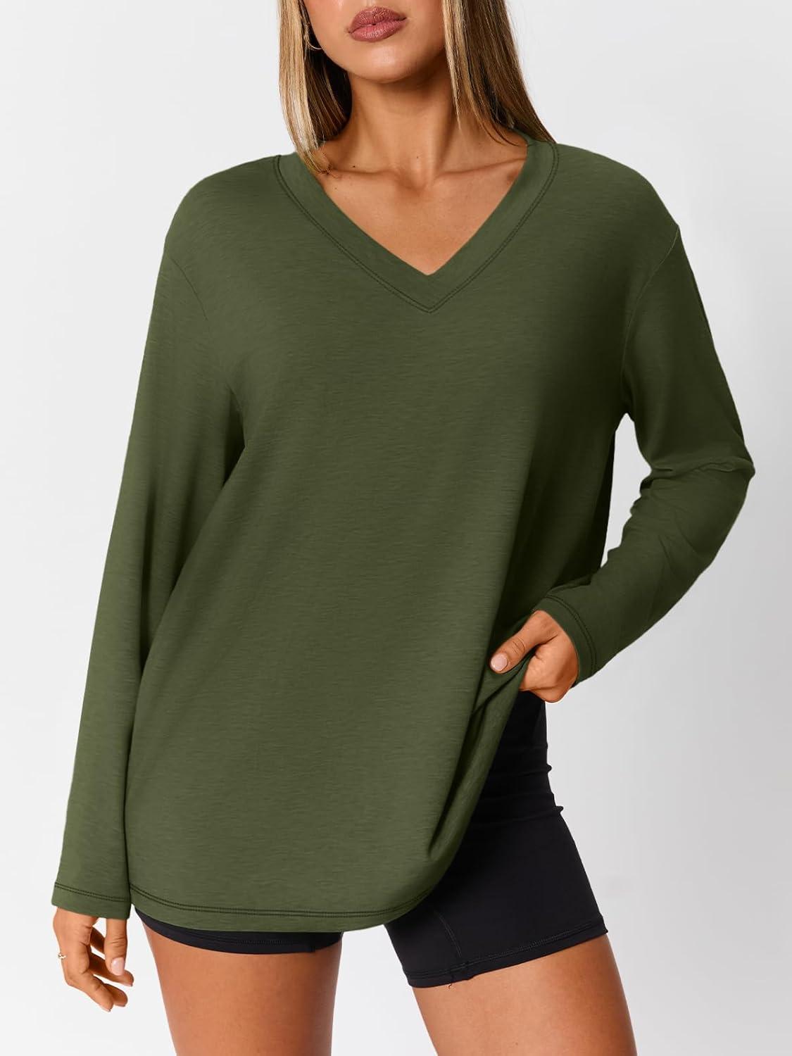 Trendy Queen Oversized Tshirts for Women Workout Plus Size Gym Tops V Neck Long Sleeve T Shirts Spring Casual Basic Tees(Army Green)