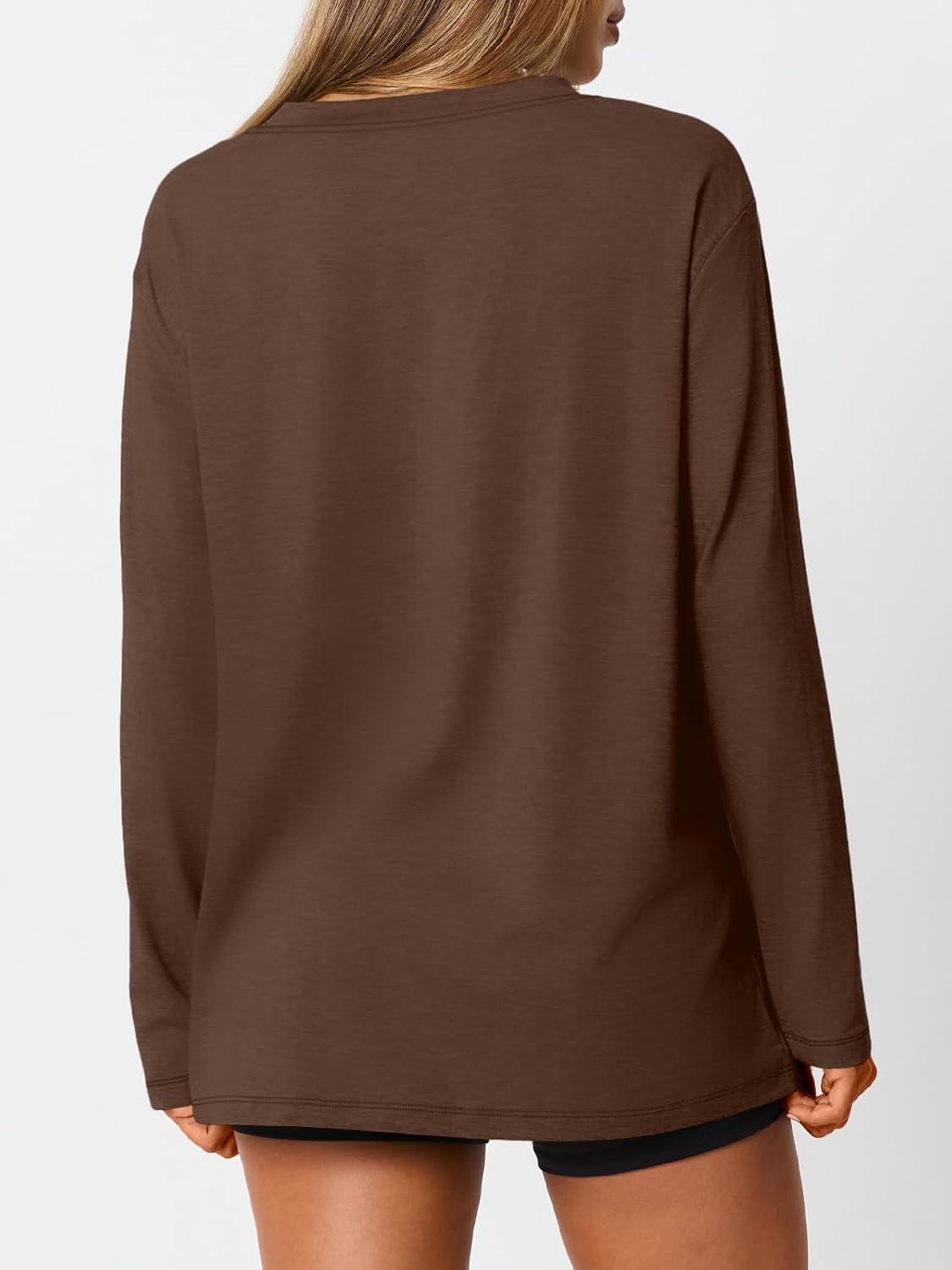 Trendy Queen Oversized Tshirts for Women Workout Plus Size Gym Tops V Neck Long Sleeve T Shirts Spring Casual Basic Tees(Coffee)