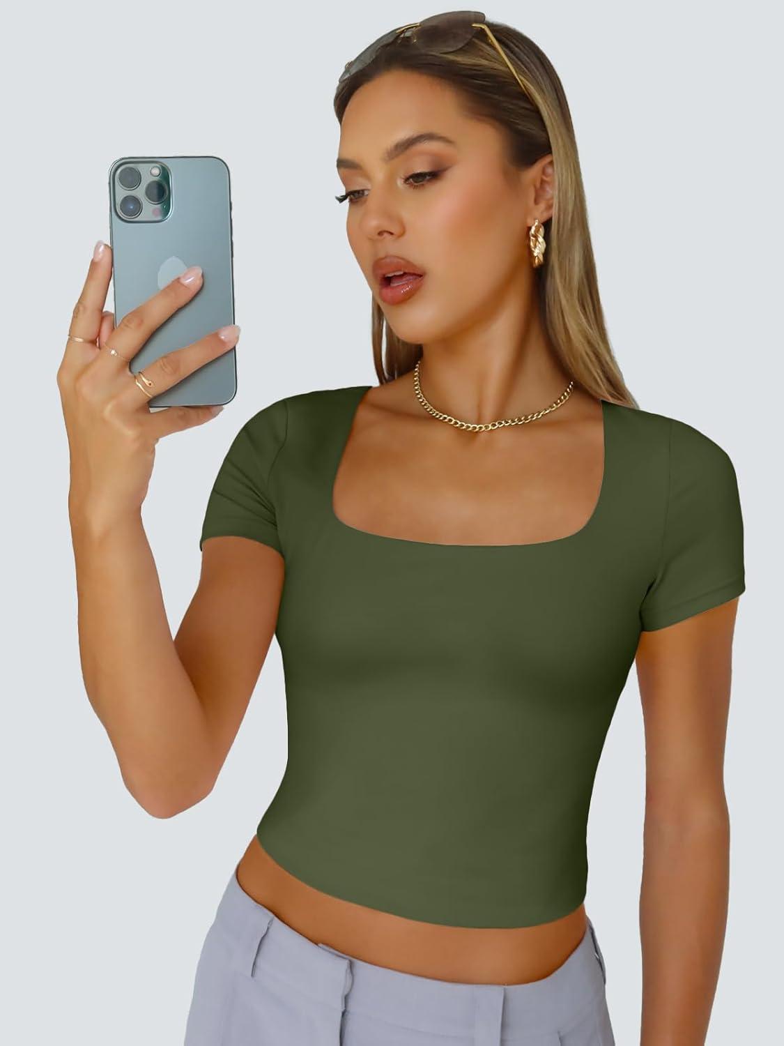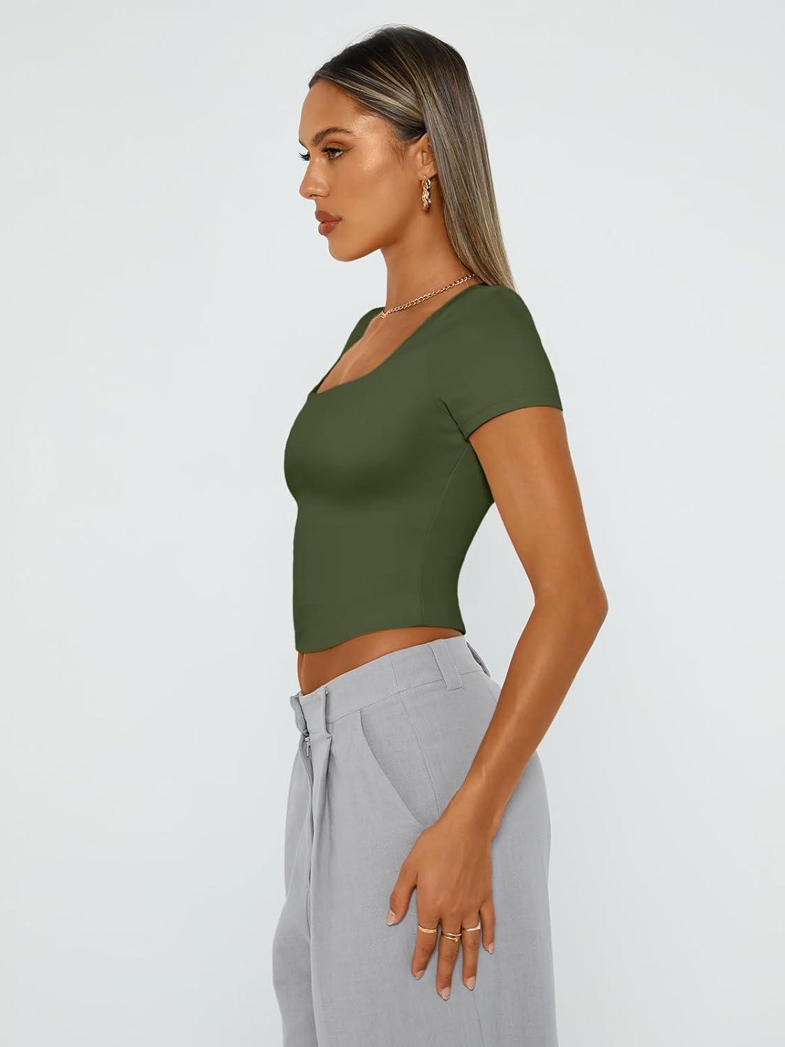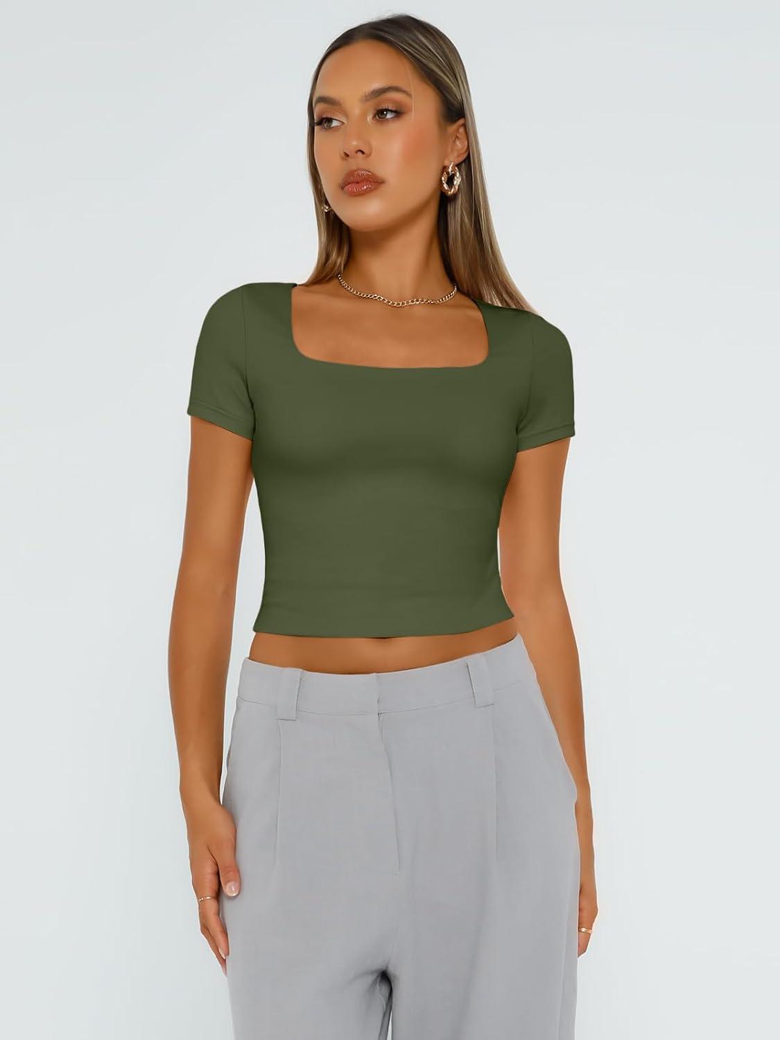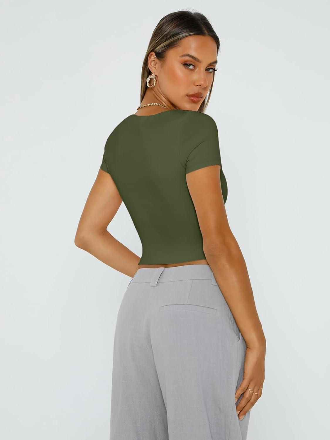 Trendy Queen Tshirts Shirts for Women Double Lined Going Out Crop Tops 2025 Spring Summer Workout Y2k Clothes Beach Fashion(Armygreen)