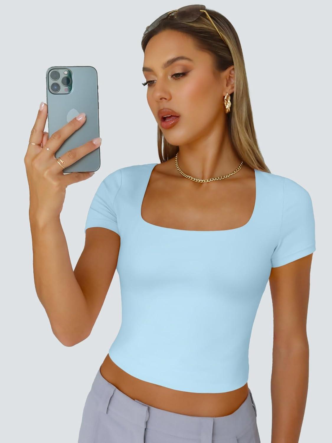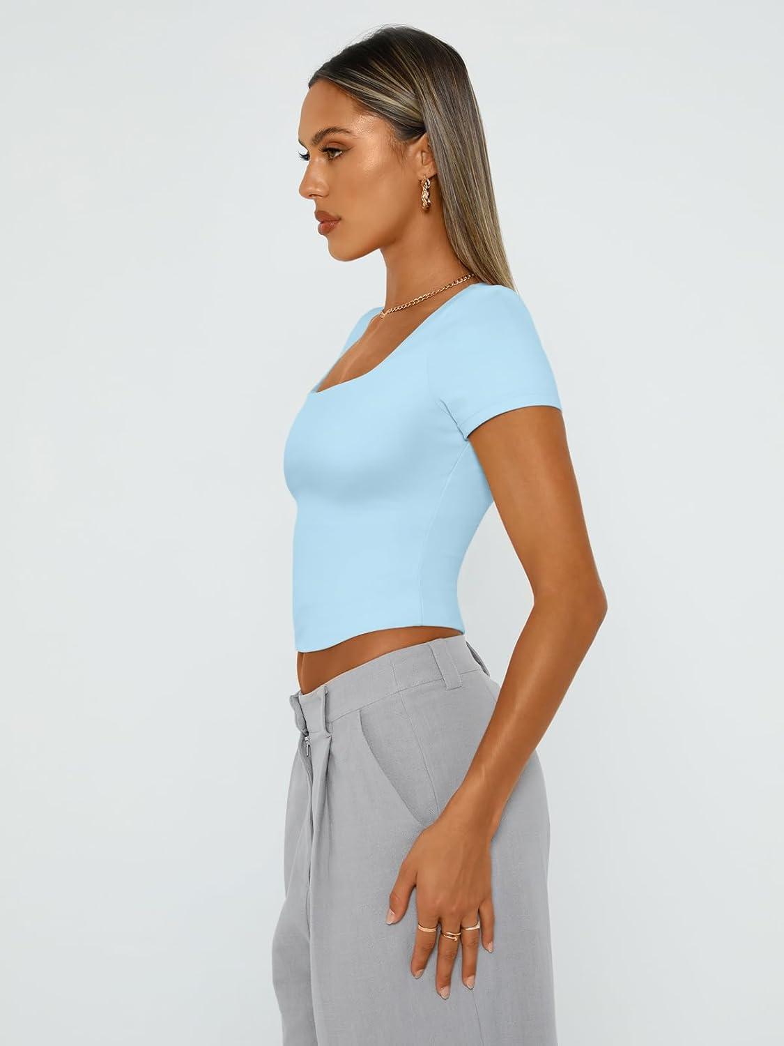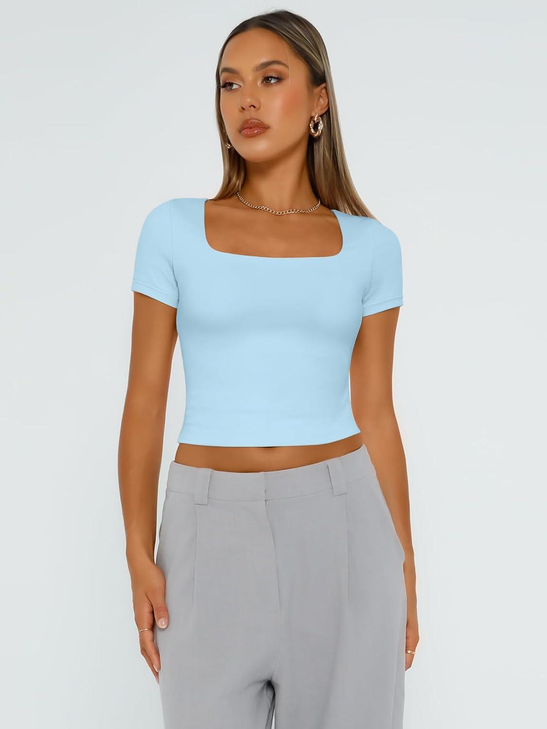 Trendy Queen Tshirts Shirts for Women Double Lined Going Out Crop Tops 2025 Spring Summer Workout Y2k Clothes Beach Fashion(Babyblue)