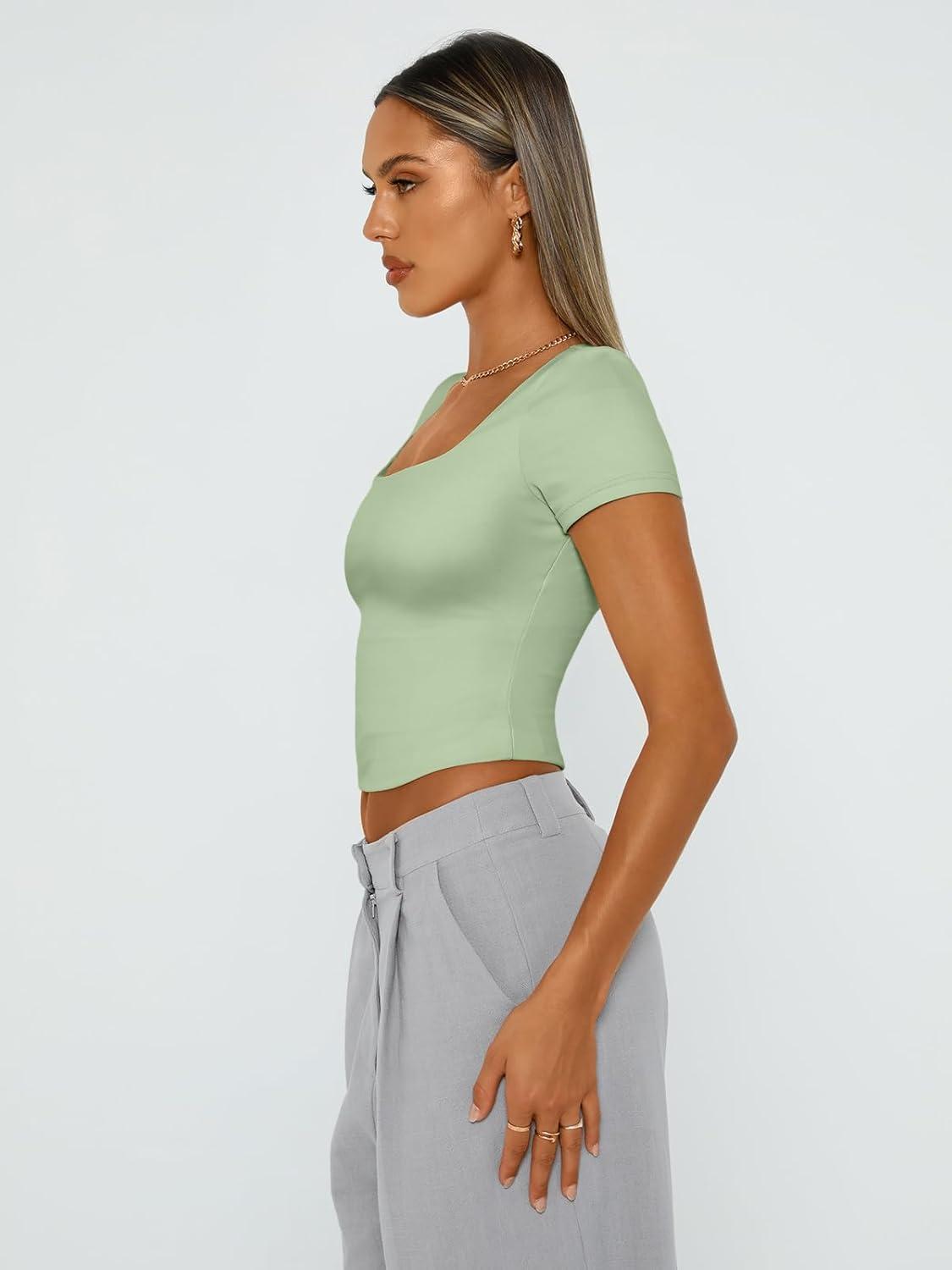 Trendy Queen Tshirts Shirts for Women Double Lined Going Out Crop Tops 2025 Spring Summer Workout Y2k Clothes Beach Fashion(Green)