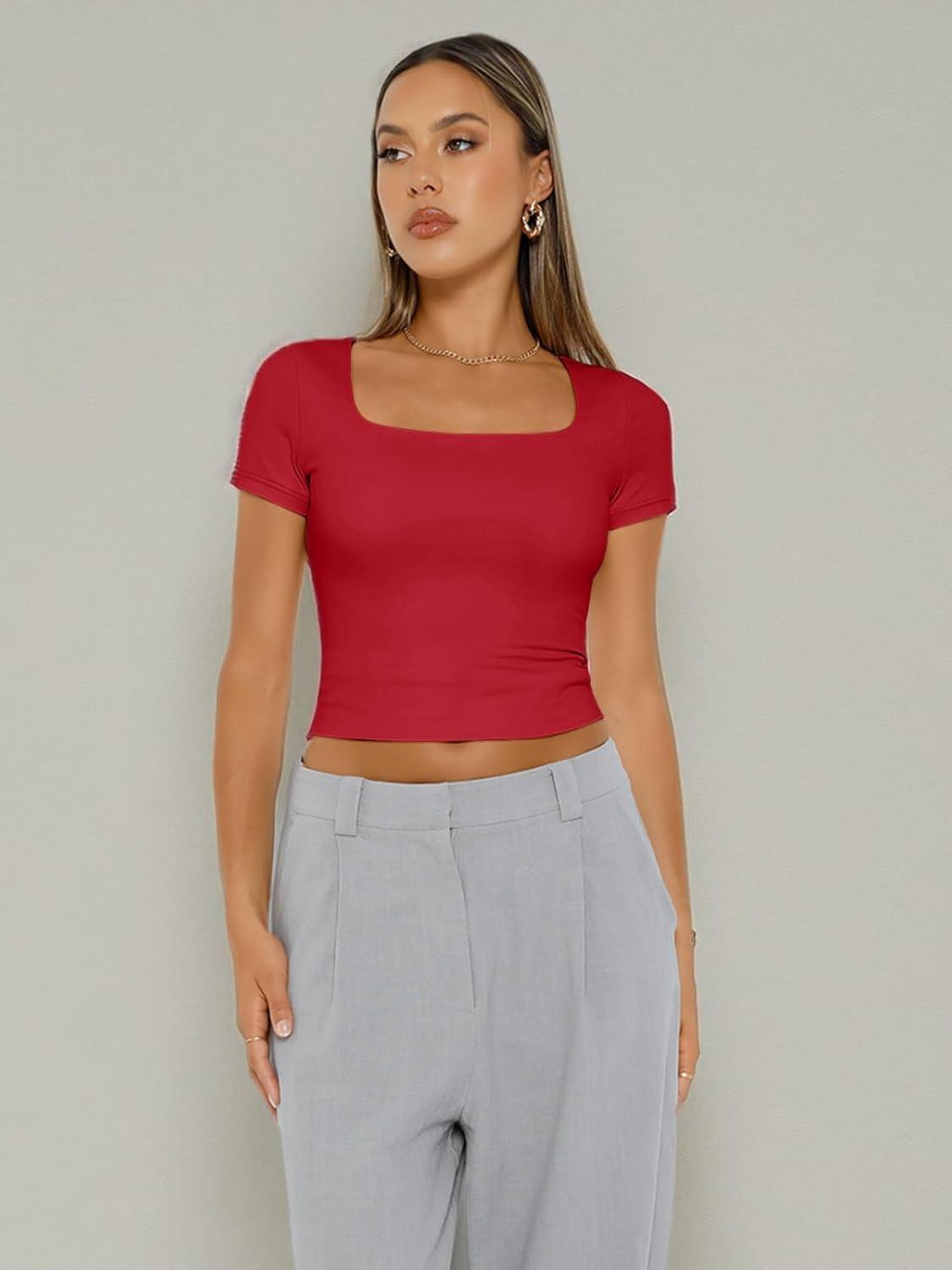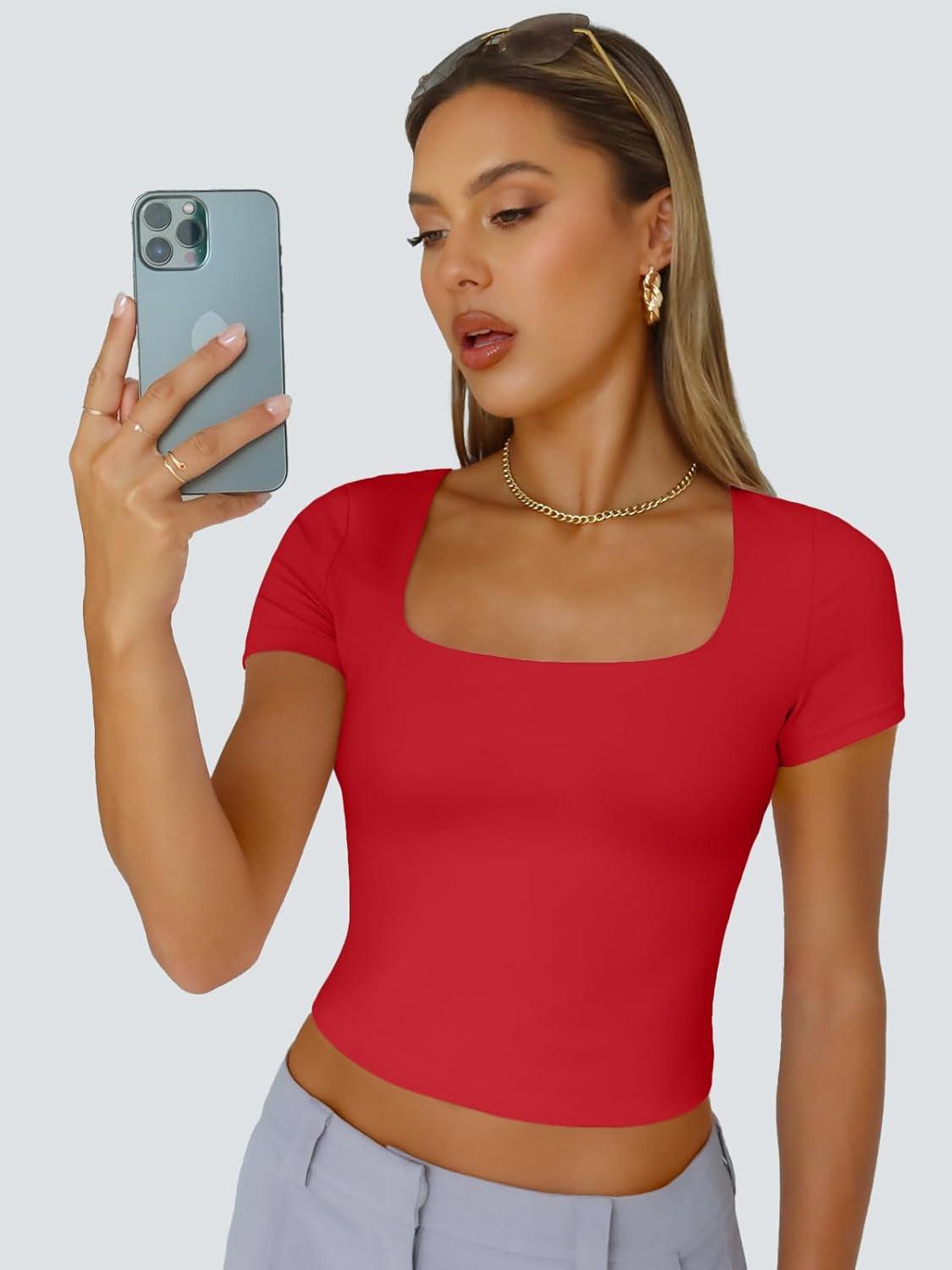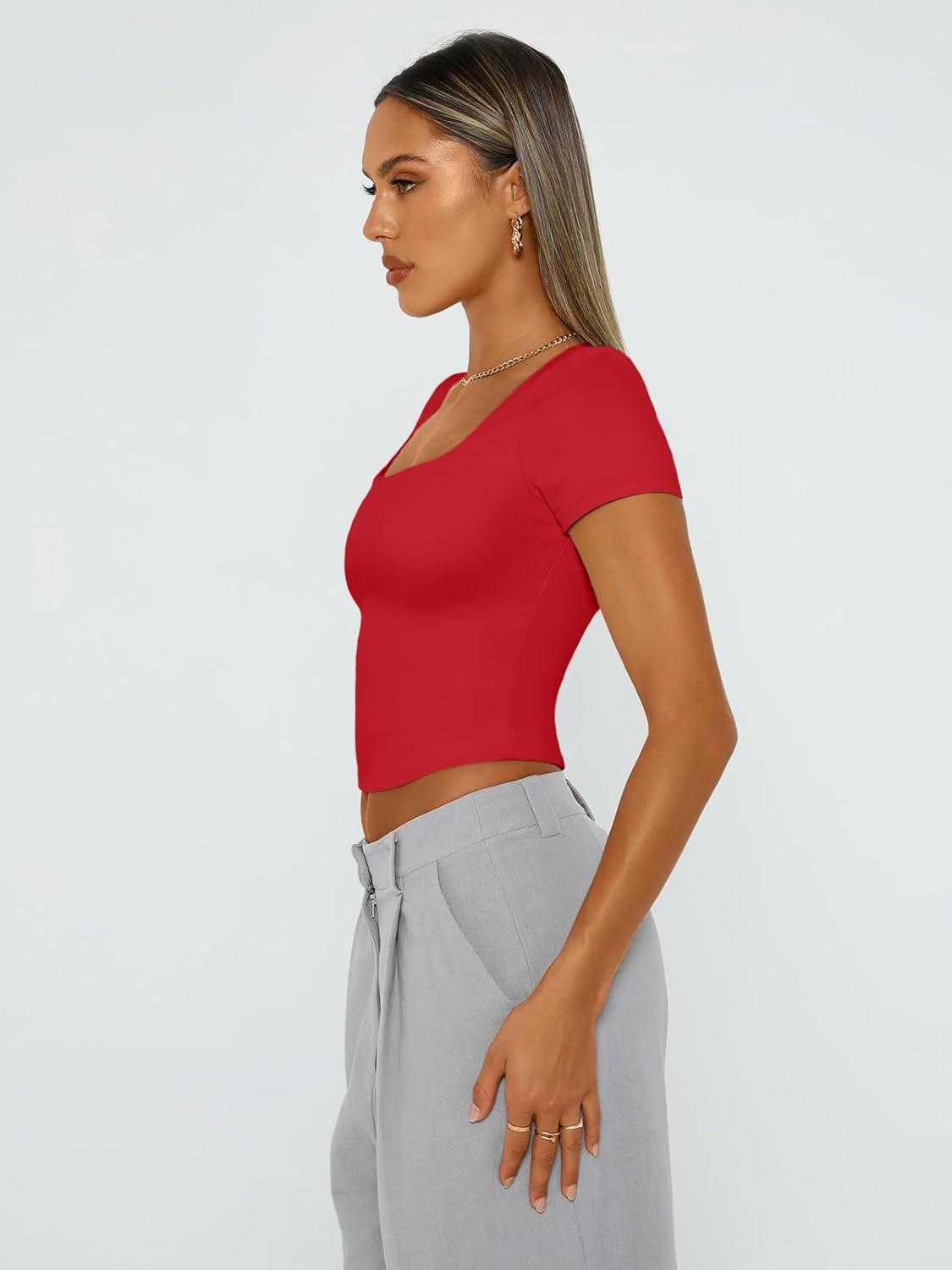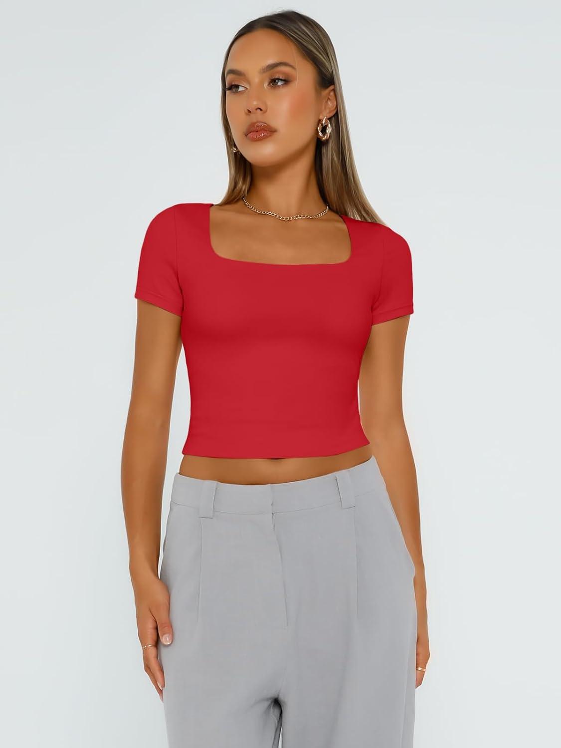 Trendy Queen Tshirts Shirts for Women Double Lined Going Out Crop Tops 2025 Spring Summer Workout Y2k Clothes Beach Fashion(Red)