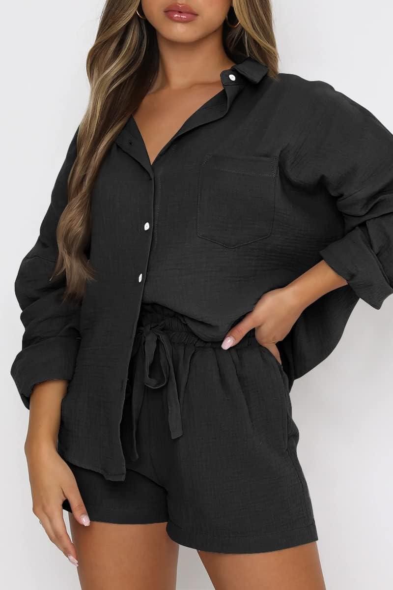 Trendy Queen Two Piece Sets For Women Summer Short Sets Beach Vcation Lounge Pajama 2 Piece Spring Outfits Fashion 2025(Black)