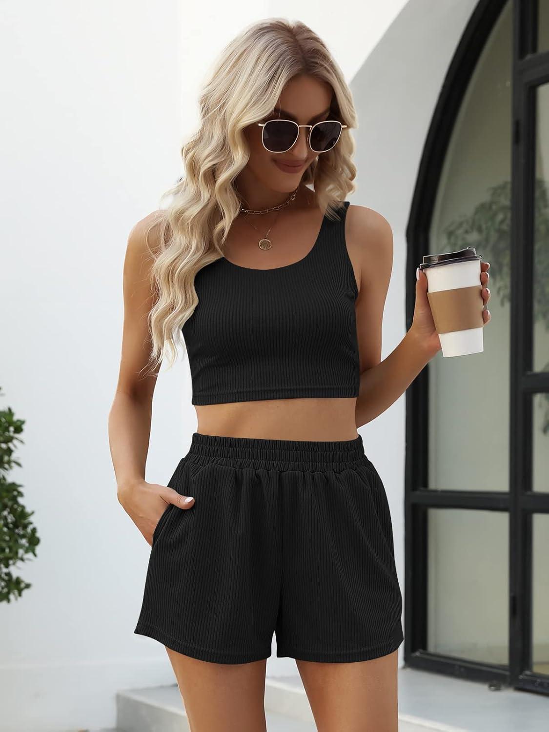 Trendy Queen Two Piece Summer Outfits 2 Piece Sets 2025 Sleeveless Matching Lounge Crop Top High Waisted Short(Black)