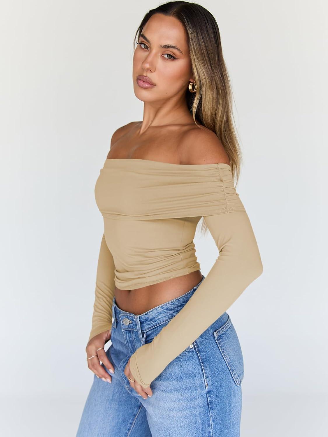 Trendy Queen Women Long Sleeve Shirts Off Shoulder Tops Going Out Crop Sexy Slim Fitted Y2K Fall Outfits 2025 Fashion Clothes(Apricot)