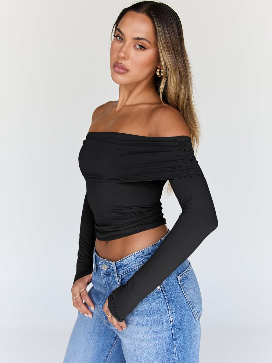 Trendy Queen Women Long Sleeve Shirts Off Shoulder Tops Going Out Crop Sexy Slim Fitted Y2K Fall Outfits 2025 Fashion Clothes(Black)