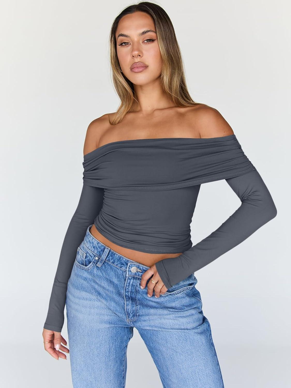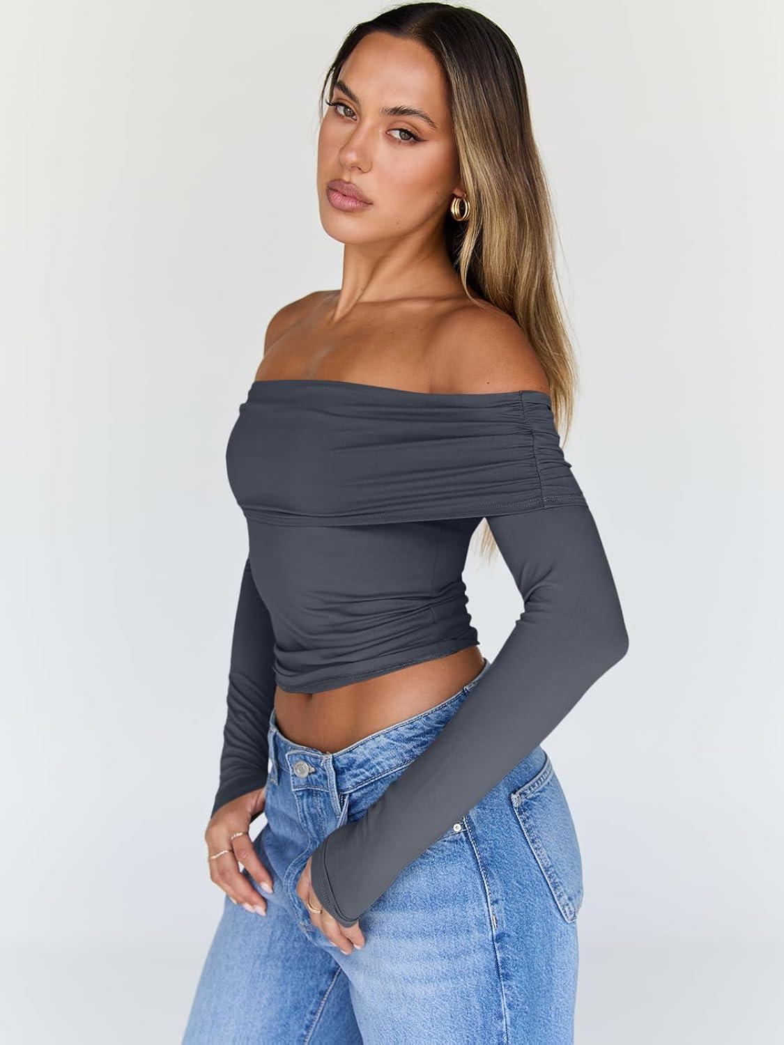 Trendy Queen Women Long Sleeve Shirts Off Shoulder Tops Going Out Crop Sexy Slim Fitted Y2K Fall Outfits 2025 Fashion Clothes(Grey)