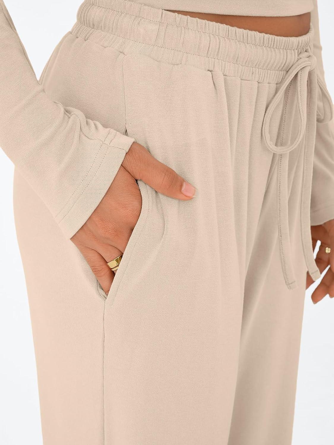 Trendy Queen Women’s 2 Piece Matching Lounge Set Long Sleeve Slightly Crop Top Wide Leg Pants Casual Sweatsuit(Almond)