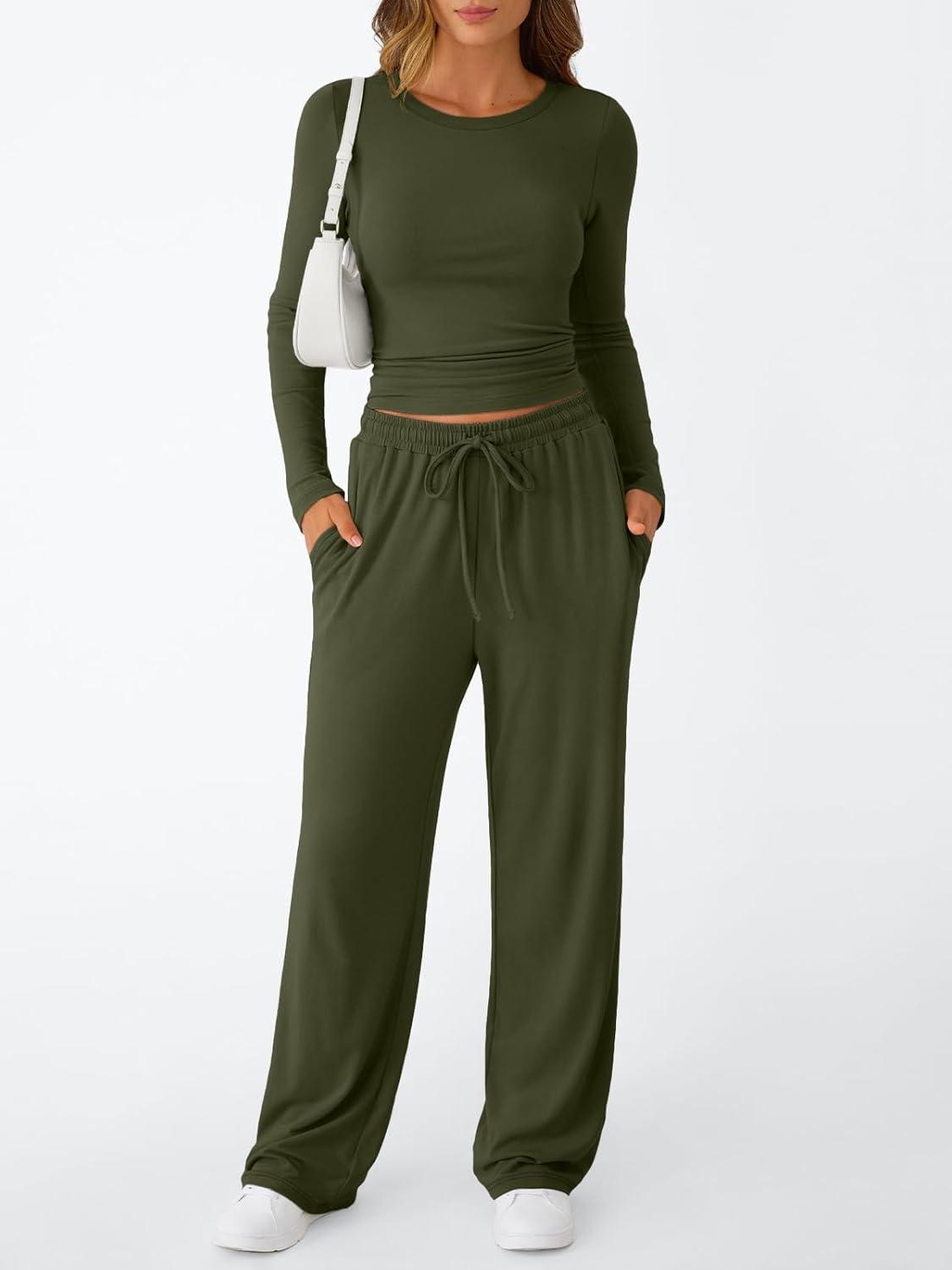 Trendy Queen Women’s 2 Piece Matching Lounge Set Long Sleeve Slightly Crop Top Wide Leg Pants Casual Sweatsuit(Army Green)