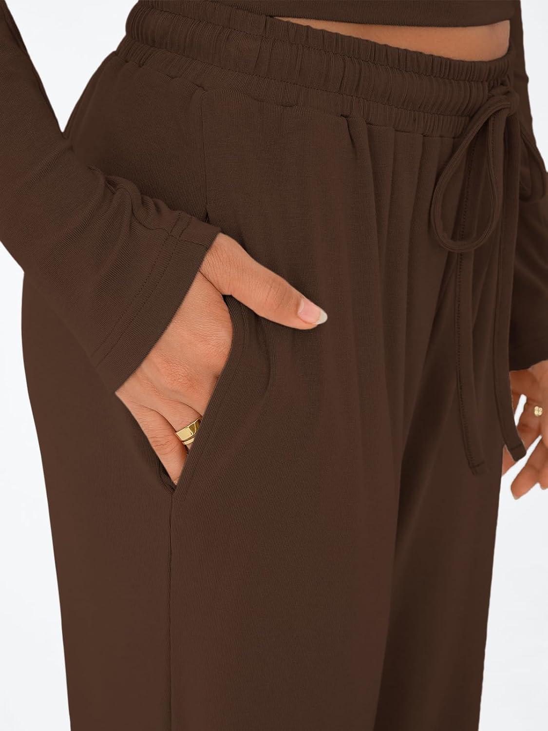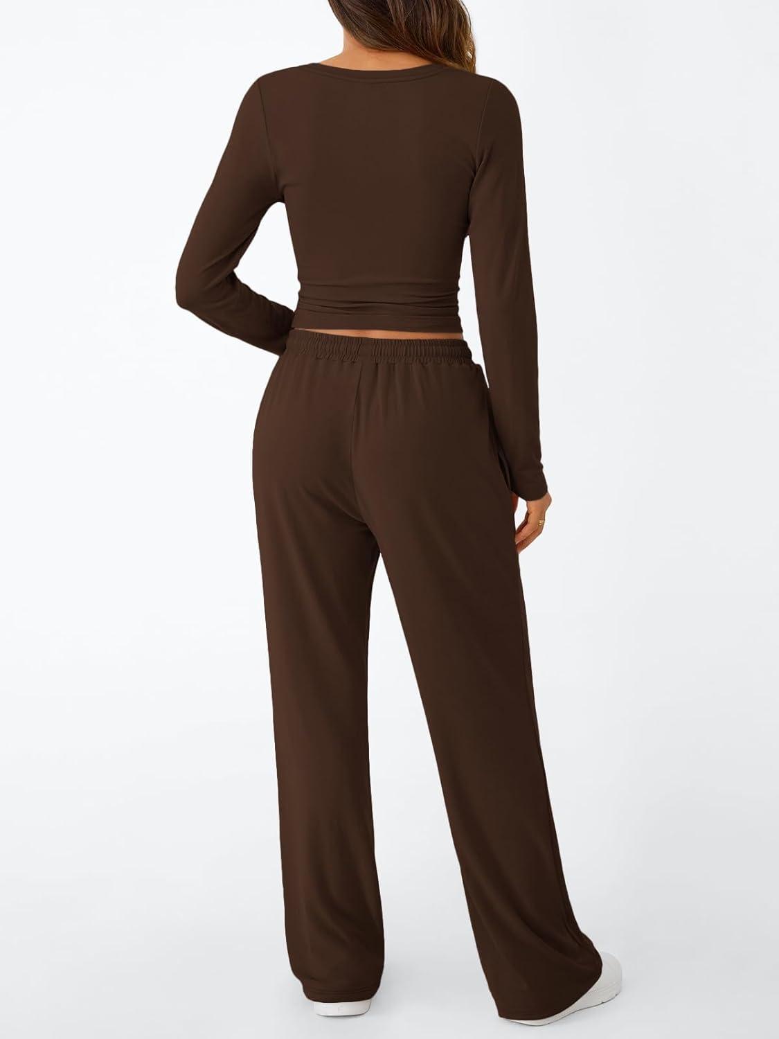 Trendy Queen Women’s 2 Piece Matching Lounge Set Long Sleeve Slightly Crop Top Wide Leg Pants Casual Sweatsuit(Coffee)