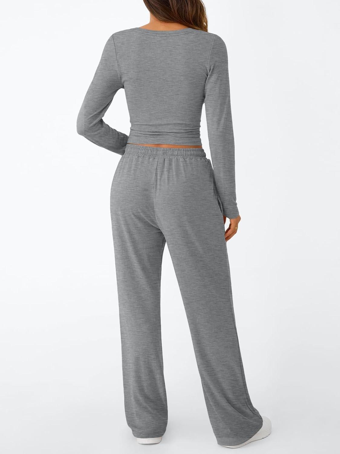 Trendy Queen Women’s 2 Piece Matching Lounge Set Long Sleeve Slightly Crop Top Wide Leg Pants Casual Sweatsuit(Dark Heather Grey)