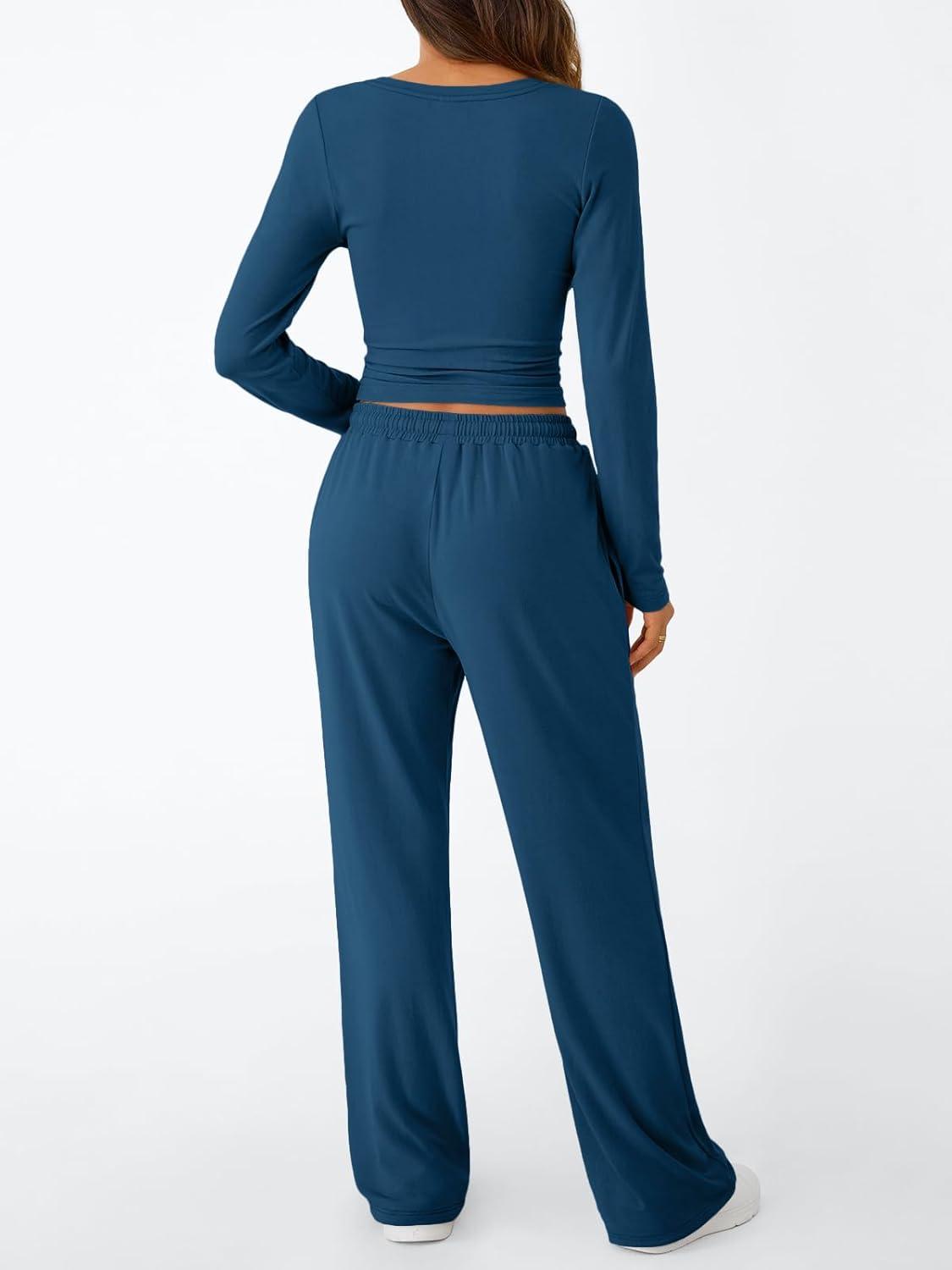 Trendy Queen Women’s 2 Piece Matching Lounge Set Long Sleeve Slightly Crop Top Wide Leg Pants Casual Sweatsuit(Marine)