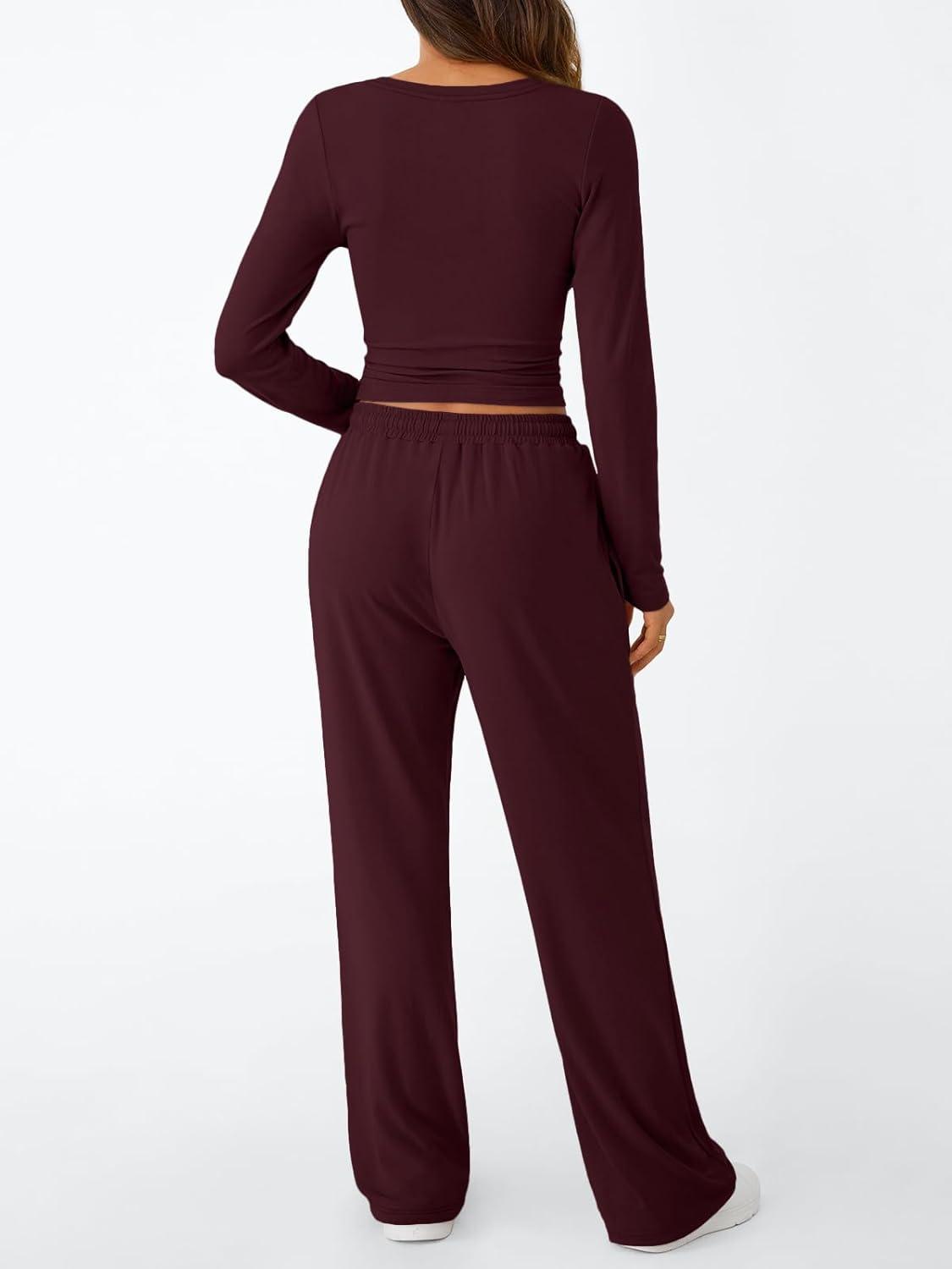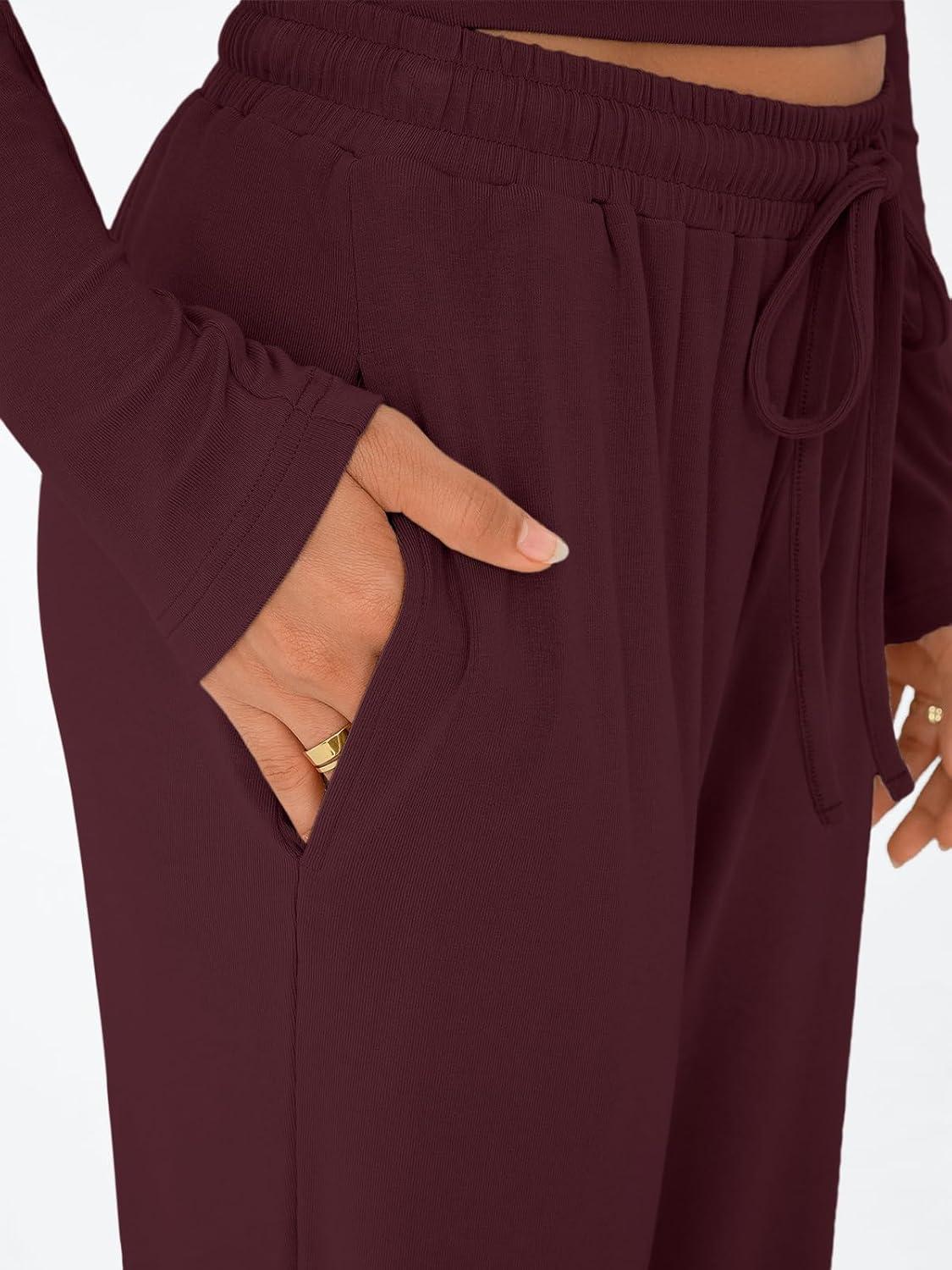Trendy Queen Women’s 2 Piece Matching Lounge Set Long Sleeve Slightly Crop Top Wide Leg Pants Casual Sweatsuit(Wine)