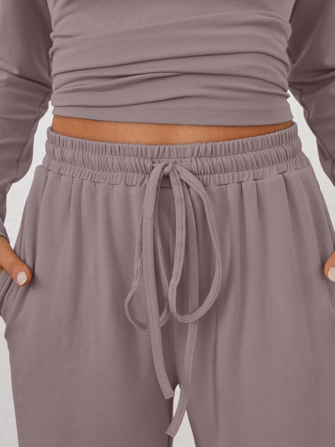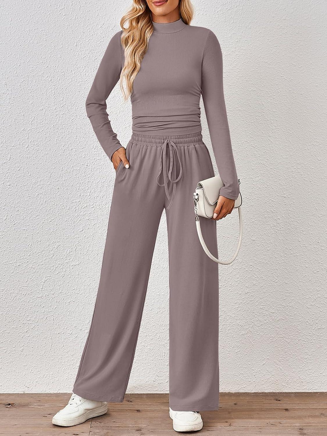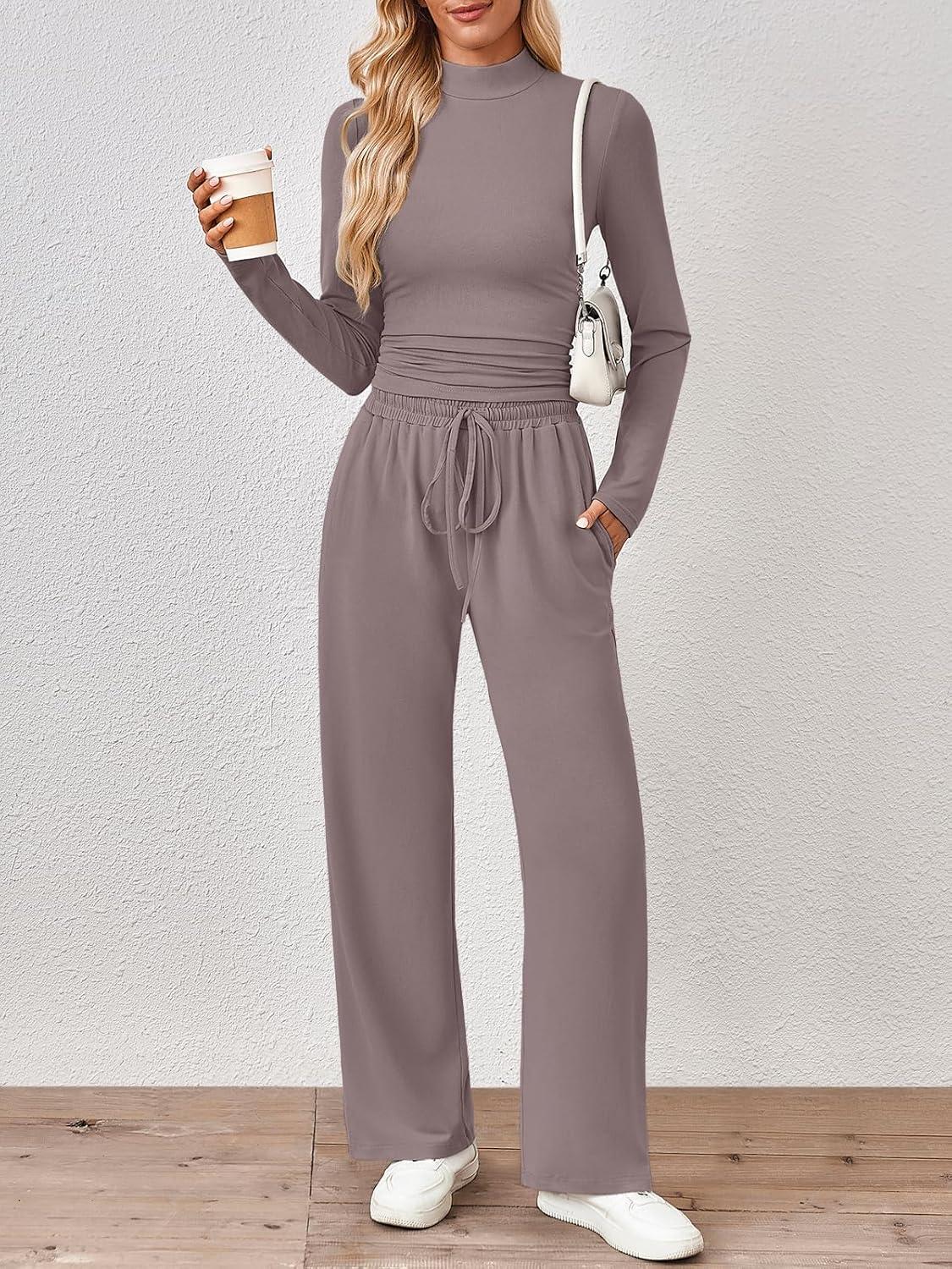 Trendy Queen Womens 2 Piece Matching Lounge Set Mock Turtleneck Top Wide Leg Pants Casual Sweatsuit with Pockets(Nutmeg)