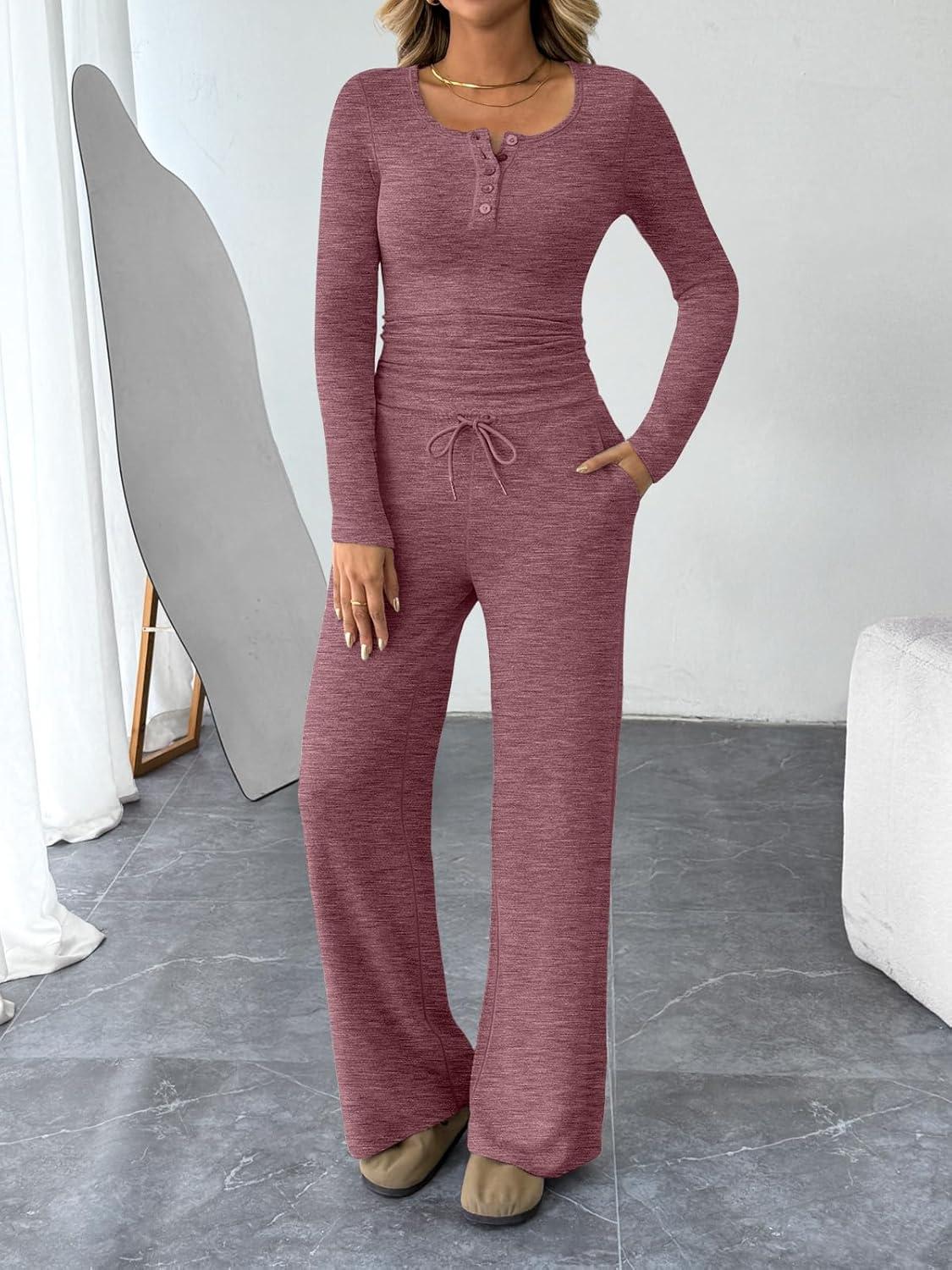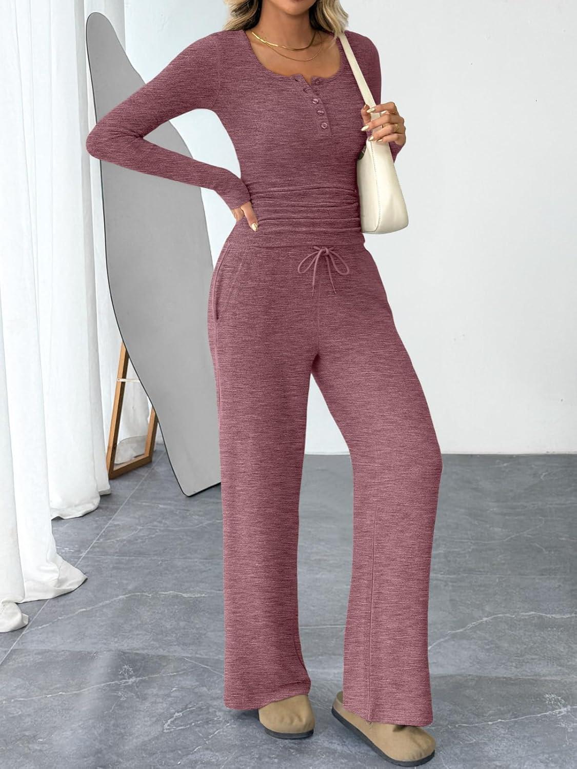 Trendy Queen Women’s 2 Piece Matching Lounge Sets Fall Fashion Outfits Henley Neck Sweater Top Wide Leg Pants Sweat Suits(Wine)