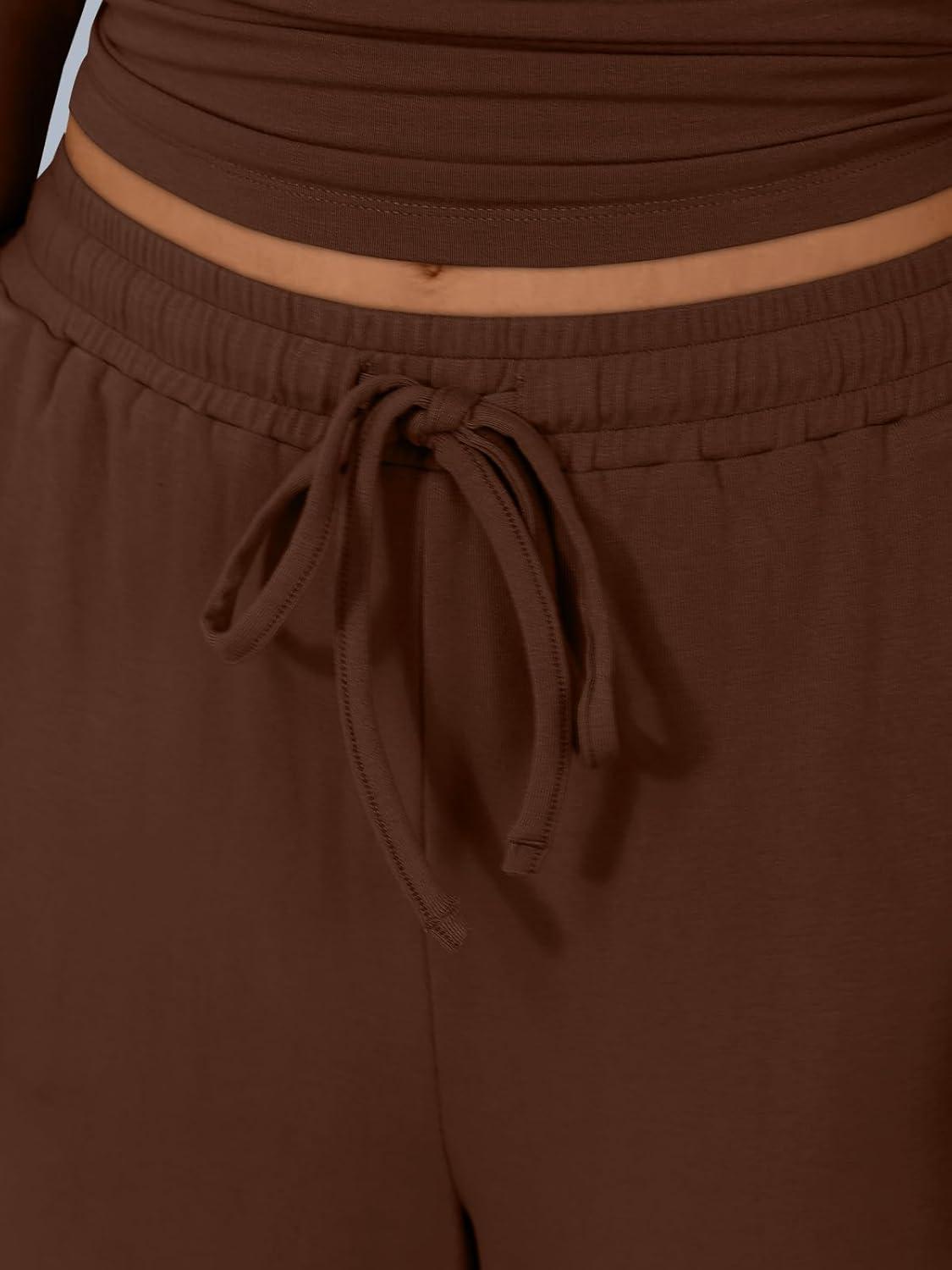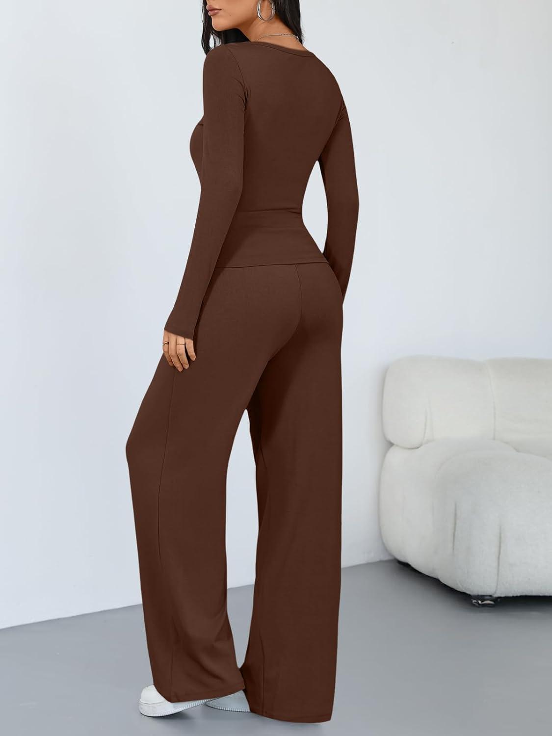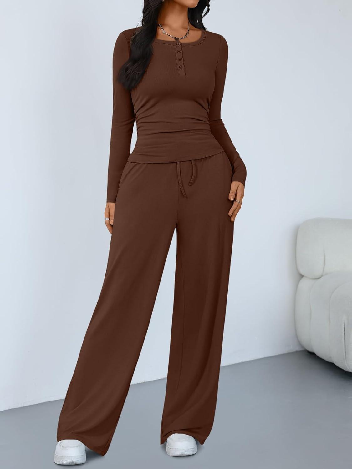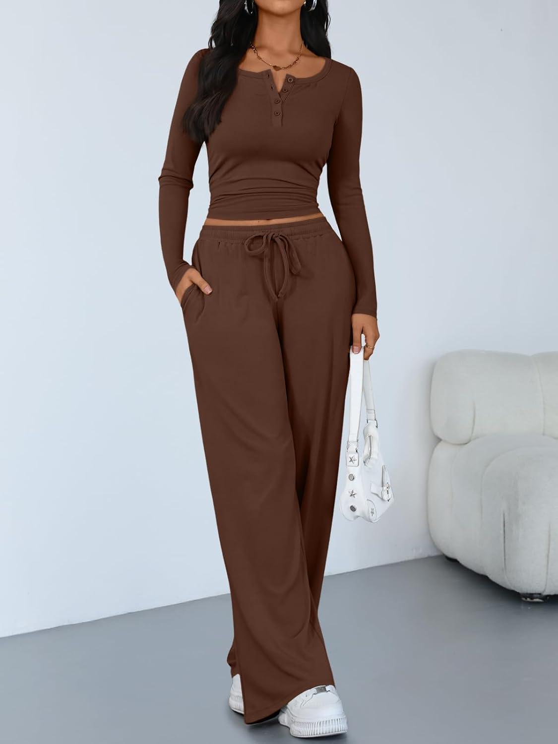Trendy Queen Women’s 2 Piece Matching Lounge Sets Long Sleeve Henley Neck Slightly Crop Top Wide Leg Pants Casual Sweat Suit(Cocoa)