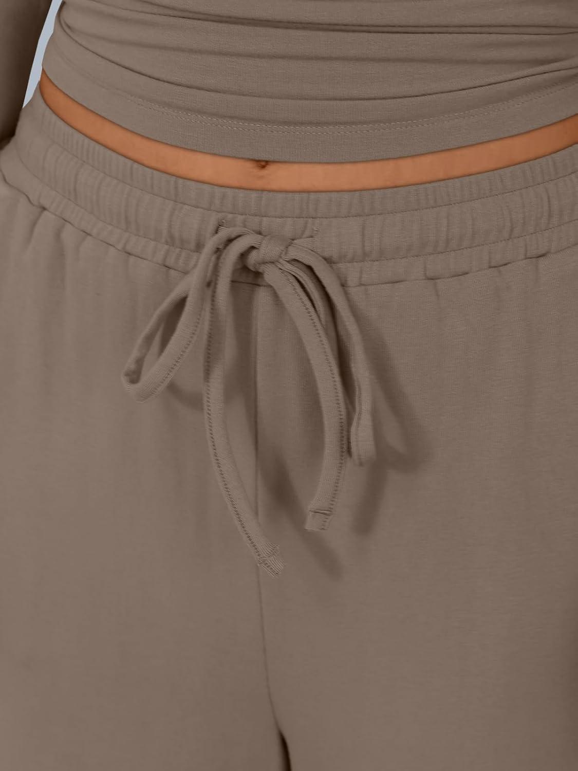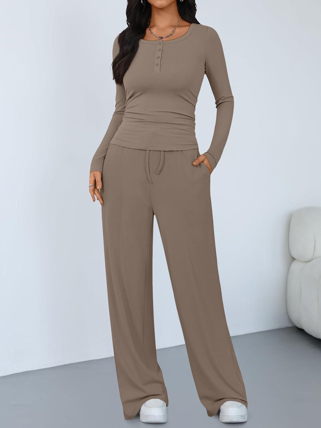 Trendy Queen Women’s 2 Piece Matching Lounge Sets Long Sleeve Henley Neck Slightly Crop Top Wide Leg Pants Casual Sweat Suit(Mocha)