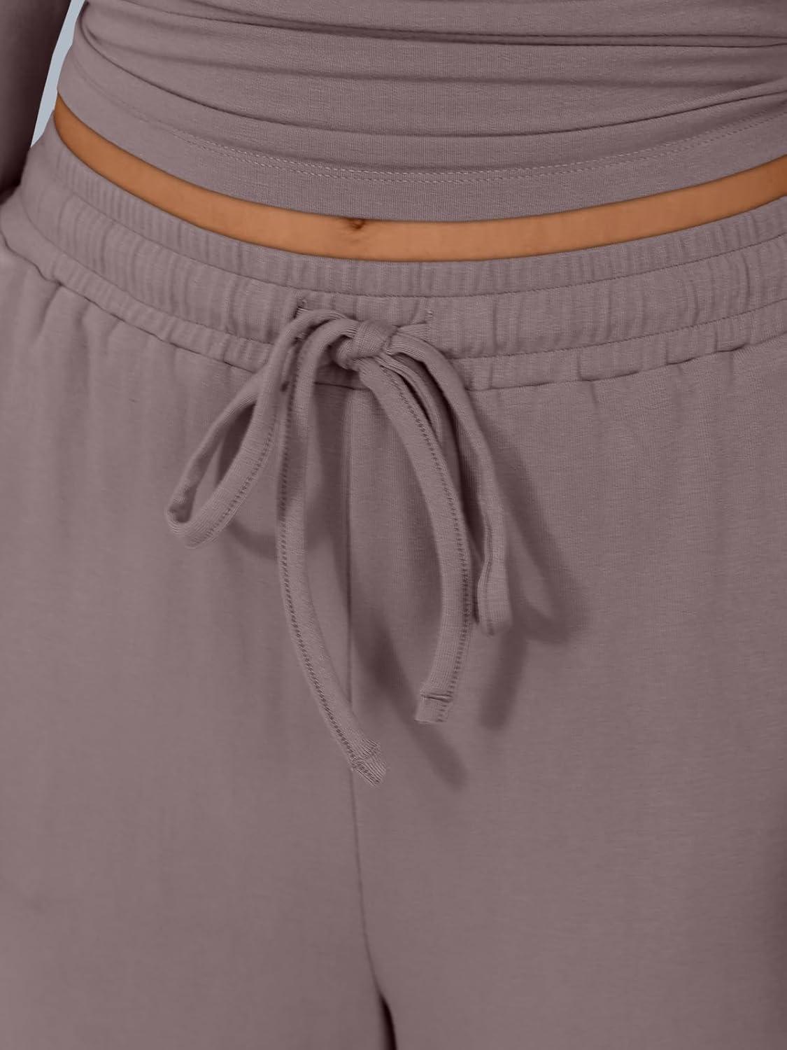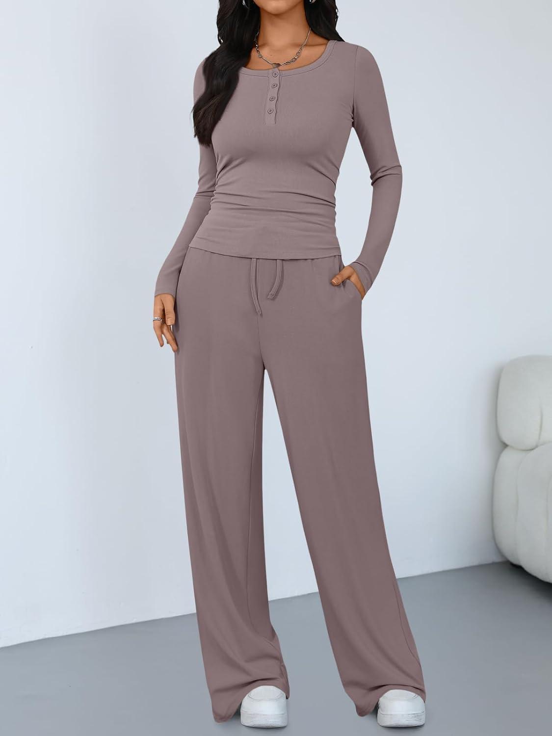 Trendy Queen Women’s 2 Piece Matching Lounge Sets Long Sleeve Henley Neck Slightly Crop Top Wide Leg Pants Casual Sweat Suit(Rose Taupe)