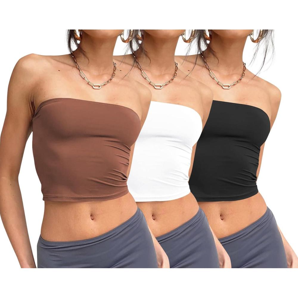 Trendy Queen Womens 3 Pack Tube Tops Crop Going Out Strapless Basic Backless Bandeau Bra Summer Outfits 2026(Black white coffee)