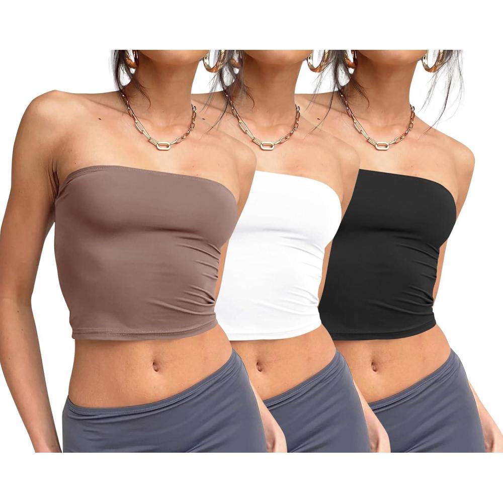 Trendy Queen Womens 3 Pack Tube Tops Crop Going Out Strapless Basic Backless Bandeau Bra Summer Outfits 2026(White black coffee Grey)