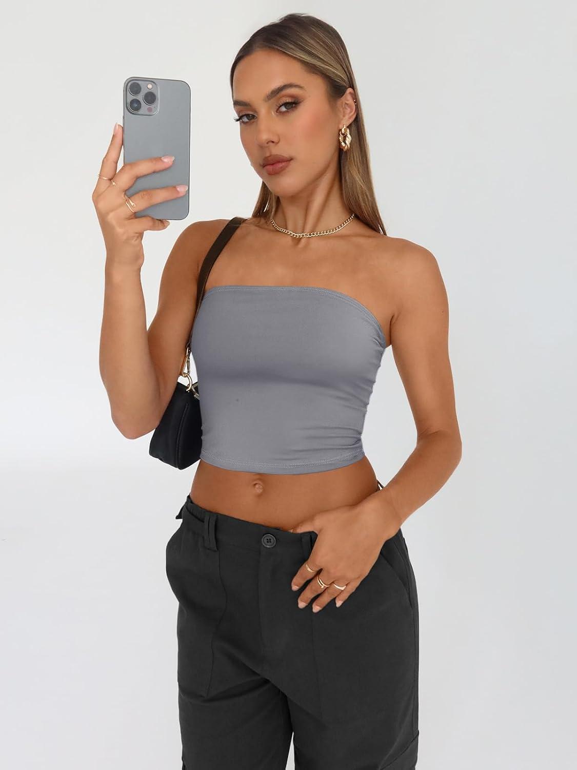 Trendy Queen Womens 3 Pack Tube Tops Crop Going Out Strapless Basic Backless Bandeau Bra Summer Outfits 2026(White black grey)